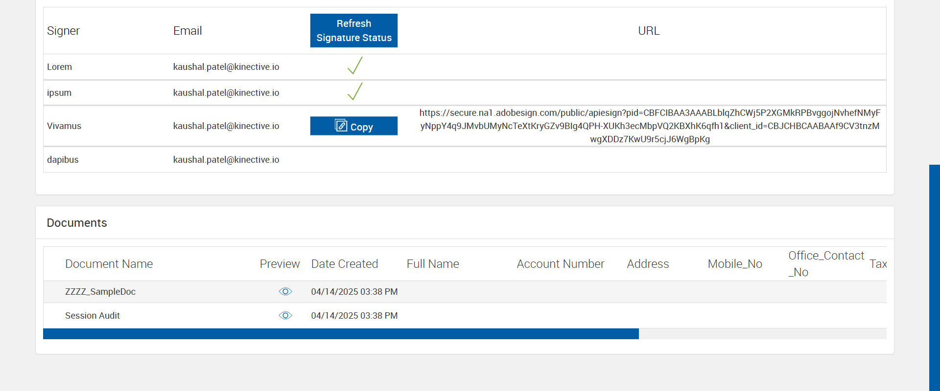 Actual(Passed): Successfully verified 'Signature Status' and 'Documents' sections display in Session Details page[ScreenShot]