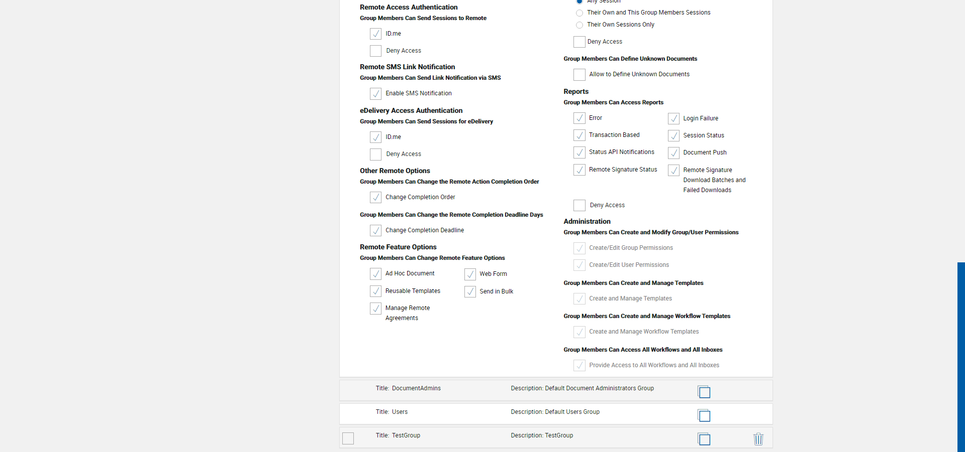 Successfully display Manage Remote Agreements Option [ScreenShot] Successfully verify that Adhoc document check box is checked [ScreenShot] Successfully verify that Reusable Template check box is checked [ScreenShot] Successfully verify that Manage Remote Agreement check box is checked [ScreenShot] Successfully verify that Web Forms check box is checked [ScreenShot] Successfully verify that Send In Bulk check box is checked [ScreenShot] --- 15 Jan 19:38:38 535 - Page URL:: https://esignplusqa.immesign.com/teaasp/groupmaintenance