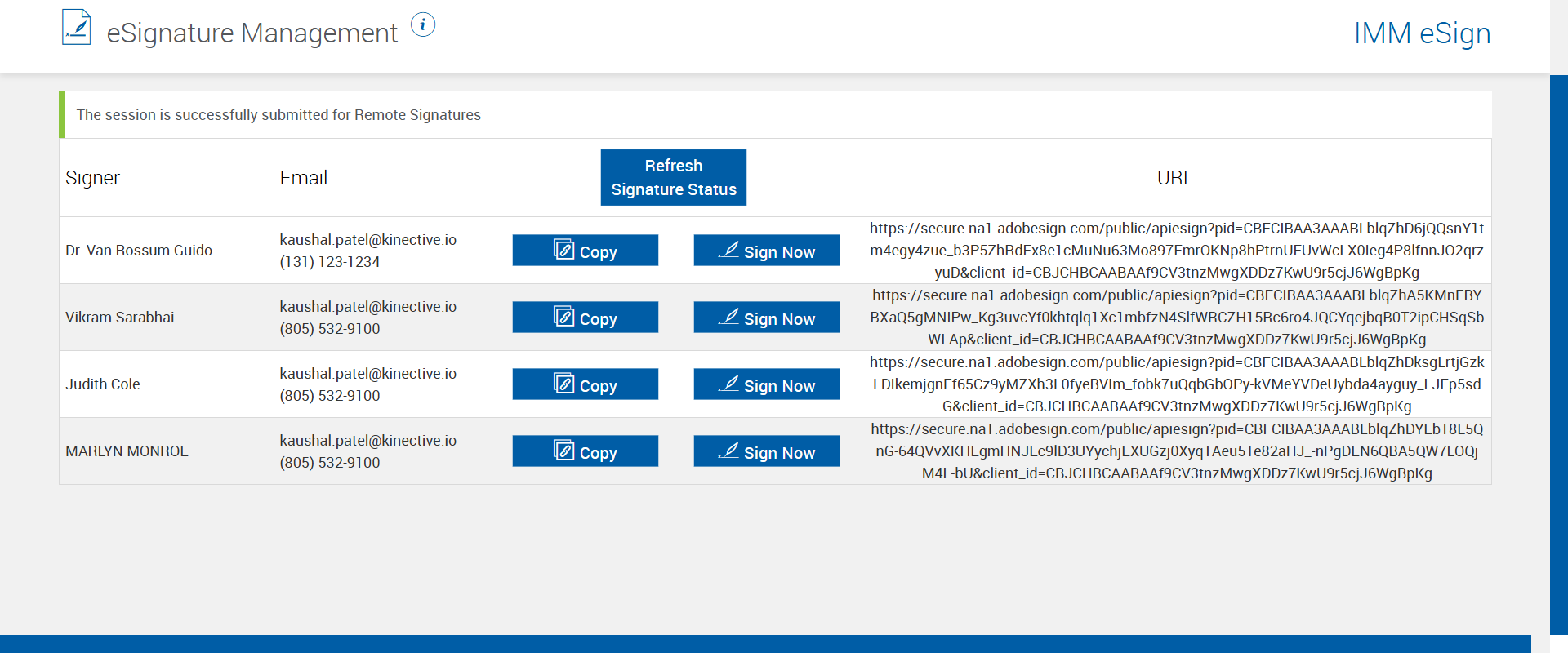 Actual(Passed): Verified 'Copy' and 'Sign Now' button displayed in eSignature Management page for the party - 1[ScreenShot]