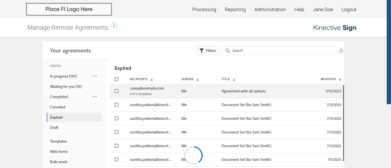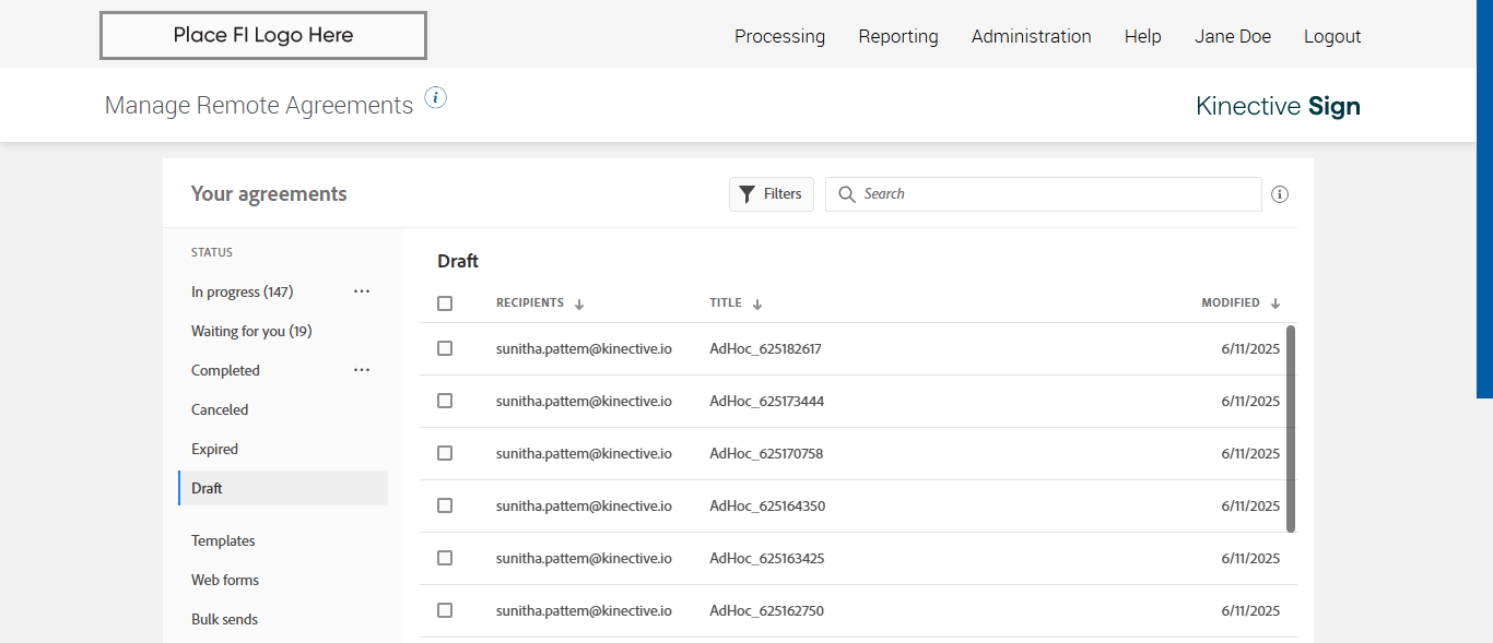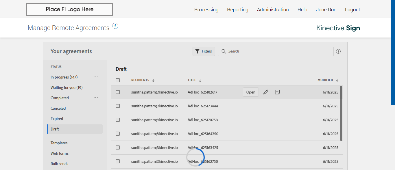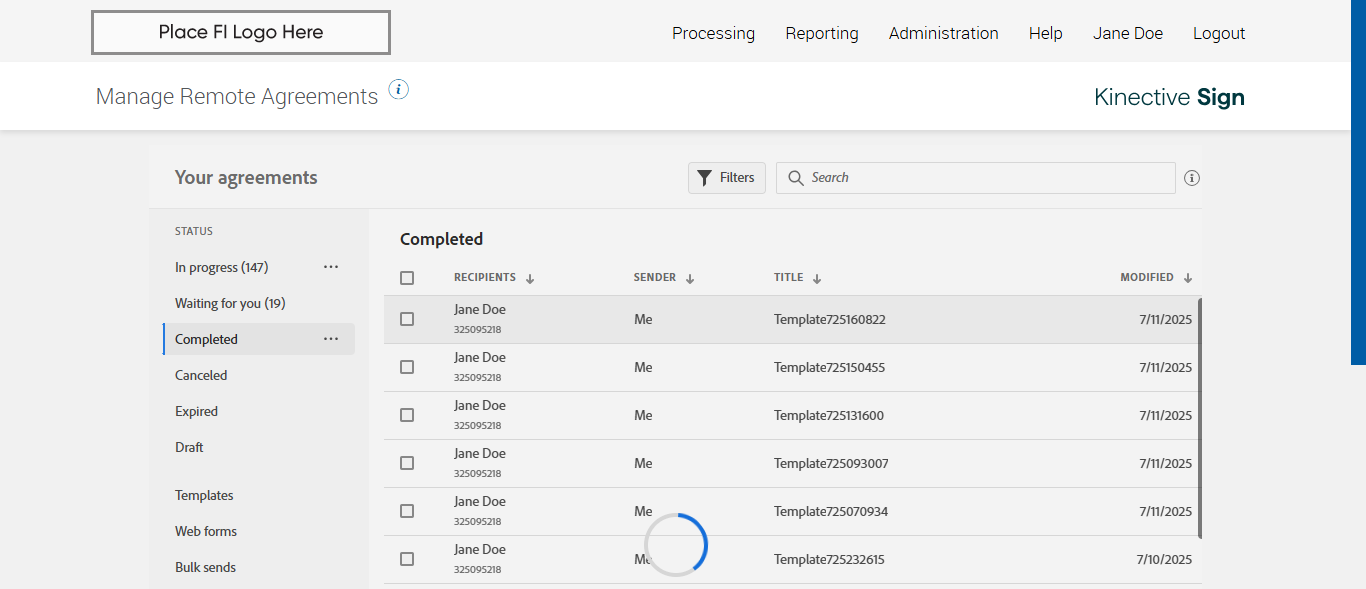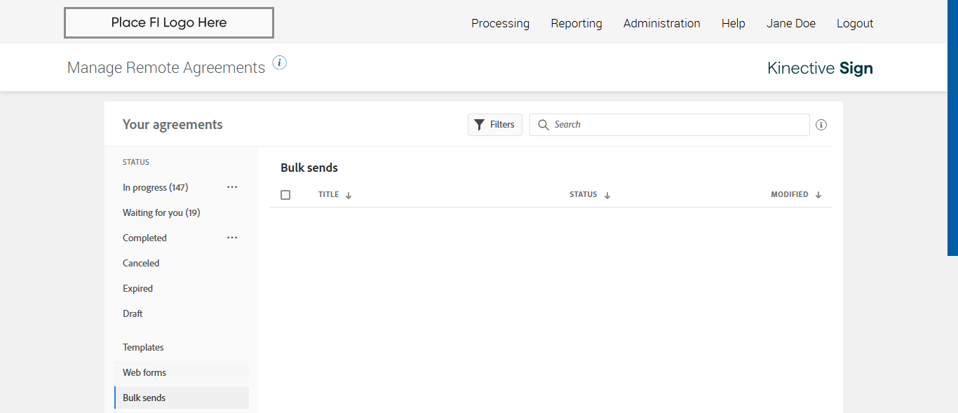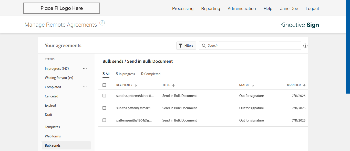| 07:08:34 pm | Expected: Manage Remote Agreement page displayed successfully and Bulk sends status is displayed Actual(Passed): Successfully displyed status Bulk sends [ScreenShot] |