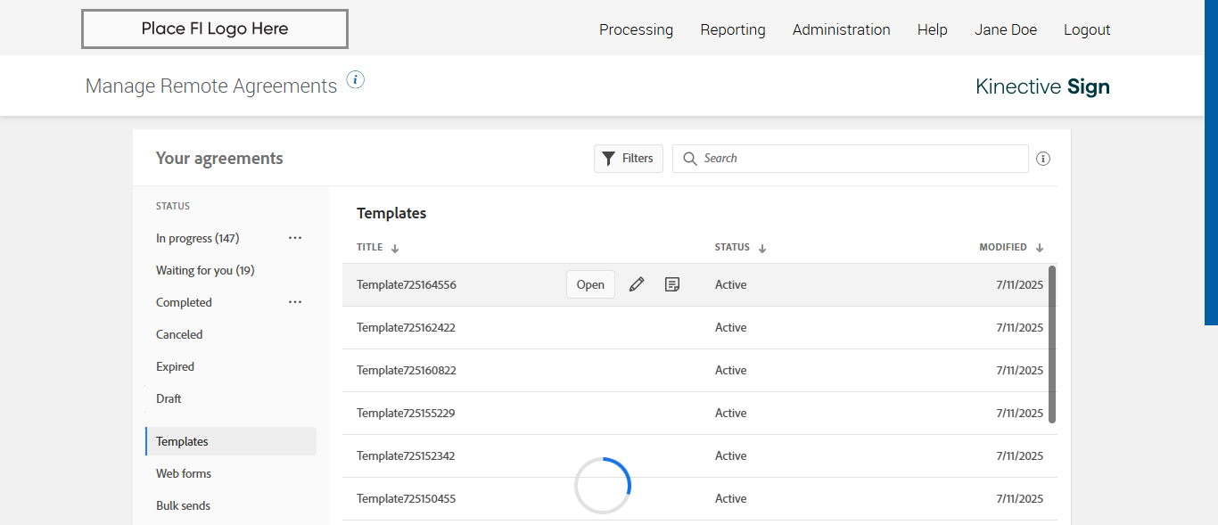 | 07:08:09 pm | Expected: Manage Remote Agreement page displayed successfully and Templates status is displayed Actual(Passed): Successfully displyed status Templates [ScreenShot] |