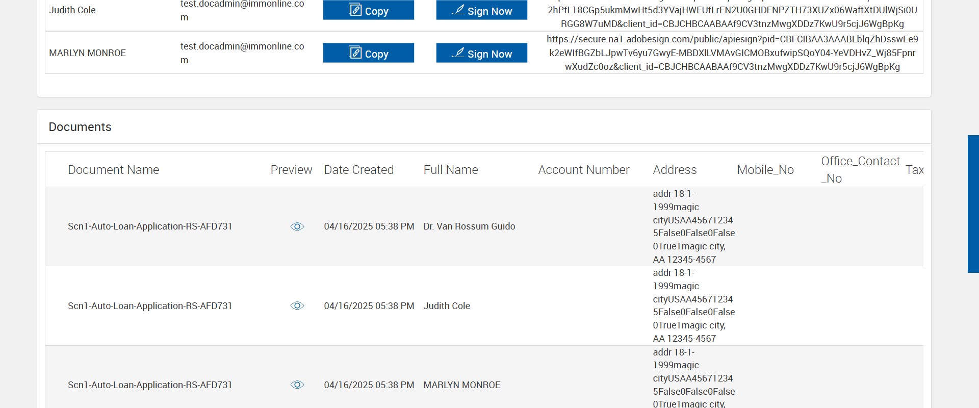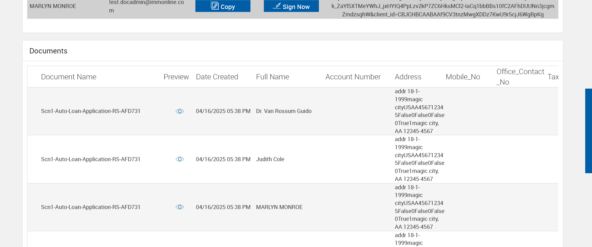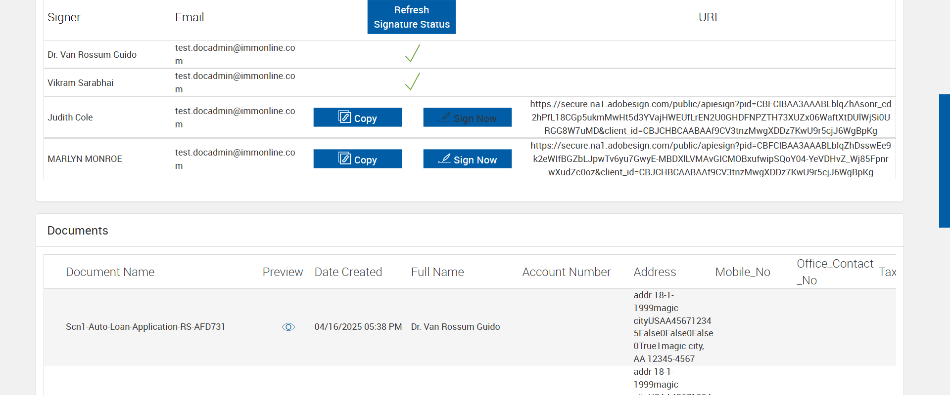 Actual(Passed): Verified 'Copy' and 'Sign Now' buttons displayed in eSignature Management page for the party - 4[ScreenShot]