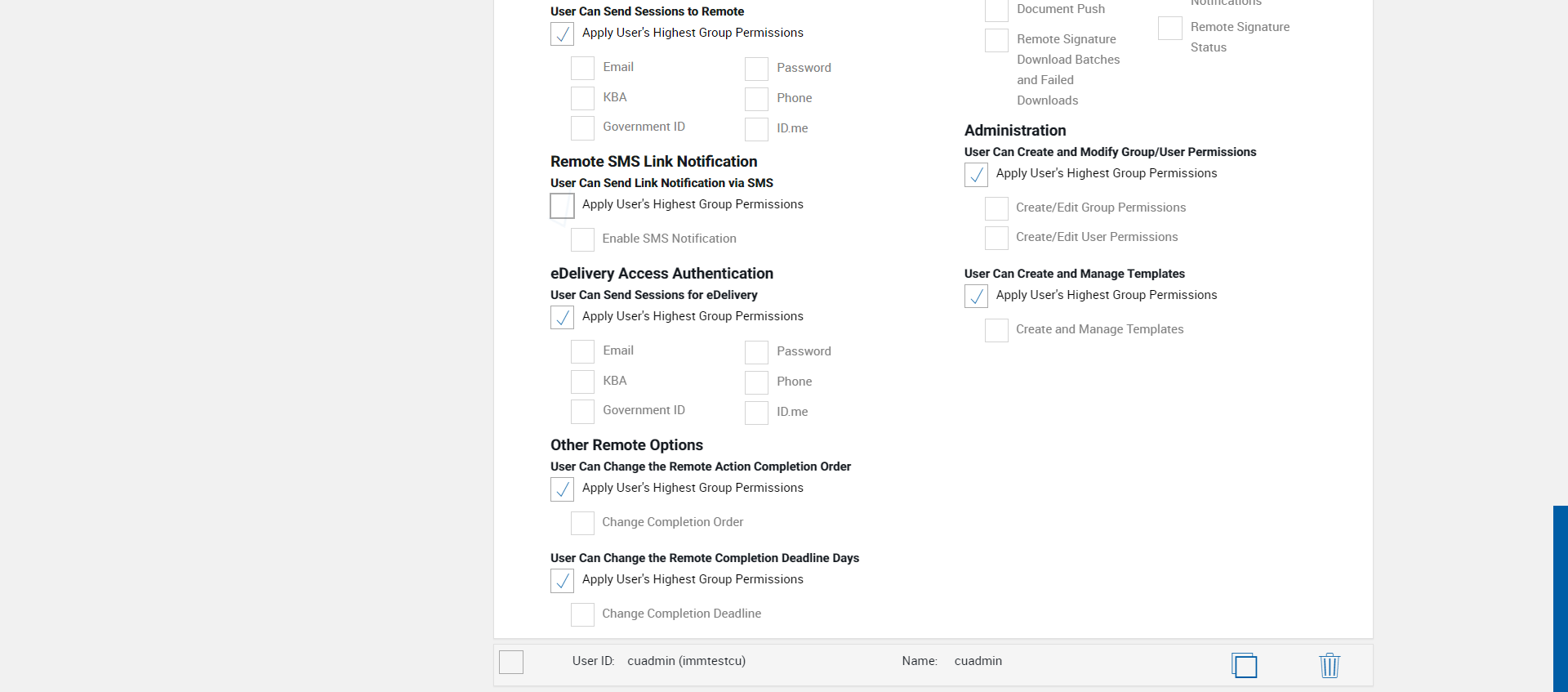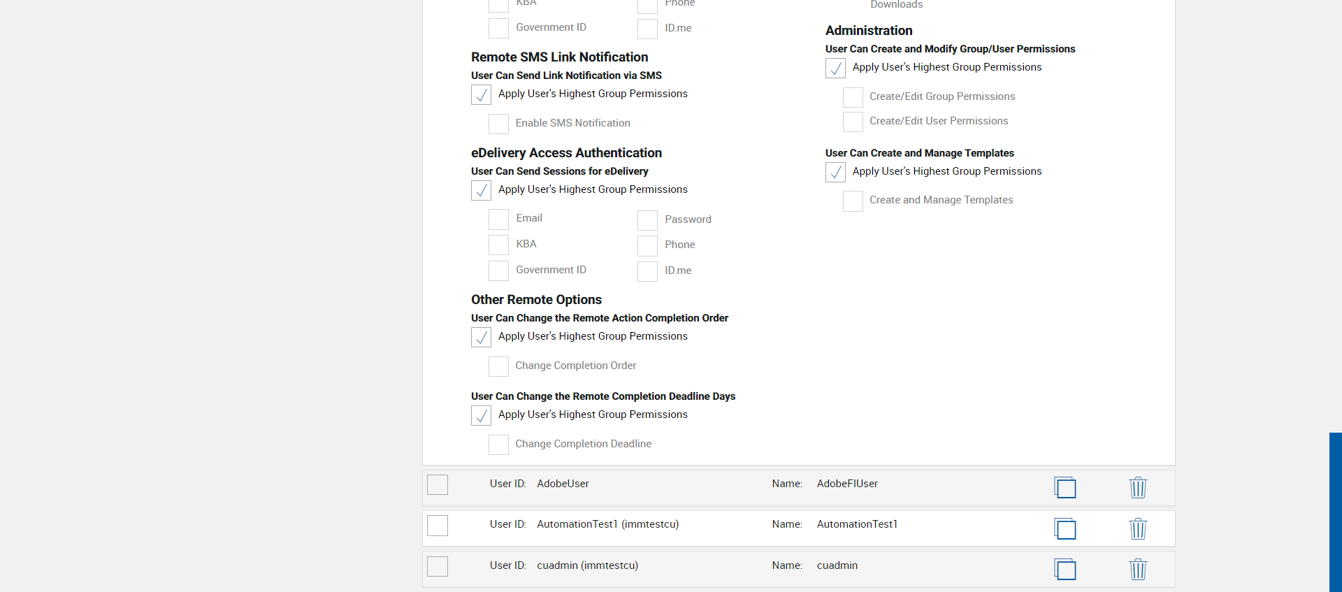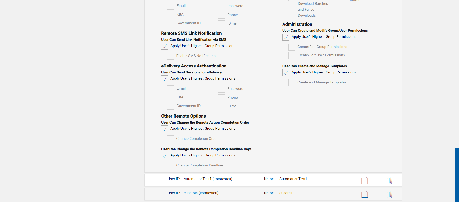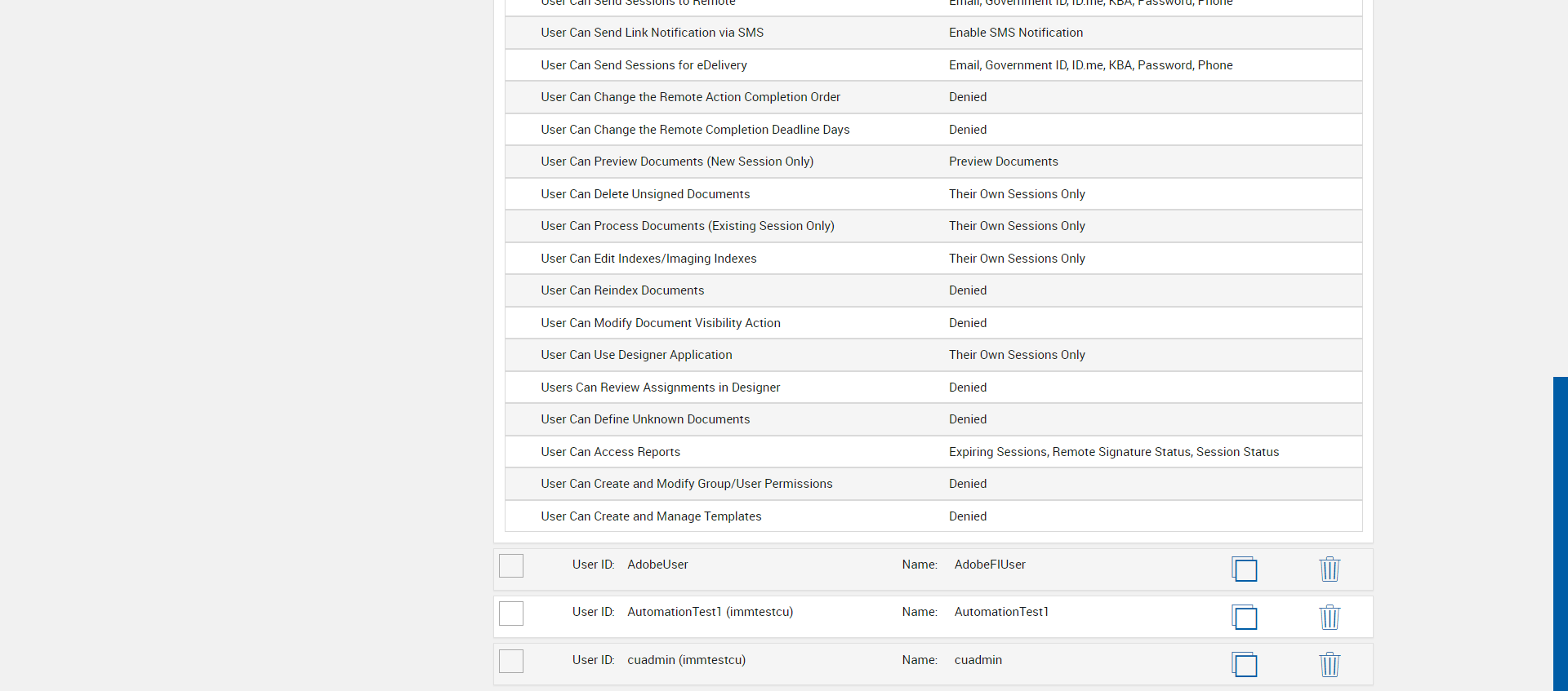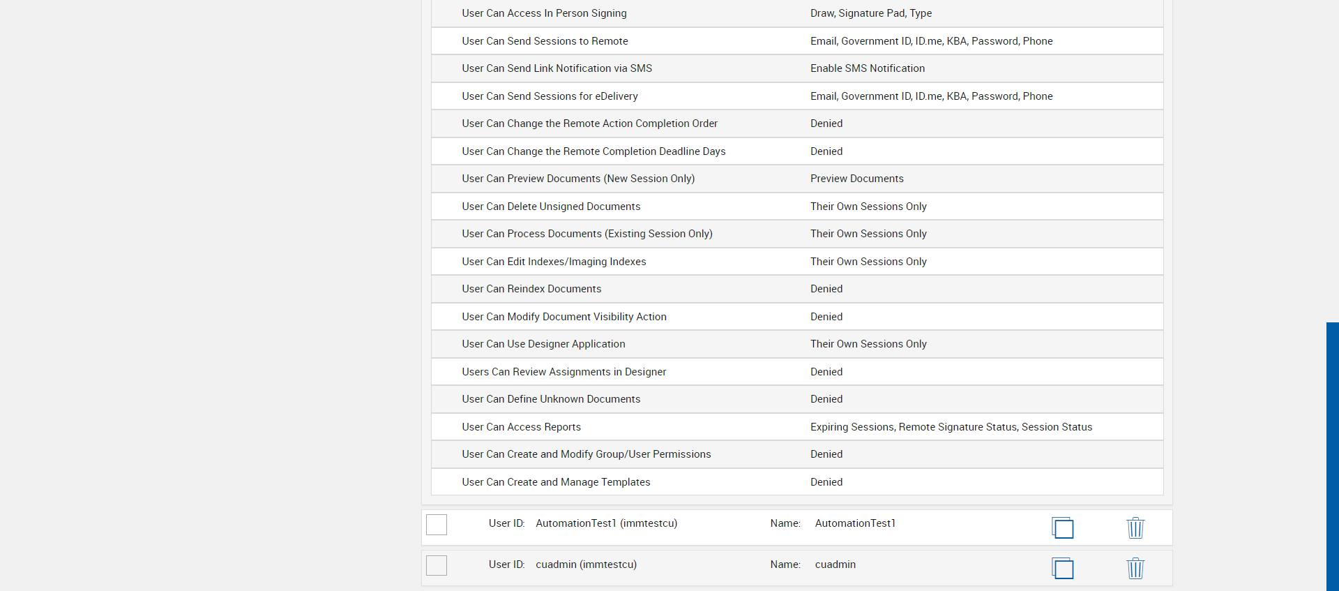 | {NewGroup=, Tenant_URL=, Tenant_User=, Group=Administrators,Session,Users, EmailID=test.docadmin@immonline.com, FI_Name=, Description=verify Copy Custom User with Multiple Groups, Login_User_ID=, Address=, SearchUser=, Add_Dictionary=, GRP_PermissionRadio=, Filepath=, Effect_Summary=User Can Search and View Active Sessions,Any Session;User Can Unlock Sessions,Any Session;User Can Transfer Sessions,Any Session;User Can Delete Unsigned Sessions,Denied;User Can Delete Signed Sessions,Denied;User Can Archive Sessions,Any Session;User Can Search and View Completed Sessions,Any Session;User Can Add Documents/Attachments to Sessions,Any Session;User Can Access In Person Signing,Draw, Signature Pad, Type;User Can Send Sessions to Remote,Email, Government ID, KBA, Password, Phone;User Can Send Sessions for eDelivery,Email, Government ID, KBA, Password, Phone;User Can Change the Remote Action Completion Order,Change Completion Order;User Can Change the Remote Completion Deadline Days,Change Completion Deadline;User Can Preview Documents (New Session Only),Preview Documents;User Can Delete Unsigned Documents,Any Session;User Can Process Documents (Existing Session Only),Any Session;User Can Edit Indexes/Imaging Indexes,Any Session;User Can Reindex Documents,Allow to Reindex;User Can Modify Document Visibility Action,Denied;User Can Use Designer Application,Any Session;Users Can Review Assignments in Designer,Denied;User Can Define Unknown Documents,Allow to Define Unknown Documents;User Can Access Reports,Audit, Document Push, Error, Expiring Sessions, Login Failure, Remote Signature Download Batches and Failed Downloads, Remote Signature Status, Session Status, Status API Notifications, Transaction Based;User Can Process Starter Checks,Starter Checks;User Can Process Loan Coupons,Loan Coupons;User Can Run Starter Checks Report,Any Session;User Can Run Loan Coupons Report,Any Session;User Can Create and Modify Group/User Permissions,Create/Edit Group Permissions, Create/Edit User Permissions;User Can Create and Manage Templates,Create and Manage Templates, Name=Tom Peter, GRP_PermissionChkBox=, NewUser_ID=, TestID=verifyCopyUSerWithMultipleGroups, Dictionary_Code=, IndexSource=, PartiesToView=, Access_Password=P@ssword1, NewName=Emily_Bob;Tom Peter, Confirm_Reset_Password=Password1, User_ID=TomPeter, Notes=, Reset_Password=Password1, Path=, Copy_User_ID=Emily_CP;Tom_GP, Tenant_Password=, NewDescription=, Enter_eSignClient=, ZipCode=, FI_ID=, City=, Delete_Dictionary=, AttachmentTypeOption=, Confirm_Password=P@ssword1, Tab=, NewEmailID=, State=, Login_Password=, UserURL=, eSignClient=%InstallPath%\Output;;;20;Internet Explorer;T;5, Domain=test, UserType=Custom, Copy_Tab=} |