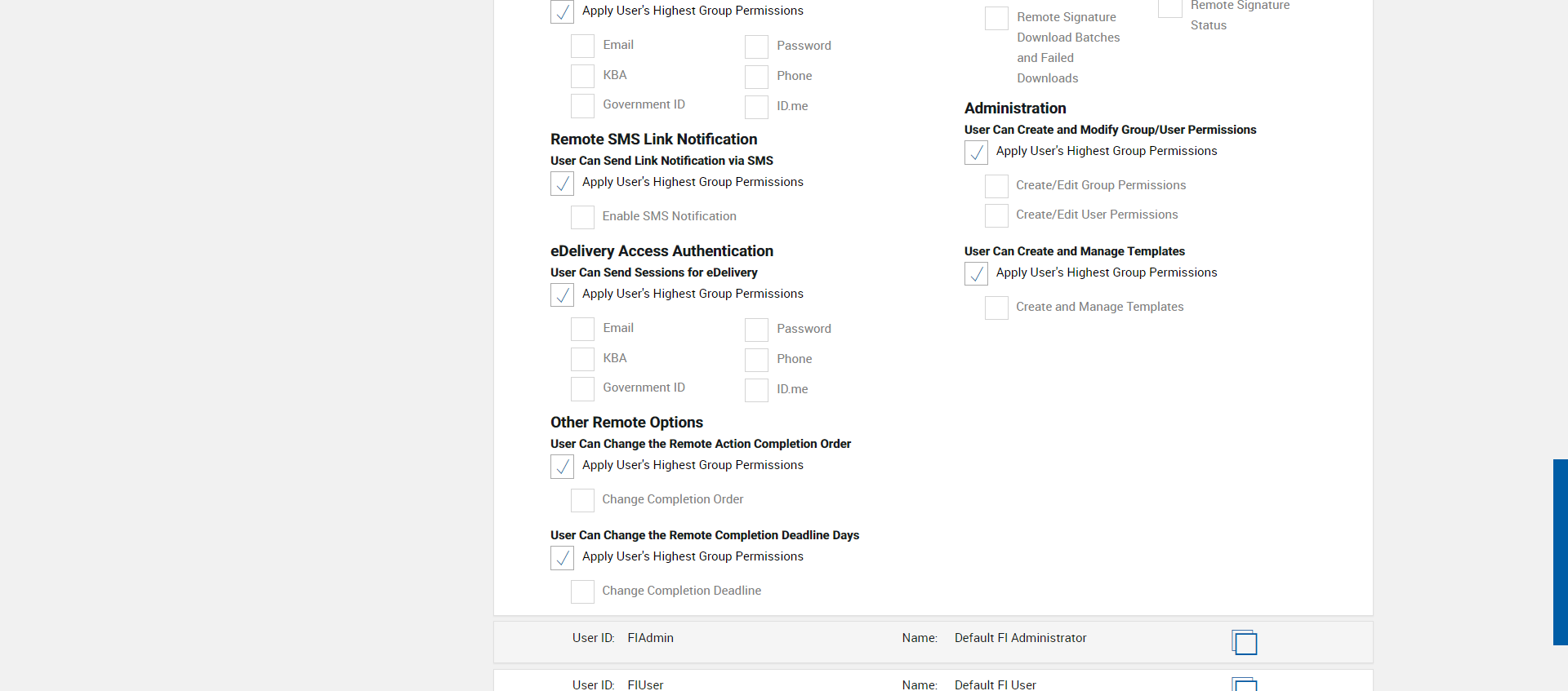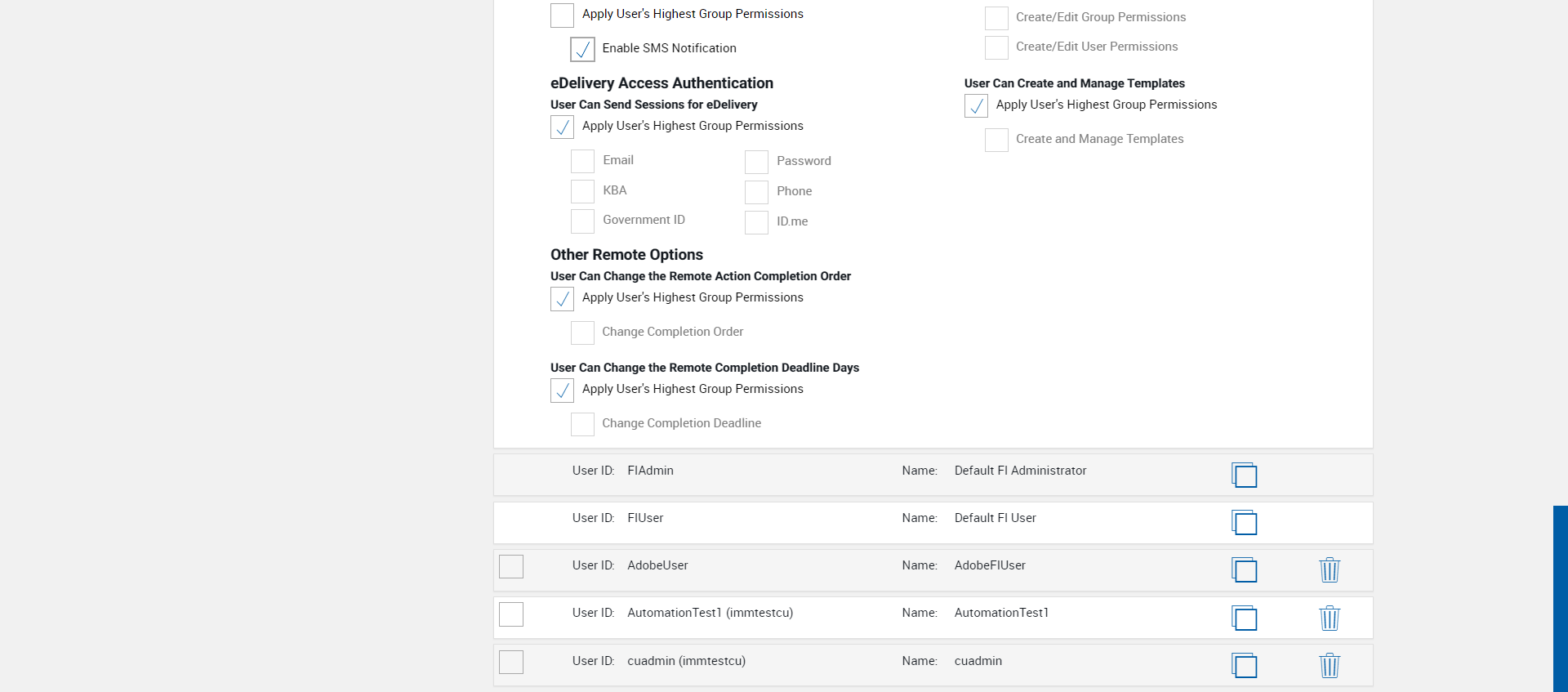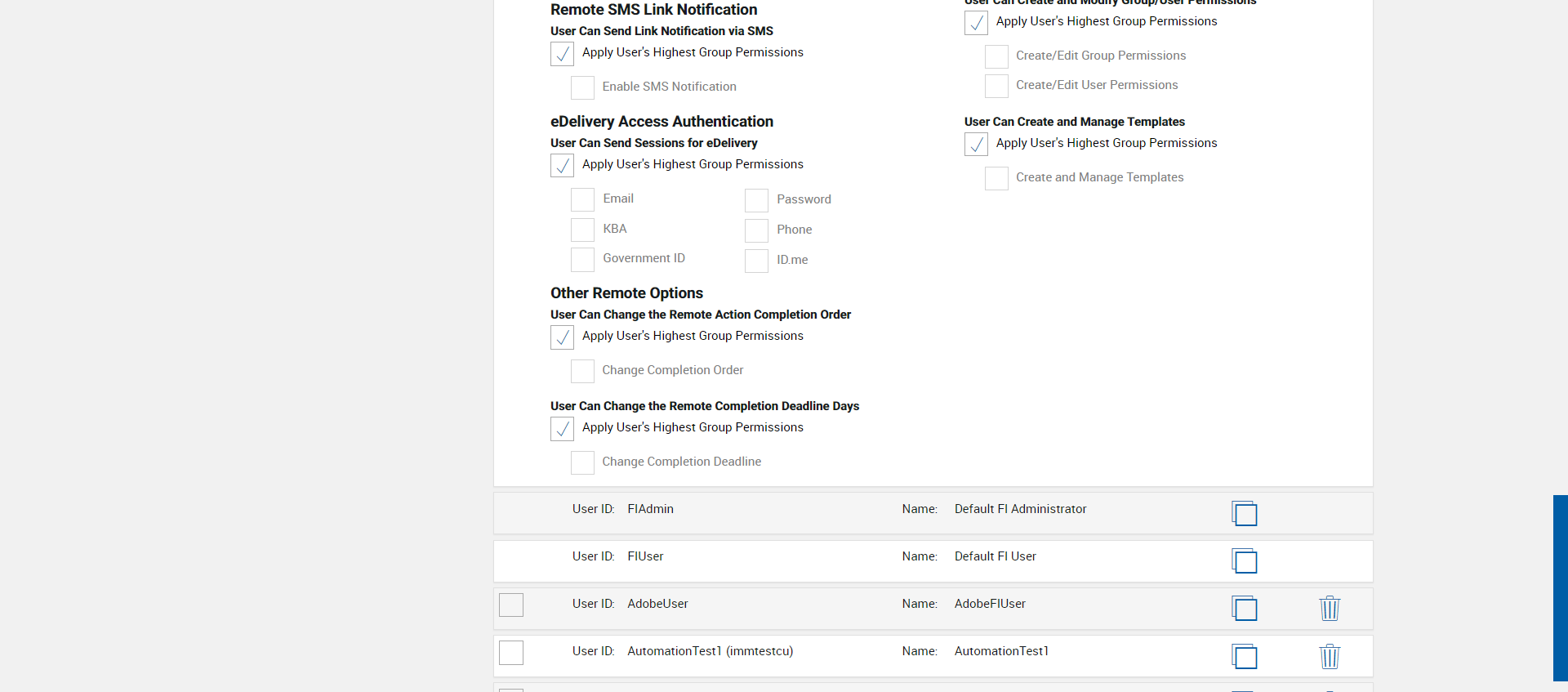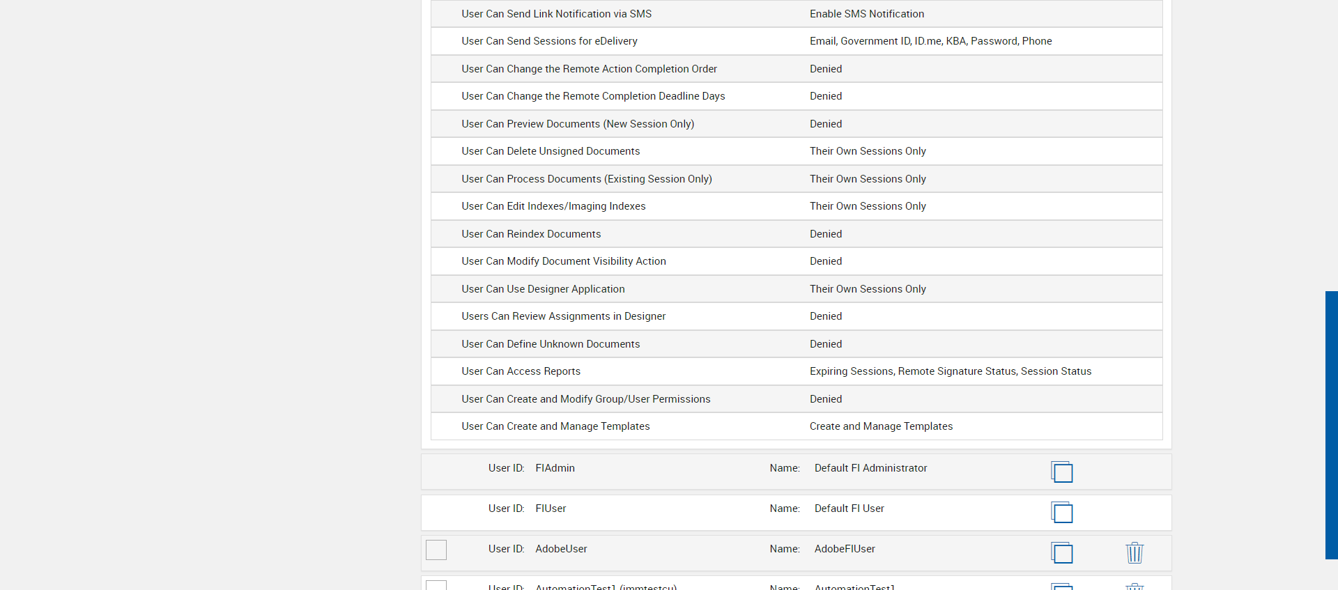| {NewGroup=, Tenant_URL=, Tenant_User=, Group=Users, EmailID=test.docadmin@immonline.com, FI_Name=, Description=verify Copy FI User with eSign Client, Login_User_ID=, Address=, SearchUser=, Add_Dictionary=, GRP_PermissionRadio=, Filepath=, Effect_Summary=User Can Search and View Active Sessions,Their Own Sessions Only;User Can Unlock Sessions,Their Own Sessions Only;User Can Transfer Sessions,Their Own Sessions Only;User Can Delete Unsigned Sessions,Denied;User Can Delete Signed Sessions,Denied;User Can Archive Sessions,Their Own Sessions Only;User Can Search and View Completed Sessions,Their Own Sessions Only;User Can Add Documents/Attachments to Sessions,Their Own Sessions Only;User Can Access In Person Signing,Draw, Signature Pad, Type;User Can Send Sessions to Remote,Email, Government ID, KBA, Password, Phone;User Can Send Sessions for eDelivery,Email, Government ID, KBA, Password, Phone;User Can Change the Remote Action Completion Order,Denied;User Can Change the Remote Completion Deadline Days,Denied;User Can Preview Documents (New Session Only),Preview Documents;User Can Delete Unsigned Documents,Their Own Sessions Only;User Can Process Documents (Existing Session Only),Their Own Sessions Only;User Can Edit Indexes/Imaging Indexes,Their Own Sessions Only;User Can Reindex Documents,Denied;User Can Modify Document Visibility Action,Denied;User Can Use Designer Application,Their Own Sessions Only;Users Can Review Assignments in Designer,Denied;User Can Define Unknown Documents,Denied;User Can Access Reports,Expiring Sessions, Remote Signature Status, Session Status;User Can Process Starter Checks,Starter Checks;User Can Process Loan Coupons,Loan Coupons;User Can Run Starter Checks Report,Their Own Sessions Only;User Can Run Loan Coupons Report,Their Own Sessions Only, Name=Default FI User, GRP_PermissionChkBox=, NewUser_ID=, TestID=verifyCopyUSerWitheSignClientTab, Dictionary_Code=, IndexSource=, PartiesToView=, Access_Password=P@ssword1, NewName=Emily_Bob;Tom Peter, Confirm_Reset_Password=Password1, User_ID=FIUser, Notes=, Reset_Password=Password1, Path=, Copy_User_ID=Emily_CP;Tom_GP, Tenant_Password=, NewDescription=, Enter_eSignClient=, ZipCode=, FI_ID=, City=, Delete_Dictionary=, AttachmentTypeOption=, Confirm_Password=P@ssword1, Tab=, NewEmailID=, State=, Login_Password=, UserURL=, eSignClient=%InstallPath%\Output;;;20;Internet Explorer;T;5, Domain=test, UserType=Default, Copy_Tab=} |