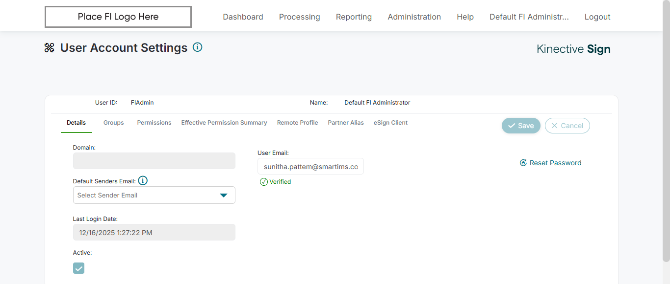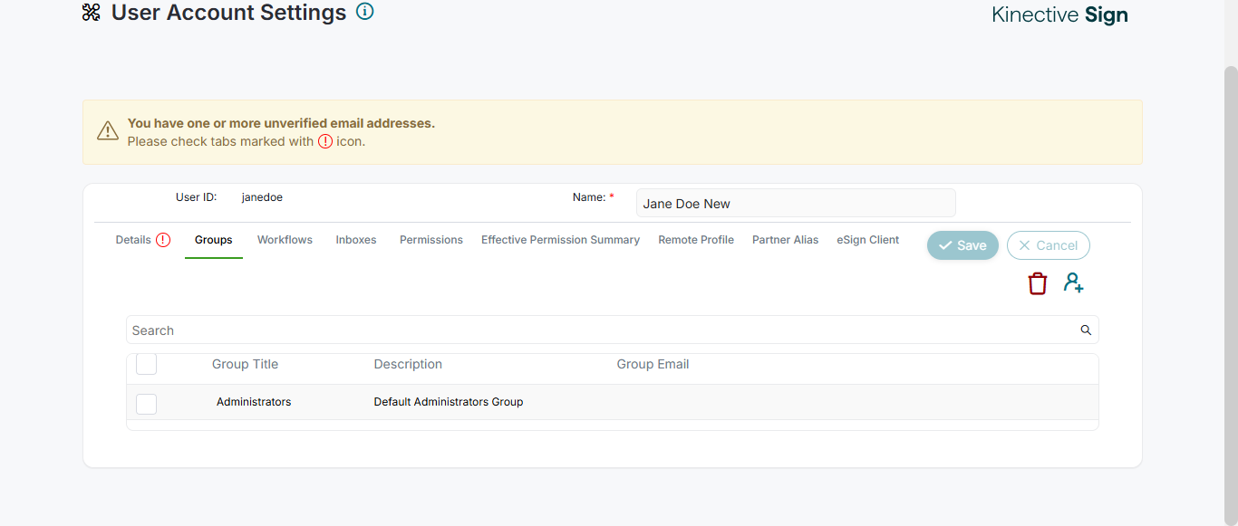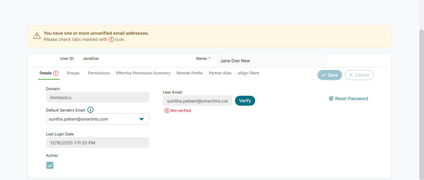 Actual(Passed): ✅Successfully verified Email verification banner is displayed in User Account Settings page when user email is blank and group email is not verified for Fully Integrated FI[ScreenShot] Expected: Exclamation mark is not displayed in Details tab when user email is blank for Fully Integrated FI