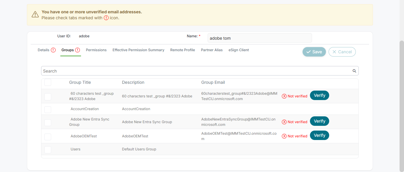 Expected: X Not verified status is displayed when group email is not blank for Group AdobeOEMTest