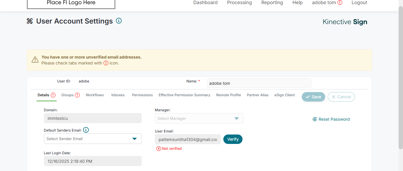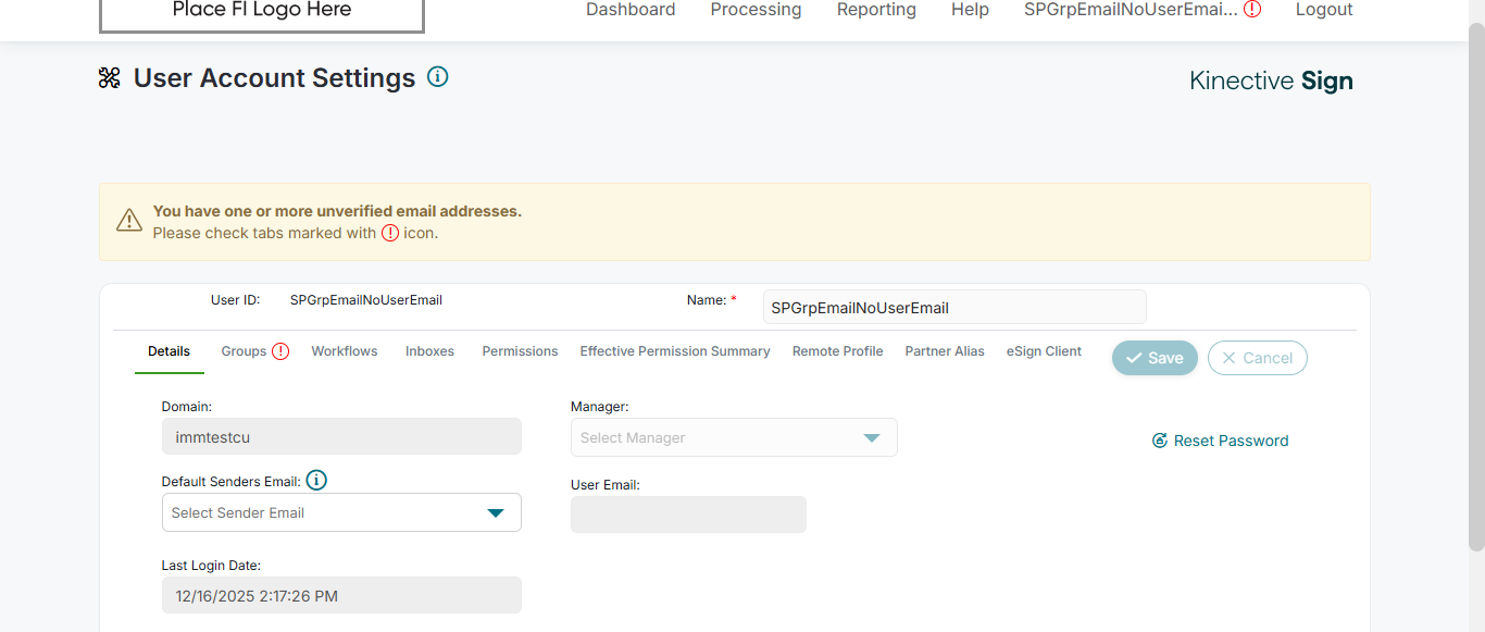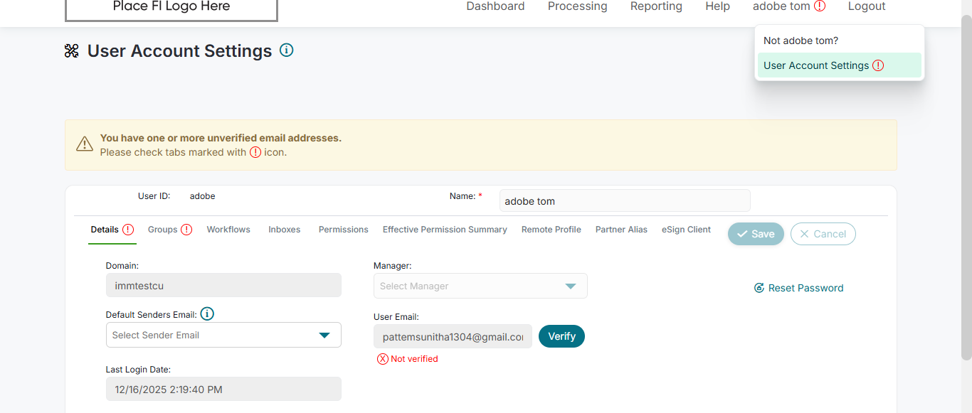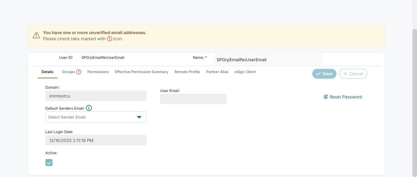 Actual(Passed): ✅Successfully verified Email verification banner is displayed in User Account Settings page when user email is blank and group email is not verified for Fully Integrated FI[ScreenShot] Expected: Exclamation mark is not displayed in Details tab when user email is blank for Fully Integrated FI