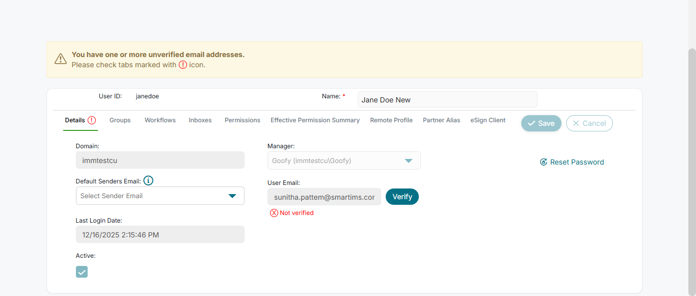 Expected: Exclamation mark is displayed in Details tab when user email is not blank and not verified for Fully Integrated FI