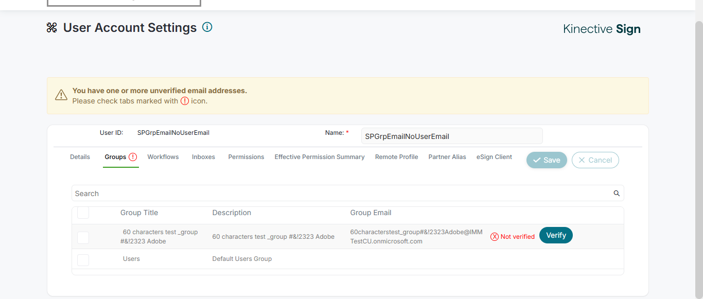 Expected: X Not verified status is displayed when group email is not blank for Group 60 characters test _group #&!2323 Adobe