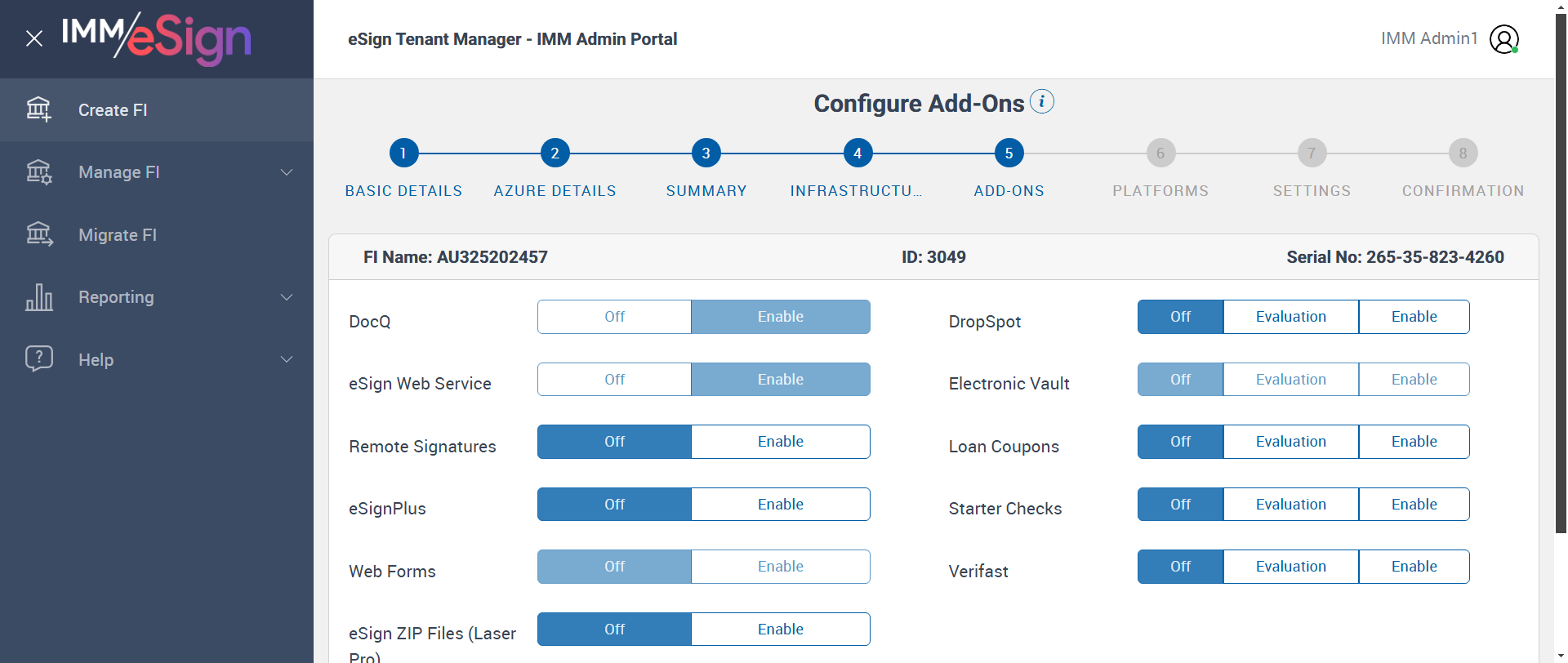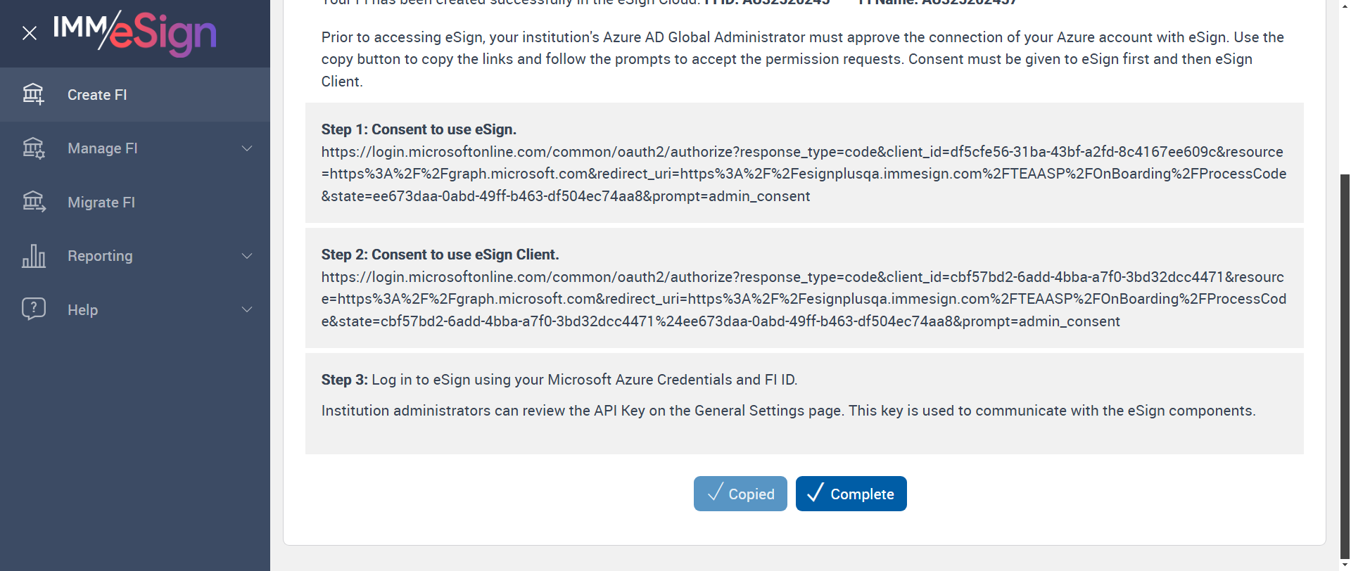 Successfully Configured 'Creating FI Settings' |