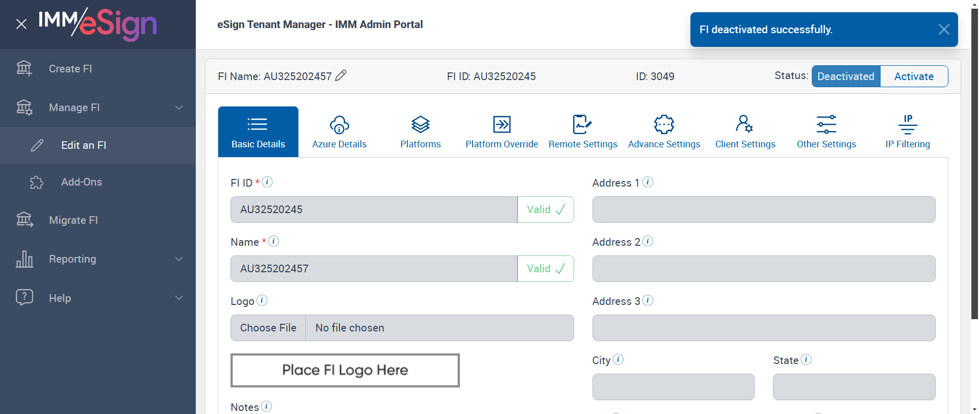 Successfully validated save message FI deactivated successfully. [ScreenShot] |