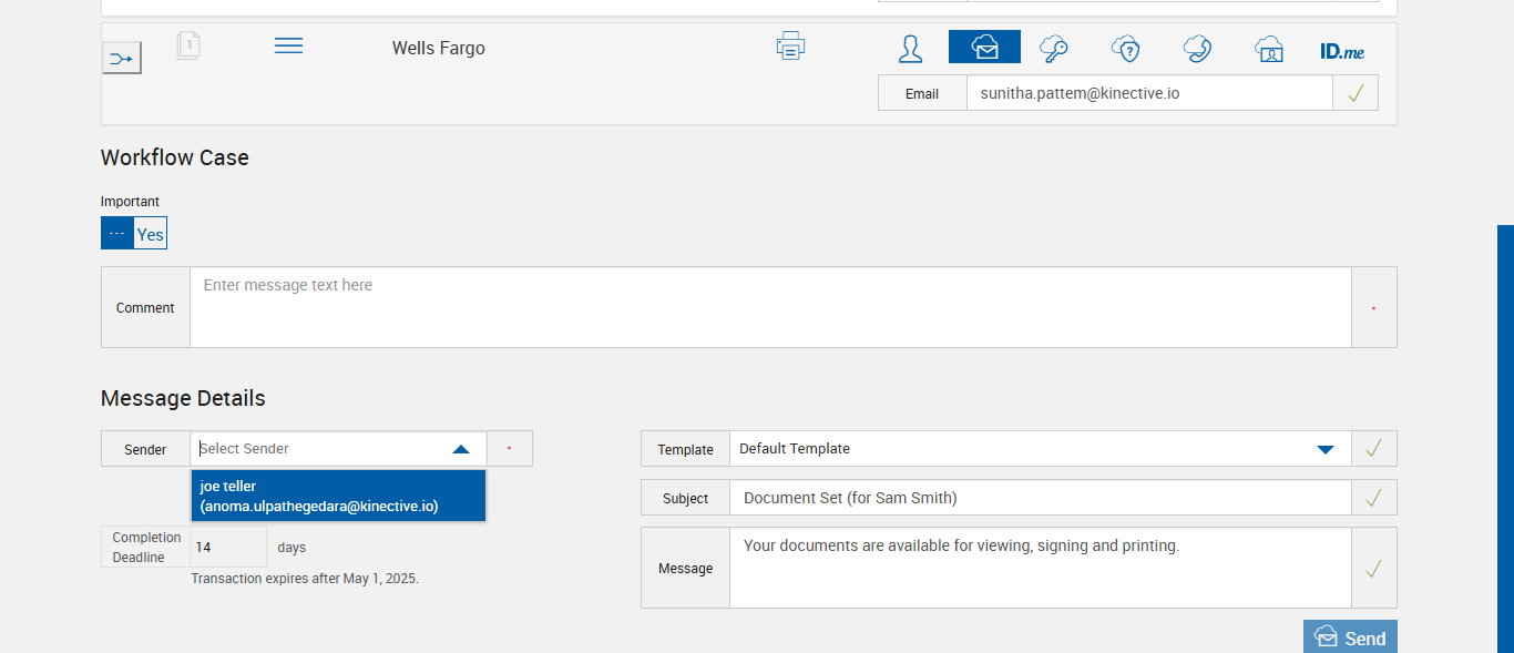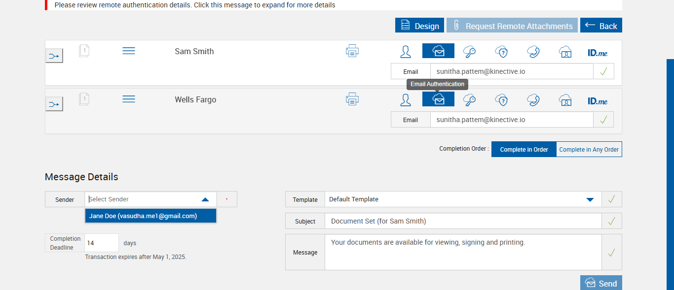 | {Tenant_URL=https://esignnonprod.immesign.com/qa/tenantmanager/, EditFullName=, Email=, Platform=, Sender_Emails=Jane Doe (vasudha.me1@gmail.com),adobe tom (pattemsunitha1304@gmail.com), ShortName=, PartyName=, PartiesToView=, ReceivedFromNames=, TextField=, plusfi=FALSE, DocumentName=LOAN_APPLICATION, Dropdownvalues=, Workflow=, AttachmentTypeOption=, NumOfAttachments=, Folderpath=, NameDescription=, Export_Values=, UserType=Admin,User, Tenant_User=immadmin2@immesignqa.onmicrosoft.com, Group=, Description=verify Sender Email In eSignature Management Page - eSign FI - Fully Integrated, Message=Your documents are available for viewing, signing and printing., FileName=, EditShortName=, Phone_Number=, Step Name=, Filepath=src/main/resources/testdata/files/documentRTS/OptionalSignature.zip,src/main/resources/testdata/files/documentRTS/OptionalSignature.zip,src/main/resources/testdata/files/documentRTS/STUDENTS_LOAN.pdf,src/main/resources/testdata/files/documentRTS/LOAN_APPLICATION.pdf, DocumentPermission=, TestID=verifySenderEmailIneSignatureManagementPage, FItype=Unified, Required=, IndexSource=, Document Names=, Inbox=, Password=, Path=, Tenant_Password=iMM@2022, UserName=, Comments=, Email_Id=sunitha.pattem@kinective.io, Index_Field_Name=, Sender_Email_Id=pattemsunitha1304@gmail.com, FI_ID=AdobeUser, Vendor=, From=, TemplatePermission=, Subject=Adobe-Sender Email -eSign FI -Fully Integrated, Date=, Response=, Type=, AttachmentPath=, Username=janedoe@immtestcu.onmicrosoft.com,adobe@immtestcu.onmicrosoft.com, FullName=STUDENTS_LOAN, EditNameDescription=, ErrorMessage=} |