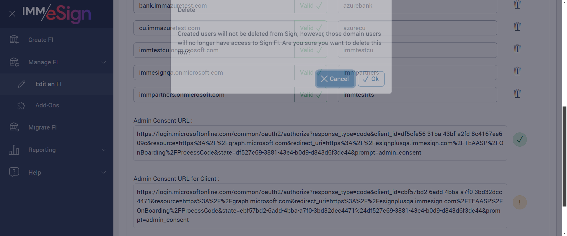Actual(Failed): Failed to verify 'immazuretest.onmicrosoft.com' domain is deleted.[ScreenShot] ------------------- Login with FiAdmin, And delete if 'immazuretest.onmicrosoft.com' user is available in User maintanence page -------------------