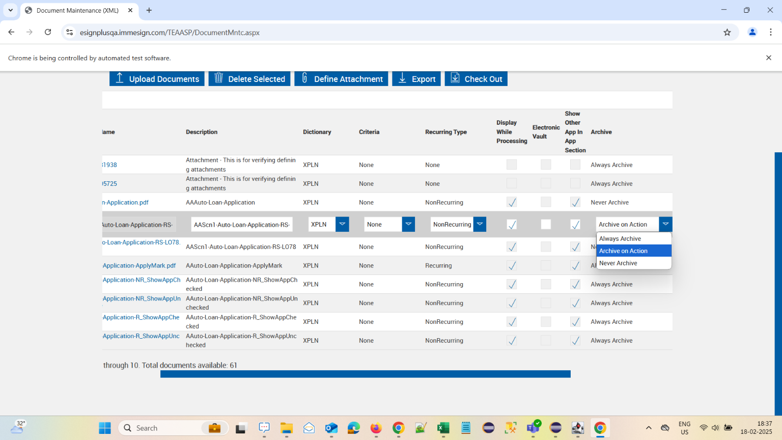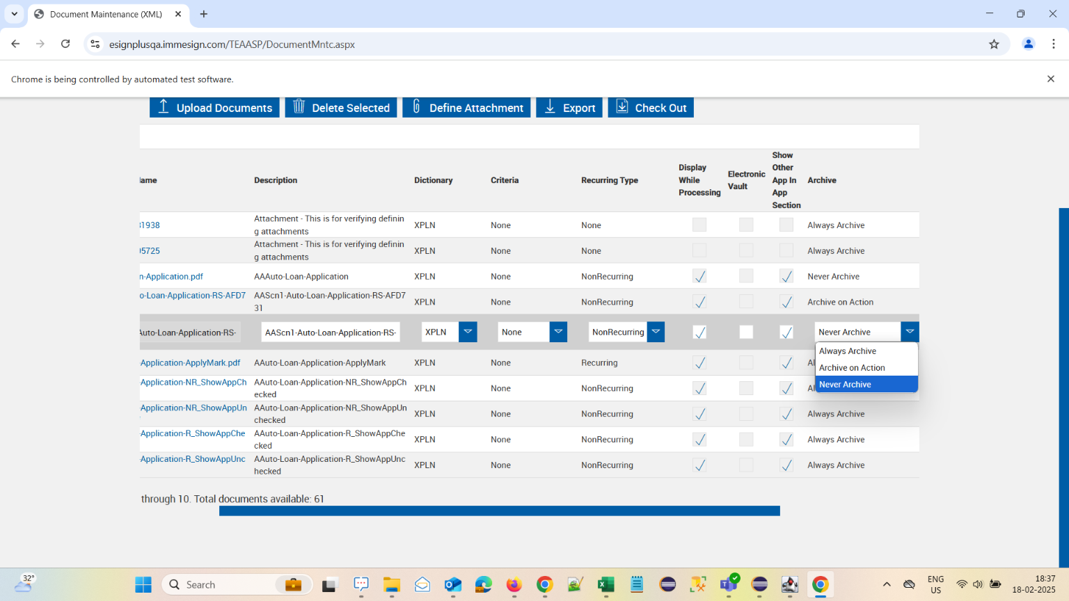 ({Description=verify Archive options are available in Document Maintenance XML Pages, FI=AutoTestFI, AttachmentDescription=AAttachArchive01,AAttachArchive02,AAttachArchive03, Condition_Edit=, DocumentName_Edit=AAAuto-Loan-Application.pdf,AAScn1-Auto-Loan-Application-RS-AFD731.pdf,AAScn1-Auto-Loan-Application-RS-LO78.pdf, SearchKeyword=, TestID=VerifyArchiveOptionsforDocumentMaintenanceXML, docset_doc2=, docset_doc1=, filepath=src/main/resources/testdata/files/configuringfi/AAAuto-Loan-Application.pdf,src/main/resources/testdata/files/configuringfi/AAScn1-Auto-Loan-Application-RS-AFD731.pdf,src/main/resources/testdata/files/configuringfi/AAScn1-Auto-Loan-Application-RS-LO78.pdf, DocumentDescription_Edit=, PartiesToView=, AttachmentName=AAttachArchive01,AAttachArchive02,AAttachArchive03, FieldNametoSearch=, CriteriaName=, Template_Description=, DocSetName=A_DocSet05, DocumentName=AAuto-Loan-Application-ApplyMark.pdf, Password=iMM@2022, DictionaryOption=XPLN, Condition=, CriteriaName_Edit=, Criteria_Description_Edit=, Template_Name=, KeepUnlock=, SearchDictionary=, Criteria_Description=, Template_Platform=, DocumentDescription=, Username=cuadmin@immtestcu.onmicrosoft.com})