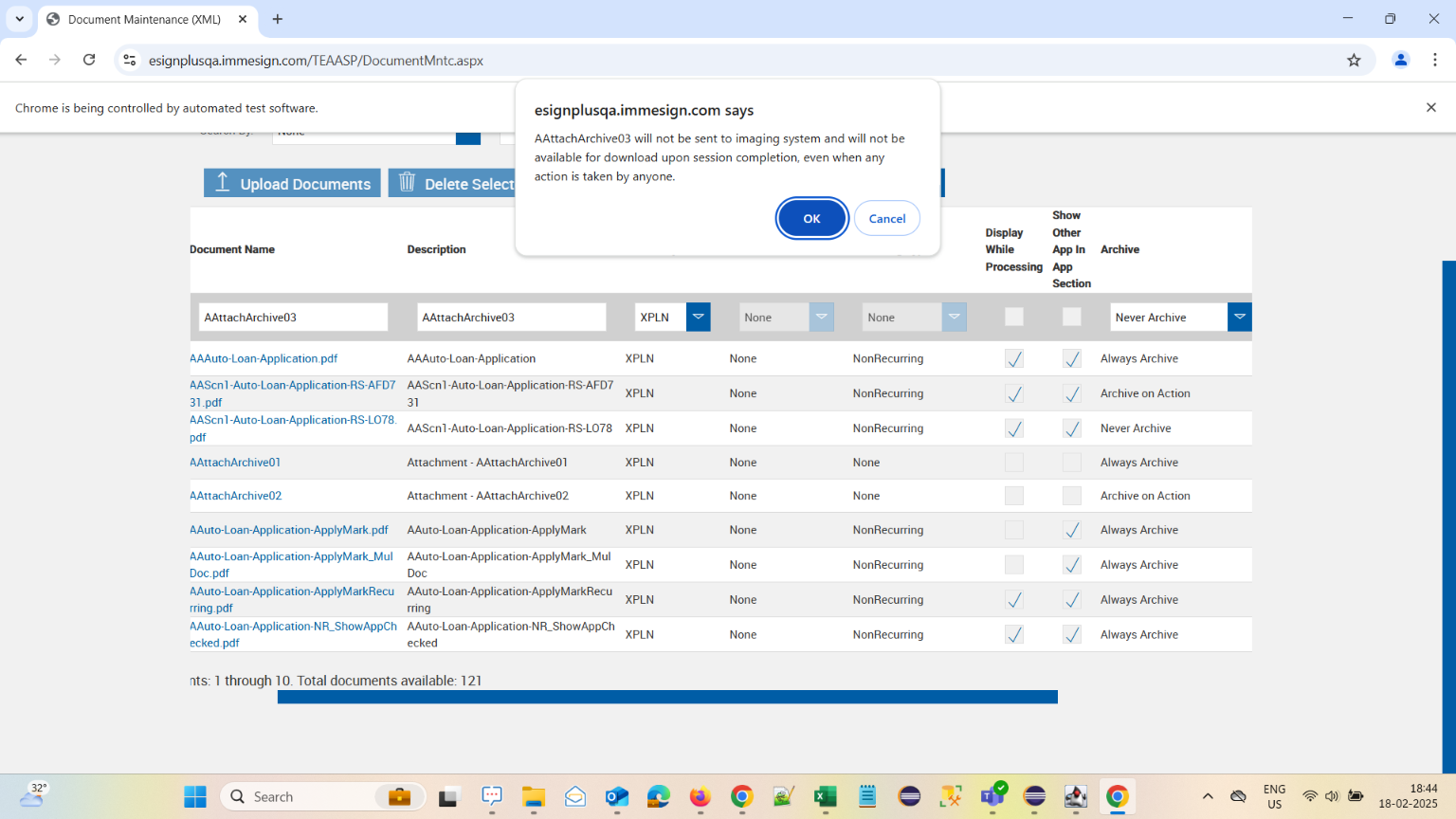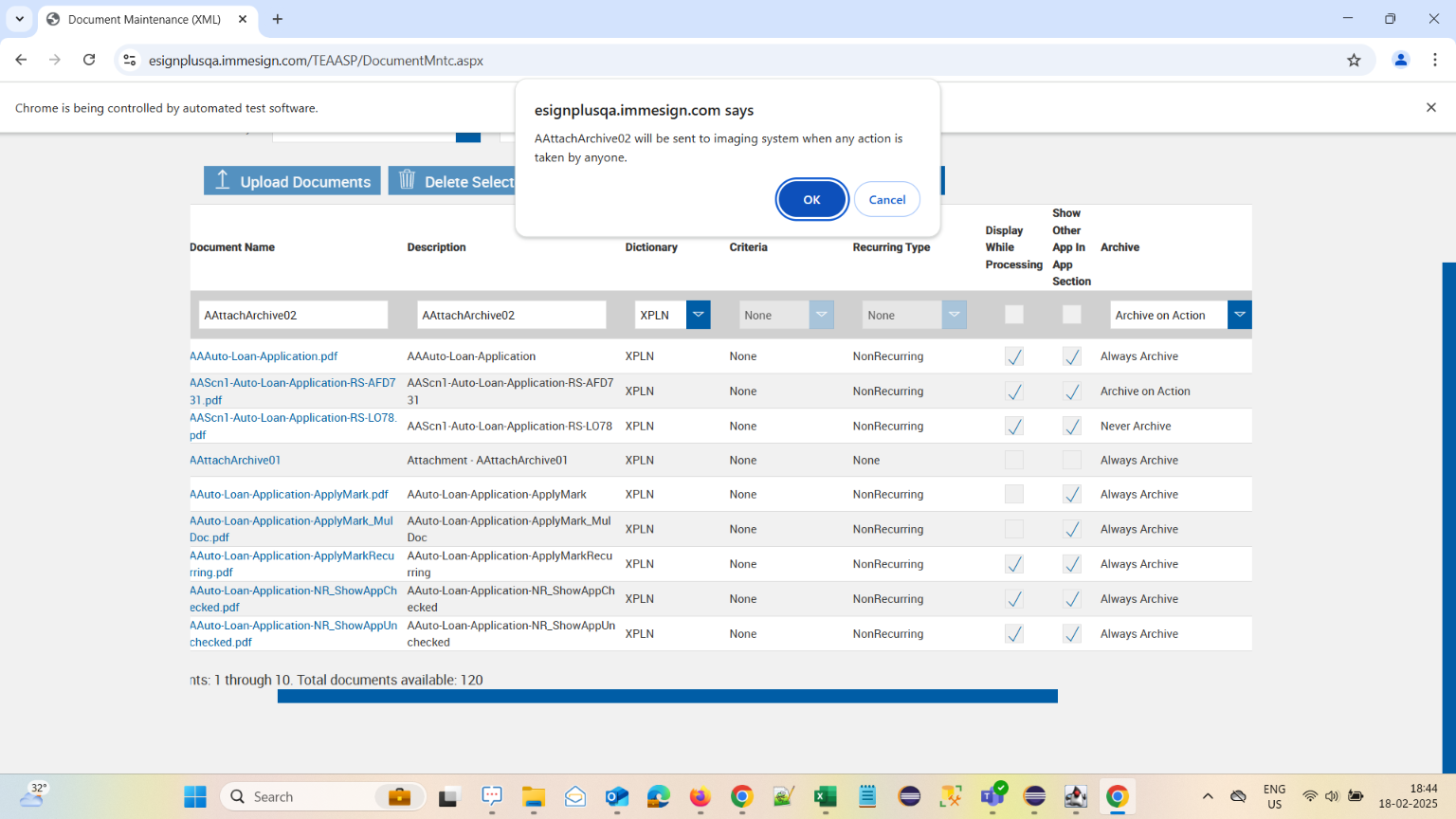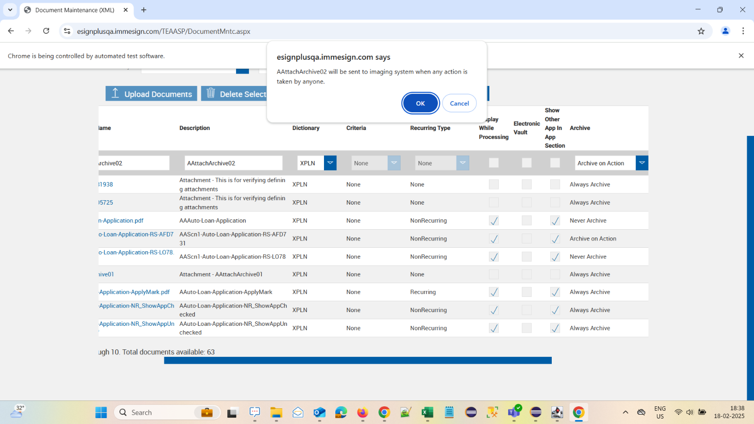 Warning Message for Archive on Action is verified on Document Maintenance XML page [ScreenShot]