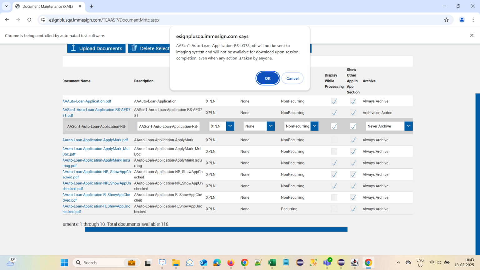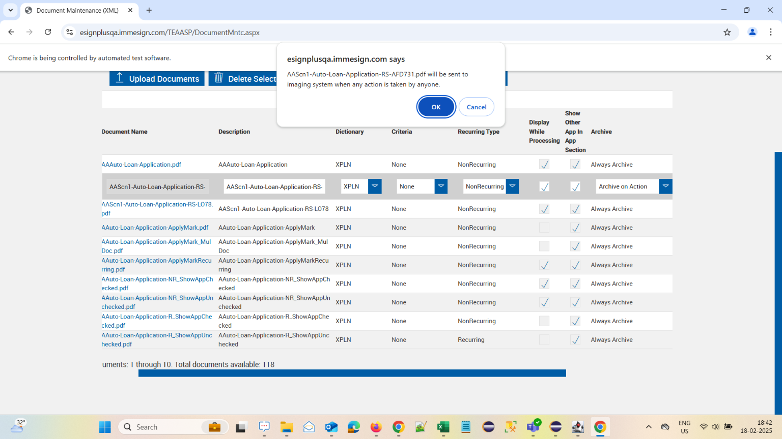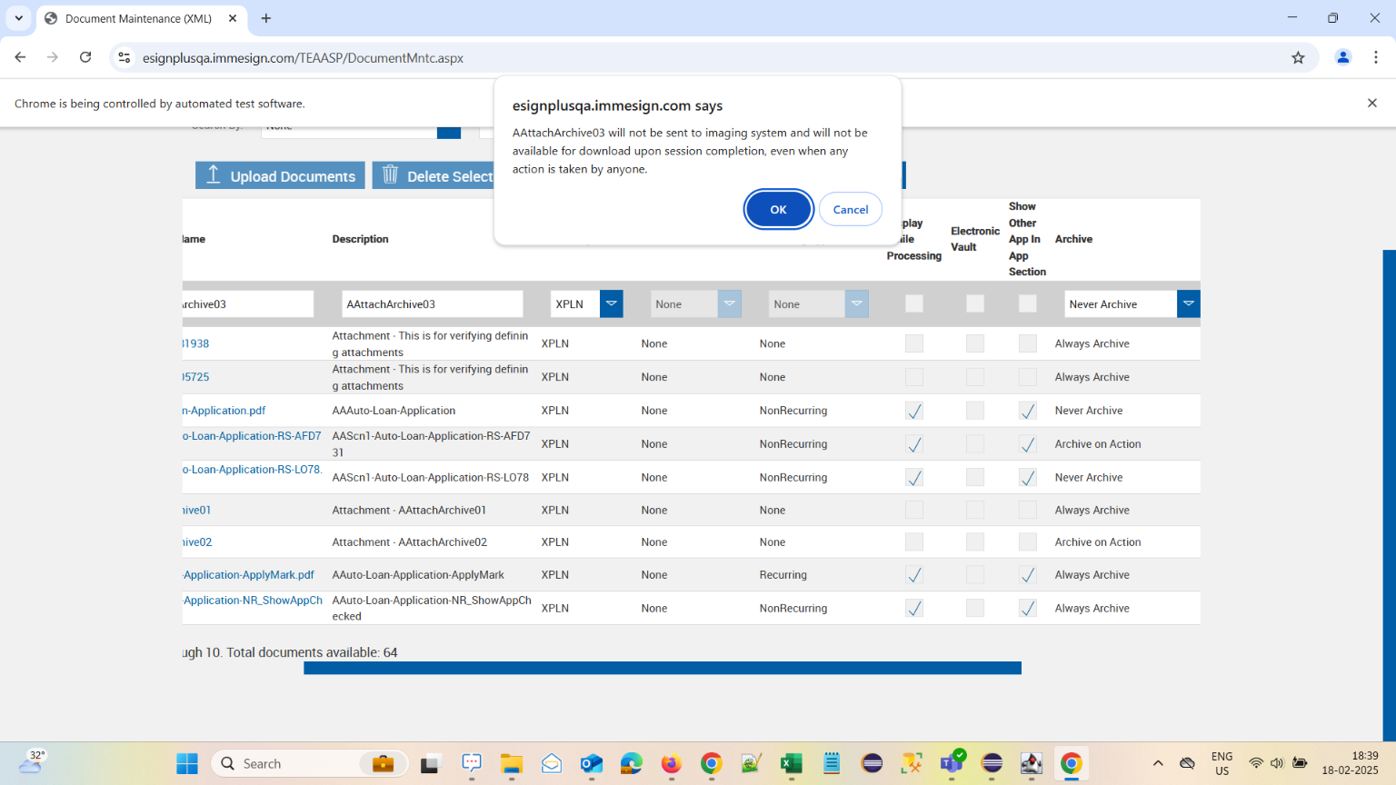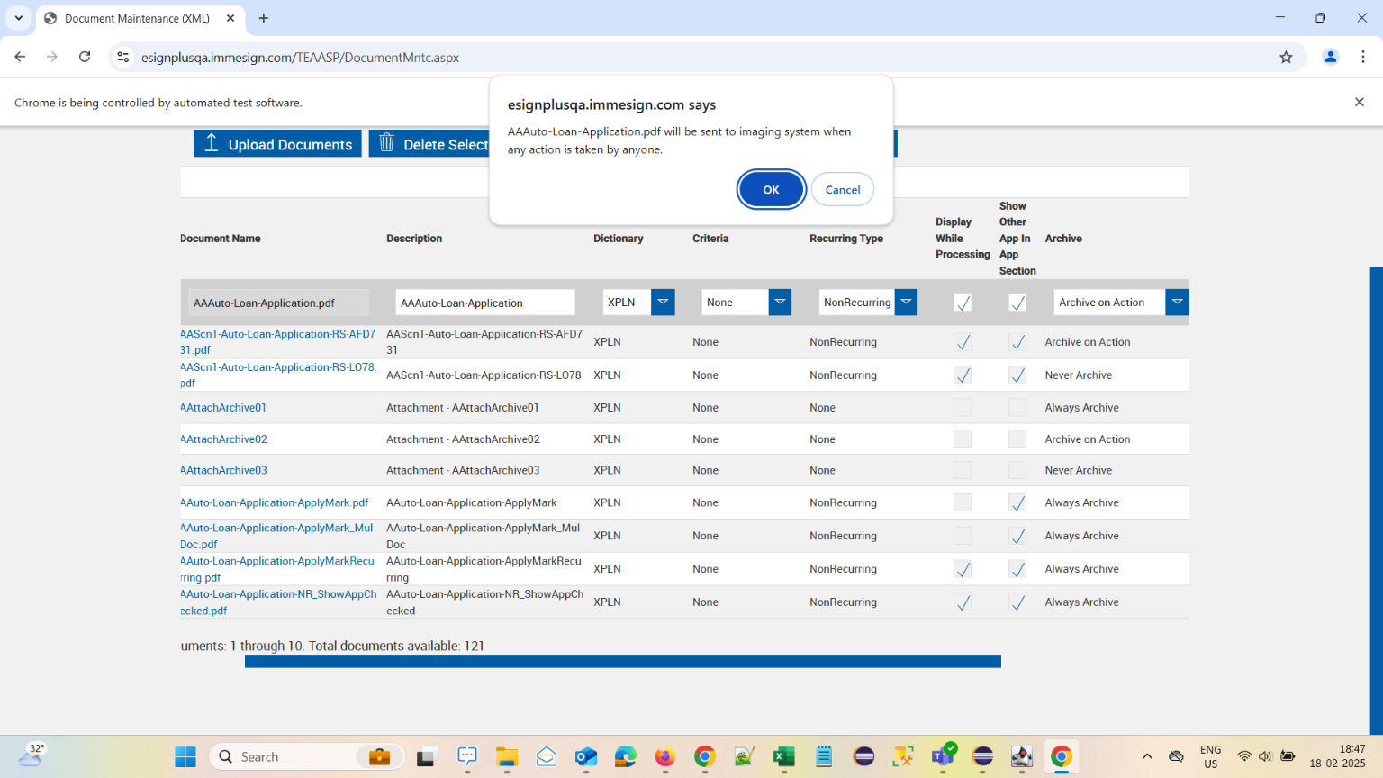 Warning Message for Archive on Action is verified on Document Maintenance XML page [ScreenShot]