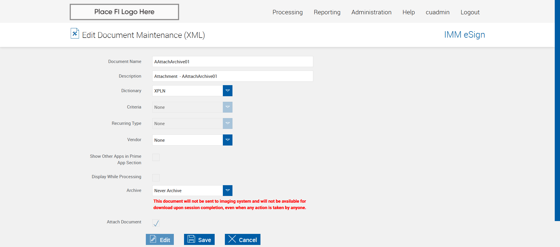 Default Archive value is set to Never Archive on Edit Document Maintenance XML page [ScreenShot]