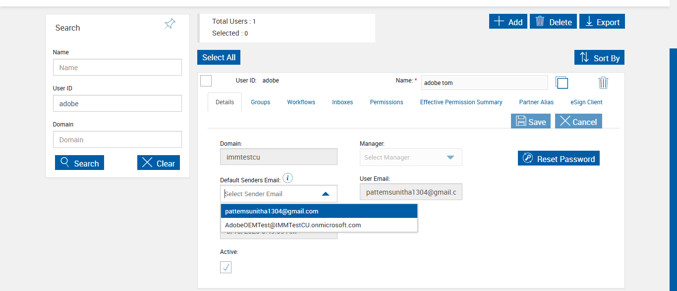 Expected: Selected value displayed 'AdobeOEMGroup@IMMTestCU.onmicrosoft.com'