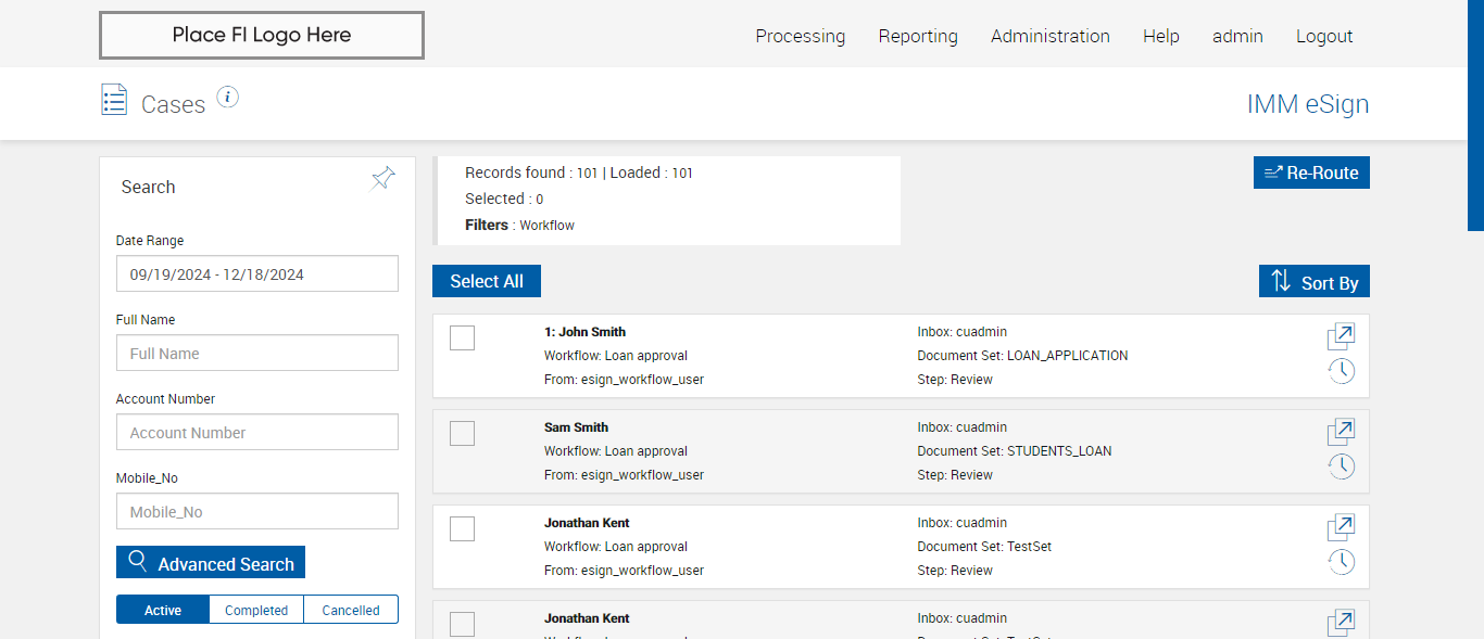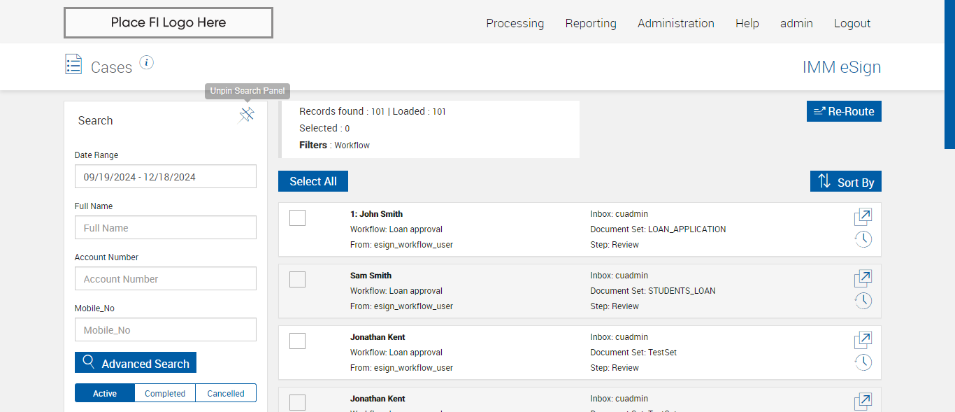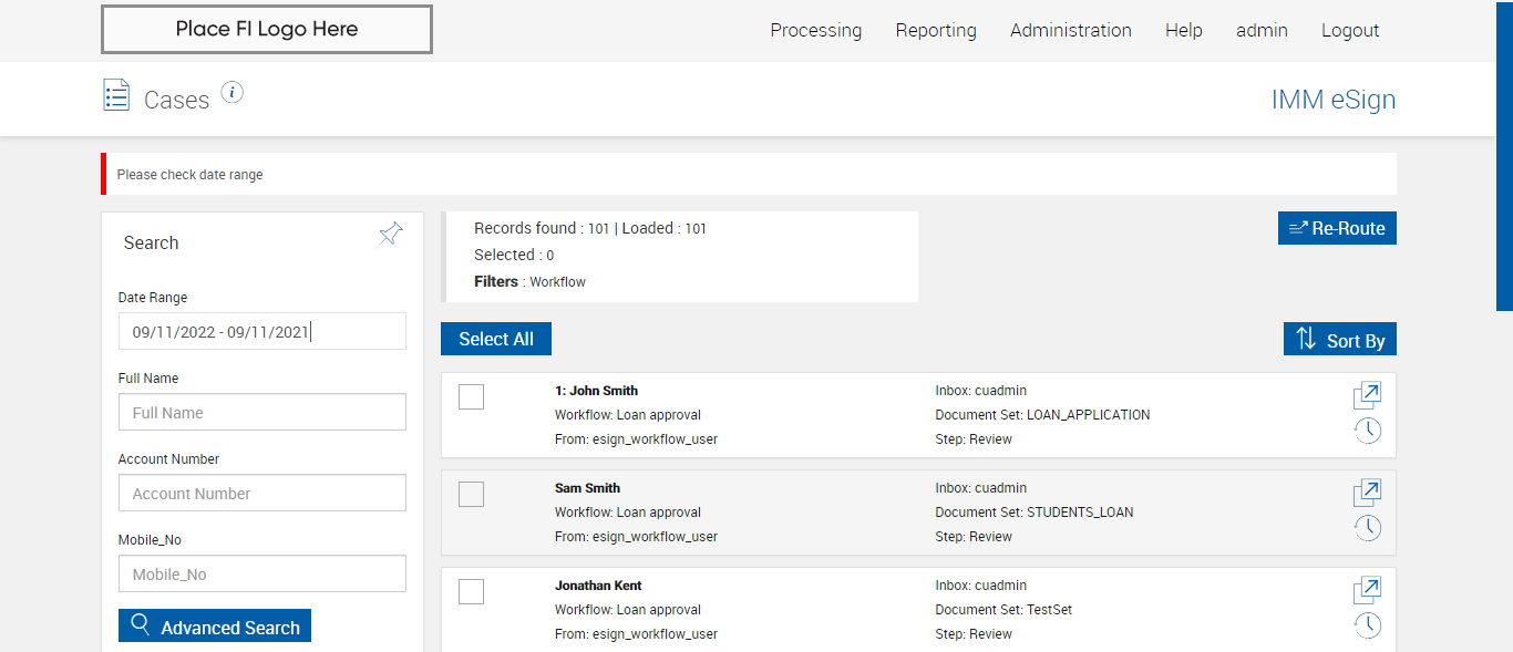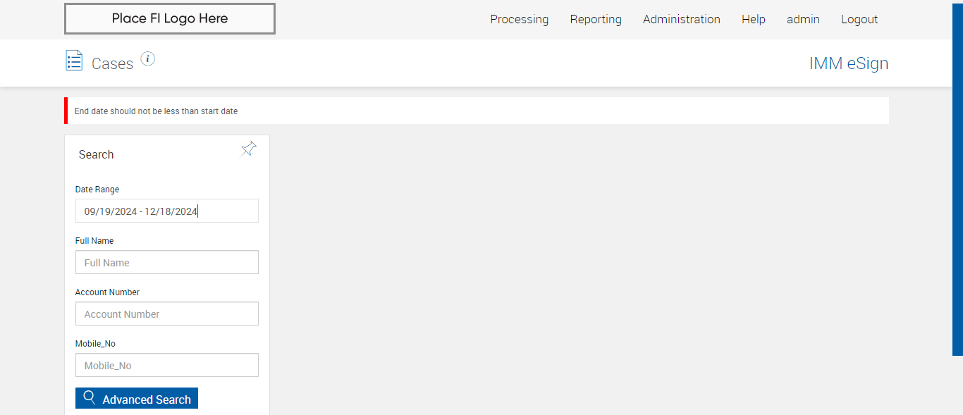 'Date Range', 'Full Name', 'Account Number' text fields & 'Search', 'Advanced', 'Clear' buttons are displayed [ScreenShot]