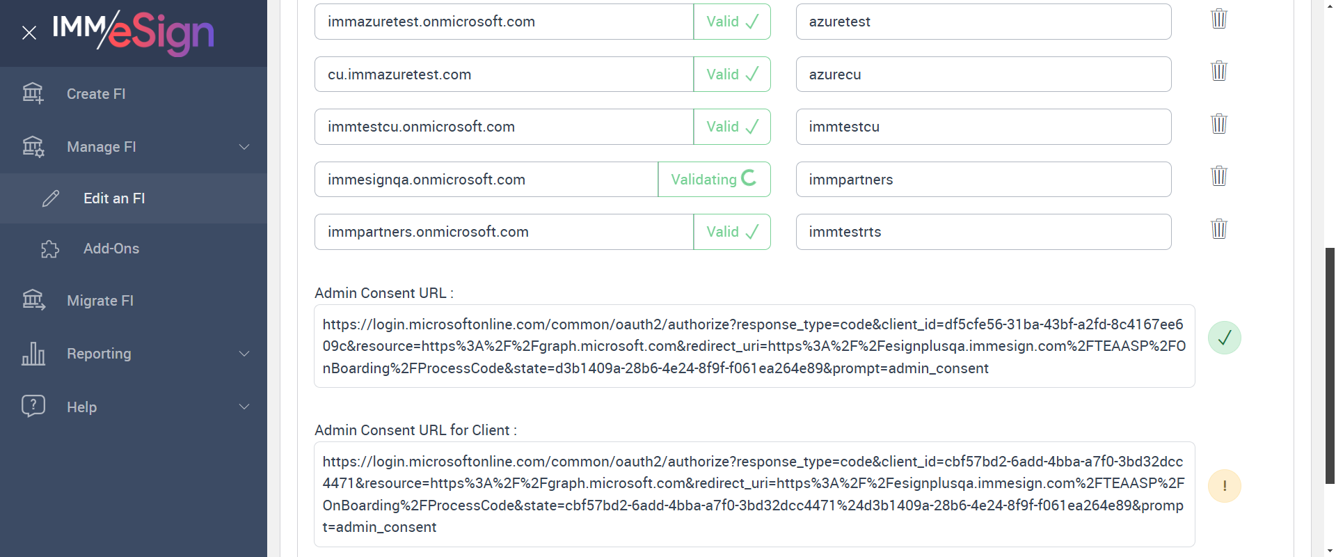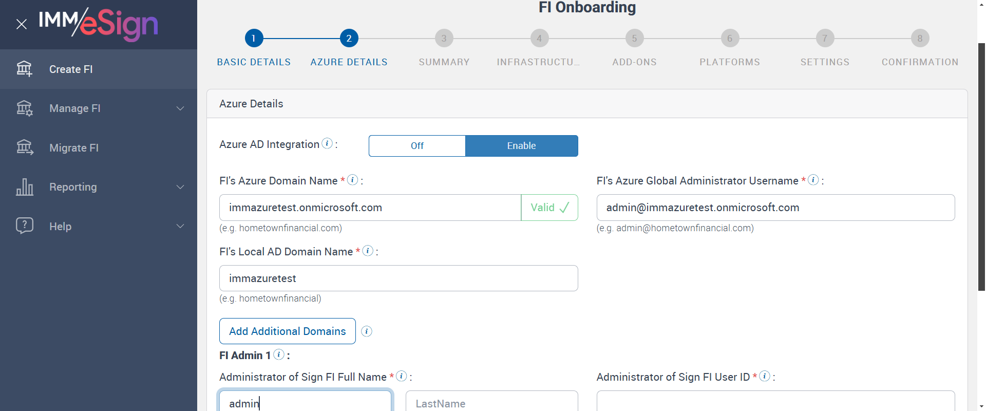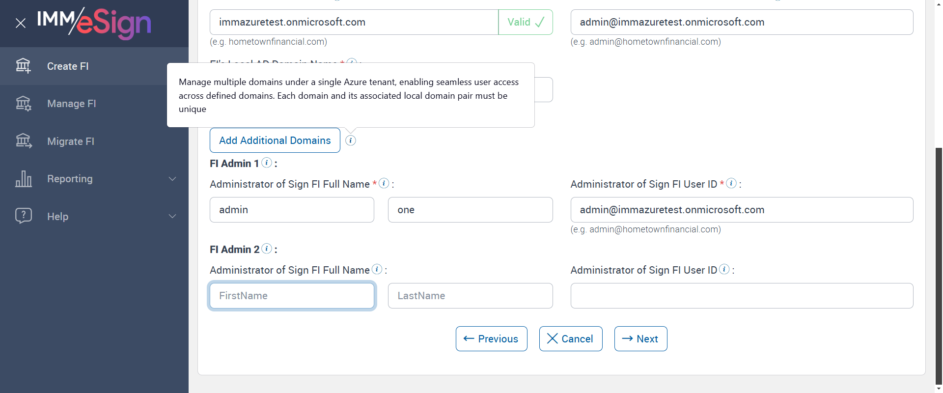 | 05:00:01 pm | Create new FI, While create FI verify Azure details tab UI for multi domain and add multiple Additional domain. After that verify user can login with different additional domains and check user will add in correct group also check correct domain name display. | |