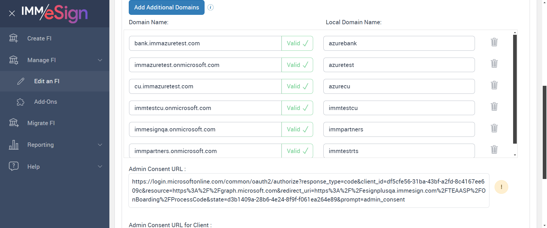 | 05:05:05 pm | Expected: Verify adding Valid additional Domain name, Validate button should show 'Valid' with green tick-mark. Actual(Passed): Validate button show 'Valid' with green tick-mark. Added Domain name - bank.immazuretest.com [ScreenShot] |