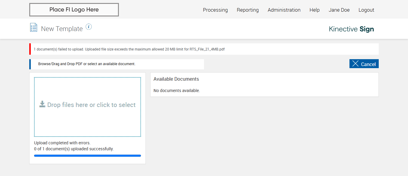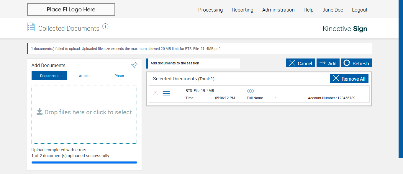 | 05:01:39 pm | Expected: 1 document(s) failed to upload. Uploaded file size exceeds the maximum allowed 20 MB limit for RTS_File_21_4MB.pdf Actual(Passed): Successfully validated error message 1 document(s) failed to upload. Uploaded file size exceeds the maximum allowed 20 MB limit for RTS_File_21_4MB.pdf [ScreenShot] |