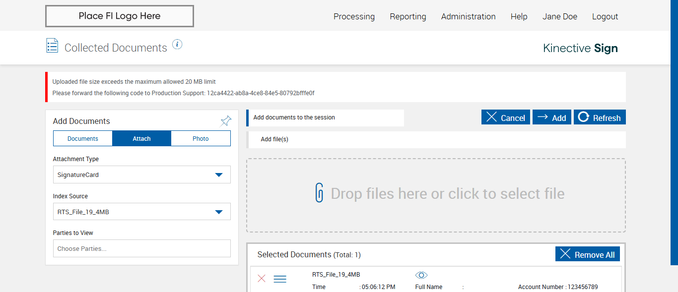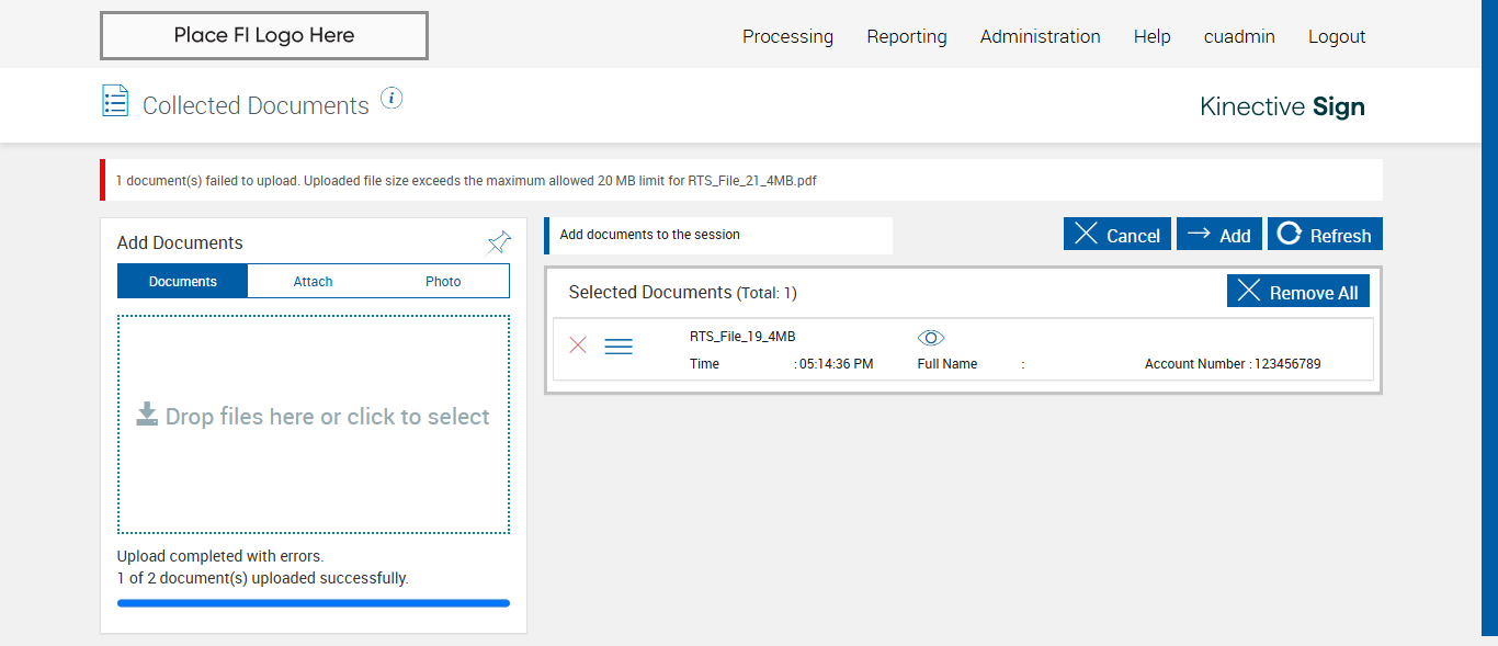 | 05:45:50 pm | Successfully validated error message 1 document(s) failed to upload. Uploaded file size exceeds the maximum allowed 20 MB limit for RTS_File_21_4MB.pdf [ScreenShot] | |
