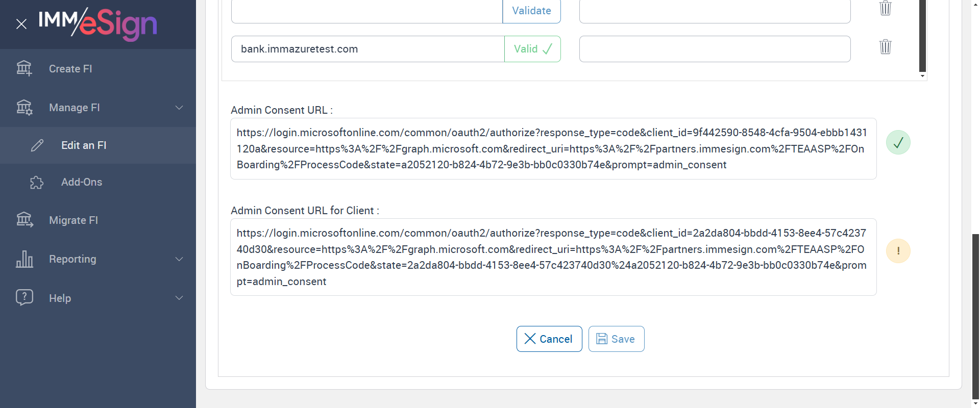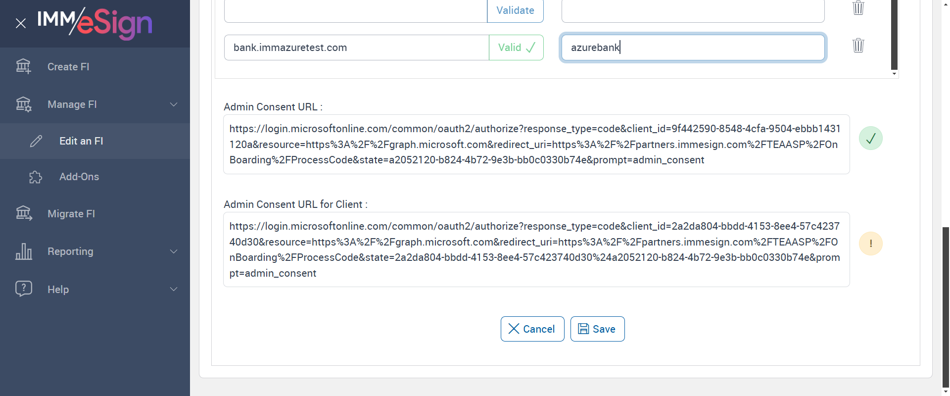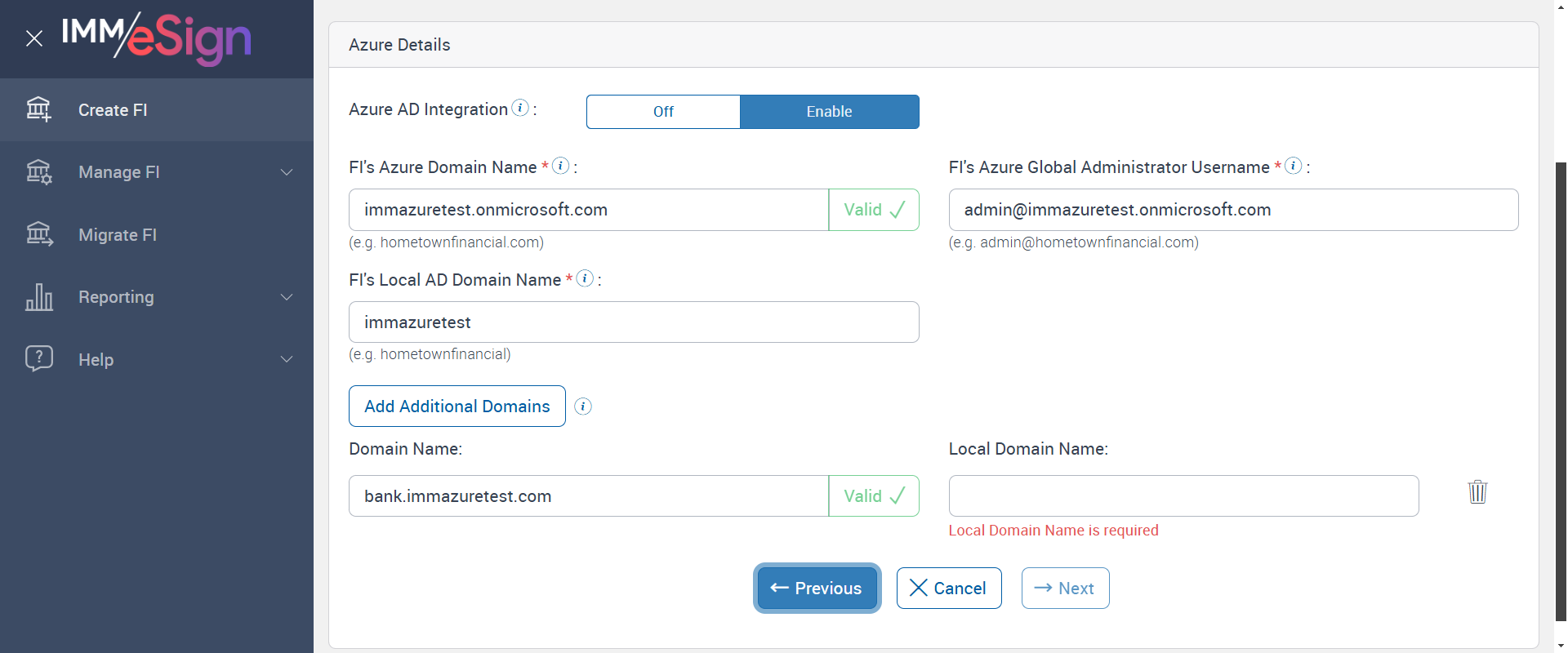 | com.imm.testscripts.FIManagement.FIManagement | verifyMultiDomainTMCreateFIAzureDetailsandEsignUsersLogin: Create new FI, While create FI verify Azure details tab UI for multi domain and add multiple Additional domain. After that verify user can login with different additional domains and check user will add in correct group also check correct domain name display. | 1740137298552 | 240979 |