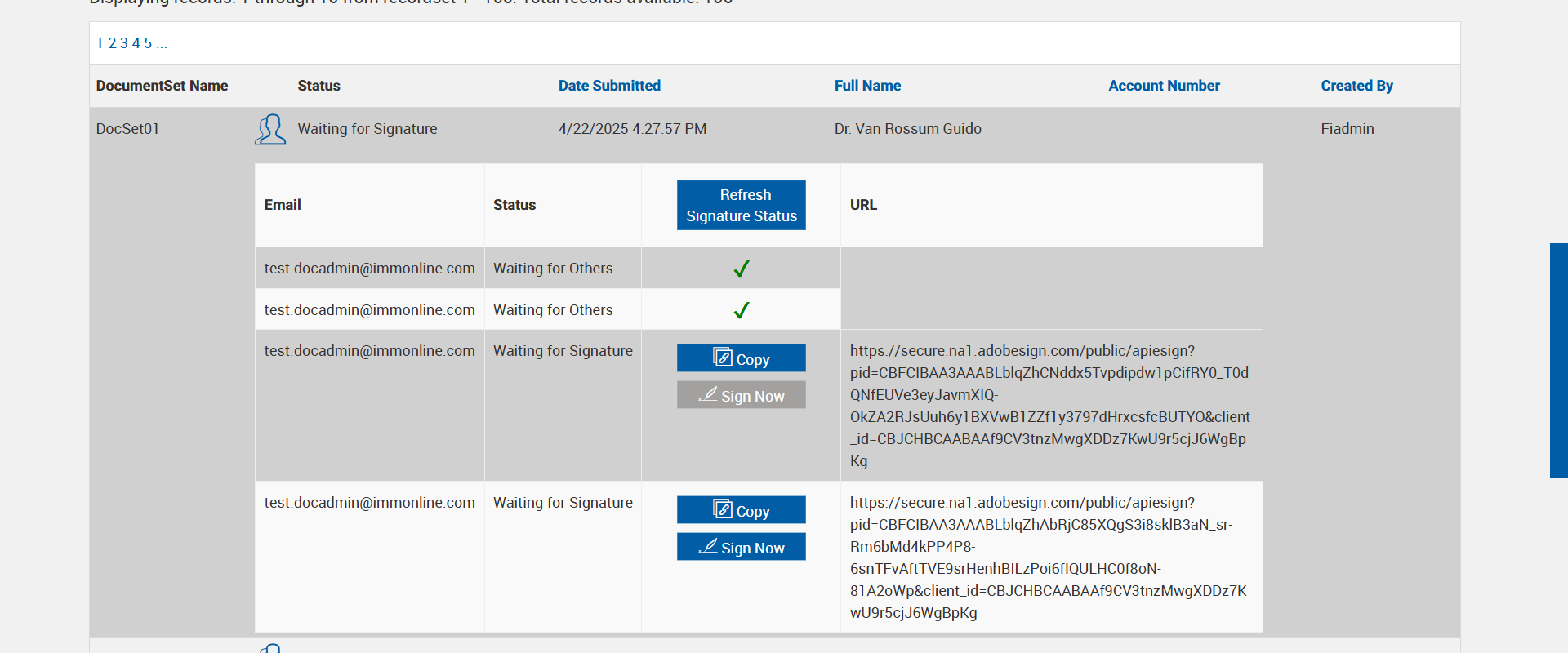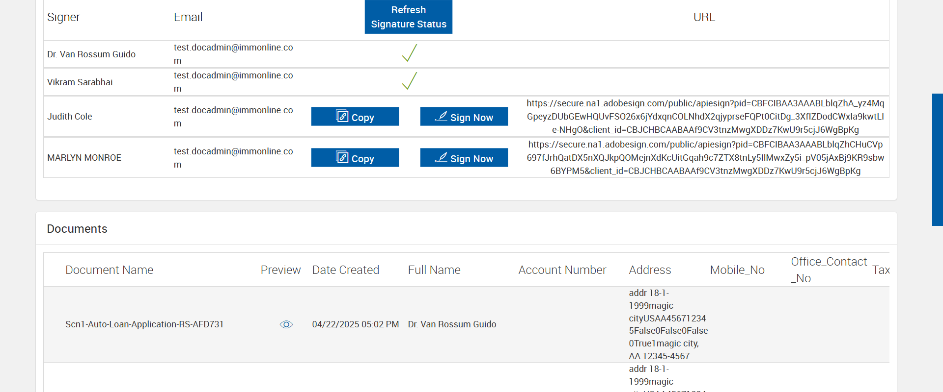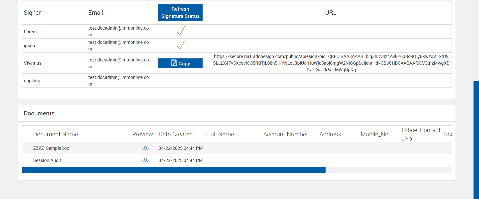 | 05:00:30 pm | Expected: Verify 'Copy' and 'Sign Now' button display in eSignature Management page for the party - 2 Actual(Passed): Verified 'Copy' and 'Sign Now' button displayed in eSignature Management page for the party - 2 [ScreenShot] |