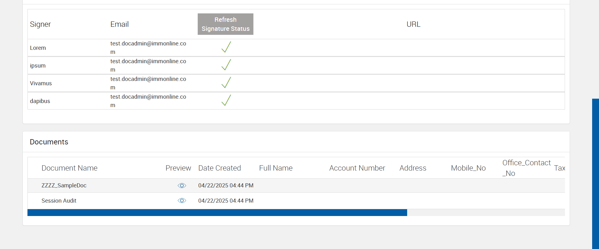 | 05:03:54 pm | Expected: Verify 'Signature Status' and 'Documents' sections display in Session Details page Actual(Passed): Successfully verified 'Signature Status' and 'Documents' sections display in Session Details page [ScreenShot] |
