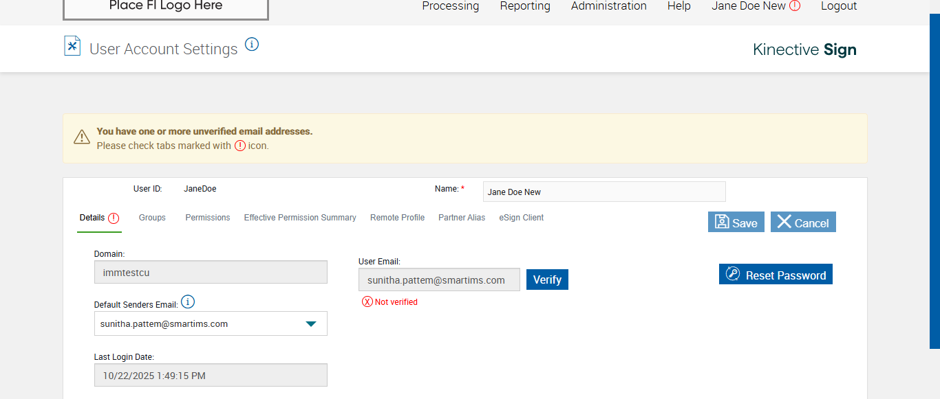 Actual(Passed): Successfully verified 'X Not Verified' status is displayed in Details tab when user email is not blank and not verified for Fully Integrated FI[ScreenShot]