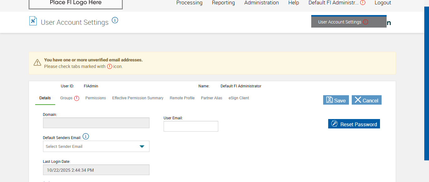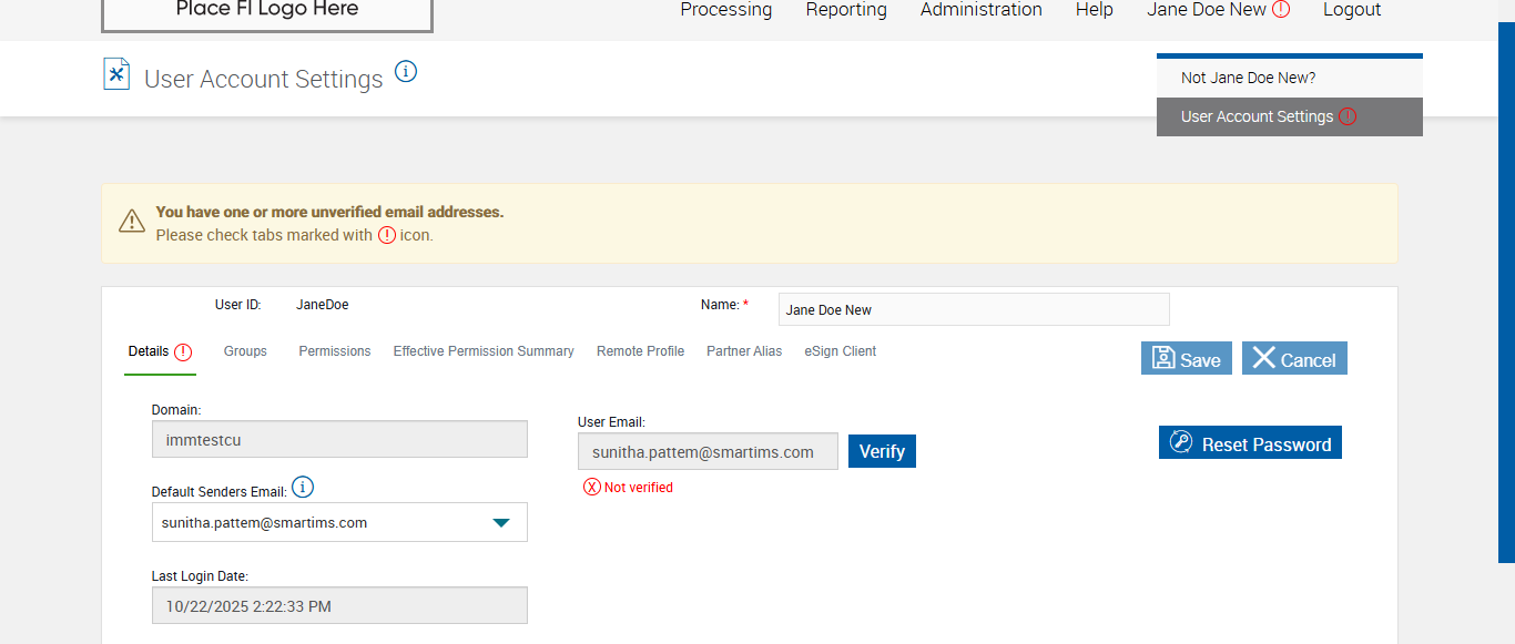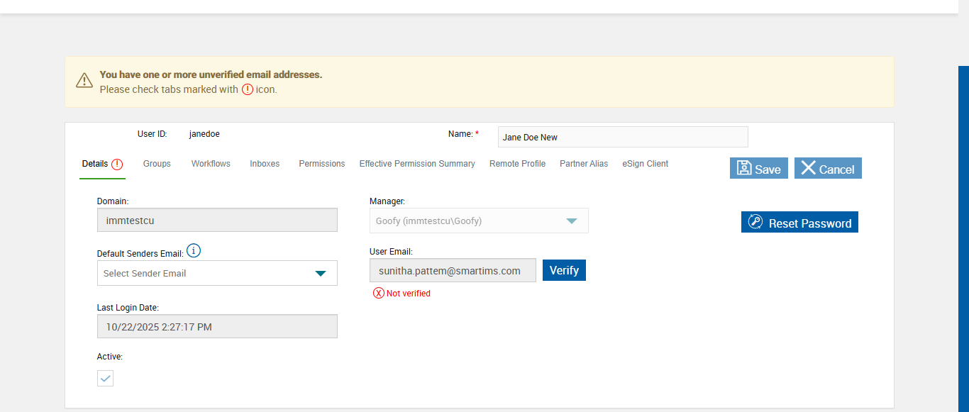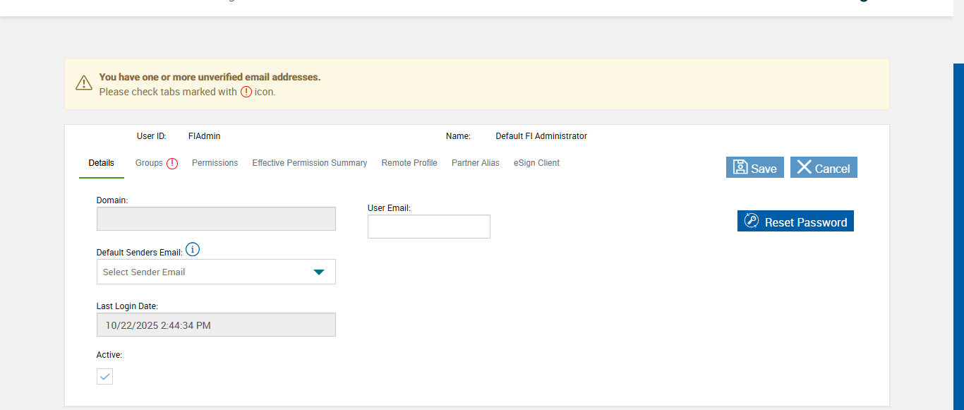 Actual(Failed): Failed to verify Exclamation mark is displayed in Details tab when user email is not blank and not verified for Fully Integrated FI[ScreenShot]