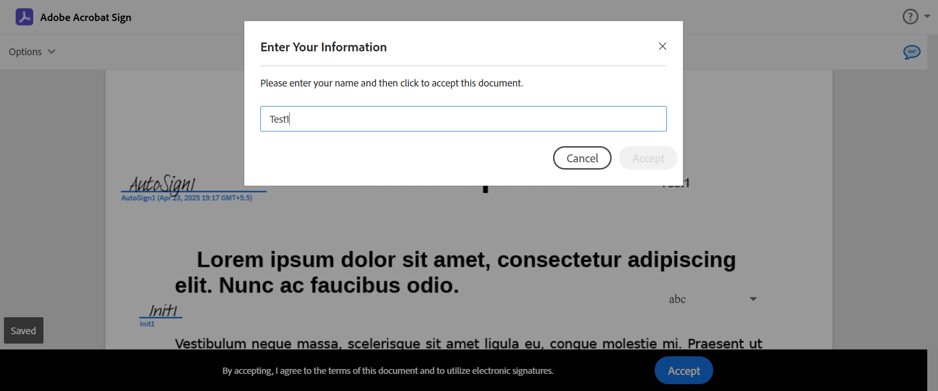 --- 23 Apr 18:36:44 145 - TestCaseID:: VerifyKioskFunctionalityWithRTSAndXMLSessionInEsign --- 23 Apr 18:36:45 873 - 1 - Driver::initialize::Get - com.imm.support.WebDriverFactory.get(WebDriverFactory.java:558) Set Kiosk toggle enable and set Kiosk Setting dropdown field in Tenant manager for eSign FI. create RTS and XML session one after another with different Kiosk setting dropdown options and different signing order (Complete in order, Complete in any order) and verify Kiosk functionality for the 'eSignature Management' page and 'Remote Signature Status' page Steps: Set Kiosk toggle enable and set Kiosk Setting dropdown field in Tenant manager for eSign FI. create RTS and XML session one after another with different Kiosk setting dropdown options and different signing order (Complete in order, Complete in any order) and verify Kiosk functionality for the 'eSignature Management' page and 'Remote Signature Status' page =-=-=-=-=-=-=-=-=-=-=-=-=-=-=-= Login into TM, Set Kiosk setting dropdown field's option as 'Sign now' =-=-=-=-=-=-=-=-=-=-=-=-=-=-=-= --- 23 Apr 18:36:55 154 - Page URL:: https://login.microsoftonline.com/organizations/oauth2/v2.0/authorize?client_id=7be6e63f-308a-4475-979c-c5c021156f67&scope=api%3a%2f%2f7ab4b4a1-91a2-4b47-8aa5-e2ab73338e0b%2fall%20openid%20profile%20offline_access&redirect_uri=https%3a%2f%2fesignnonprod.immesign.com%2fqa%2ftenantmanager%2f&client-request-id=18c60e41-e0f4-4e6f-854d-a06f12af54d1&response_mode=fragment&response_type=code&x-client-sku=msal.js.browser&x-client-ver=3.0.2&client_info=1&code_challenge=i_9mrlrpxrscw_us-keyd86lgd3hv-phir30o2jovhs&code_challenge_method=s256&nonce=65cd0ae0-ebca-4f7d-8c74-660c4d8b925e&state=eyjpzci6ije2y2y2zta0lwu1ytatngmzny1hotdlltg3ntuxmzi2mtyzmsisim1ldgeionsiaw50zxjhy3rpb25uexblijoicmvkaxjly3qifx0%3d&sso_reload=true --- 23 Apr 18:36:55 154 - 4 - Page Load Wait: (Sync) - com.imm.support.Utils.waitForPageLoad(Utils.java:118) --- 23 Apr 18:37:13 954 - Element is displayed using Selenide:: [[RemoteWebDriver: chrome on Windows 11 (41a68c3d60c6c5cc45b521f6b4449873)] -> id: idSIButton9] --- 23 Apr 18:37:14 047 - Element is displayed using Selenide:: [[RemoteWebDriver: chrome on Windows 11 (41a68c3d60c6c5cc45b521f6b4449873)] -> id: i0116] --- 23 Apr 18:37:14 863 - Element is displayed using Selenide:: [[RemoteWebDriver: chrome on Windows 11 (41a68c3d60c6c5cc45b521f6b4449873)] -> id: idSIButton9] --- 23 Apr 18:37:21 234 - Page URL:: https://login.microsoftonline.com/common/login --- 23 Apr 18:37:21 234 - 4 - Page Load Wait: (Sync) - com.imm.support.Utils.waitForPageLoad(Utils.java:118) --- 23 Apr 18:37:21 313 - Element is displayed using Selenide:: [[RemoteWebDriver: chrome on Windows 11 (41a68c3d60c6c5cc45b521f6b4449873)] -> id: lightbox] --- 23 Apr 18:37:21 421 - Element is displayed using Selenide:: [[RemoteWebDriver: chrome on Windows 11 (41a68c3d60c6c5cc45b521f6b4449873)] -> id: idSIButton9] --- 23 Apr 18:37:27 438 - Page URL:: https://esignnonprod.immesign.com/qa/tenantmanager/ --- 23 Apr 18:37:27 439 - 3 - Page Load Wait: (Sync) - com.imm.support.Utils.waitForPageLoad(Utils.java:118) --- 23 Apr 18:37:30 586 - Page URL:: https://esignnonprod.immesign.com/qa/tenantmanager/#/fi/create --- 23 Apr 18:37:30 586 - 3 - Page Load Wait: (Sync) - com.imm.support.Utils.waitForPageLoad(Utils.java:118) --- 23 Apr 18:37:30 688 - Element is displayed using Selenide:: [[RemoteWebDriver: chrome on Windows 11 (41a68c3d60c6c5cc45b521f6b4449873)] -> id: createdFIList] eSign Tenant Manager -CreateFi Page open up [ScreenShot] --- 23 Apr 18:37:33 935 - Page URL:: https://esignnonprod.immesign.com/qa/tenantmanager/#/fi/create --- 23 Apr 18:37:33 935 - 3 - Page Load Wait: (Sync) - com.imm.support.Utils.waitForPageLoad(Utils.java:118) --- 23 Apr 18:37:34 008 - Element is displayed using Selenide:: [[RemoteWebDriver: chrome on Windows 11 (41a68c3d60c6c5cc45b521f6b4449873)] -> css selector: .header] --- 23 Apr 18:37:36 356 - Element is displayed using Selenide:: [[RemoteWebDriver: chrome on Windows 11 (41a68c3d60c6c5cc45b521f6b4449873)] -> xpath: //*[@id='Menu_EditFI']/c-sidebar-nav-link-content] --- 23 Apr 18:37:39 650 - Page URL:: https://esignnonprod.immesign.com/qa/tenantmanager/#/fi/manage/basic --- 23 Apr 18:37:39 650 - 3 - Page Load Wait: (Sync) - com.imm.support.Utils.waitForPageLoad(Utils.java:118) --- 23 Apr 18:37:42 797 - Page URL:: https://esignnonprod.immesign.com/qa/tenantmanager/#/fi/manage/basic --- 23 Apr 18:37:42 797 - 3 - Page Load Wait: (Sync) - com.imm.support.Utils.waitForPageLoad(Utils.java:118) --- 23 Apr 18:37:45 943 - Page URL:: https://esignnonprod.immesign.com/qa/tenantmanager/#/fi/manage/basic --- 23 Apr 18:37:45 943 - 3 - Page Load Wait: (Sync) - com.imm.support.Utils.waitForPageLoad(Utils.java:118) --- 23 Apr 18:37:46 039 - Element is displayed using Selenide:: [[RemoteWebDriver: chrome on Windows 11 (41a68c3d60c6c5cc45b521f6b4449873)] -> css selector: div.d-flex.align-items-center.justify-content-between.ng-star-inserted > div > label] --- 23 Apr 18:37:49 160 - Page URL:: https://esignnonprod.immesign.com/qa/tenantmanager/#/fi/manage/basic --- 23 Apr 18:37:49 160 - 3 - Page Load Wait: (Sync) - com.imm.support.Utils.waitForPageLoad(Utils.java:118) --- 23 Apr 18:37:49 250 - Element is displayed using Selenide:: [[RemoteWebDriver: chrome on Windows 11 (41a68c3d60c6c5cc45b521f6b4449873)] -> css selector: .header] Successfully navigated to 'Manage FI' page [ScreenShot] --- 23 Apr 18:37:55 497 - Page URL:: https://esignnonprod.immesign.com/qa/tenantmanager/#/fi/manage/basic --- 23 Apr 18:37:55 497 - 3 - Page Load Wait: (Sync) - com.imm.support.Utils.waitForPageLoad(Utils.java:118) --- 23 Apr 18:37:57 832 - Element is displayed using Selenide:: [[RemoteWebDriver: chrome on Windows 11 (41a68c3d60c6c5cc45b521f6b4449873)] -> xpath: //div[contains(@class,'ng-placeholder')]] Existing Fi Name is not displaying [ScreenShot] Host Id 0 ekiosk6 | ekiosk6 Search FI displayed in list --- 23 Apr 18:38:04 054 - Element is displayed 
