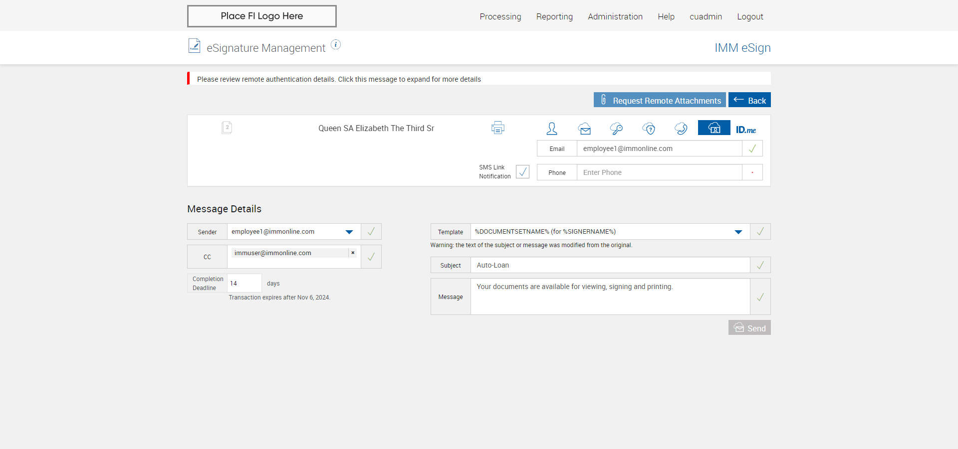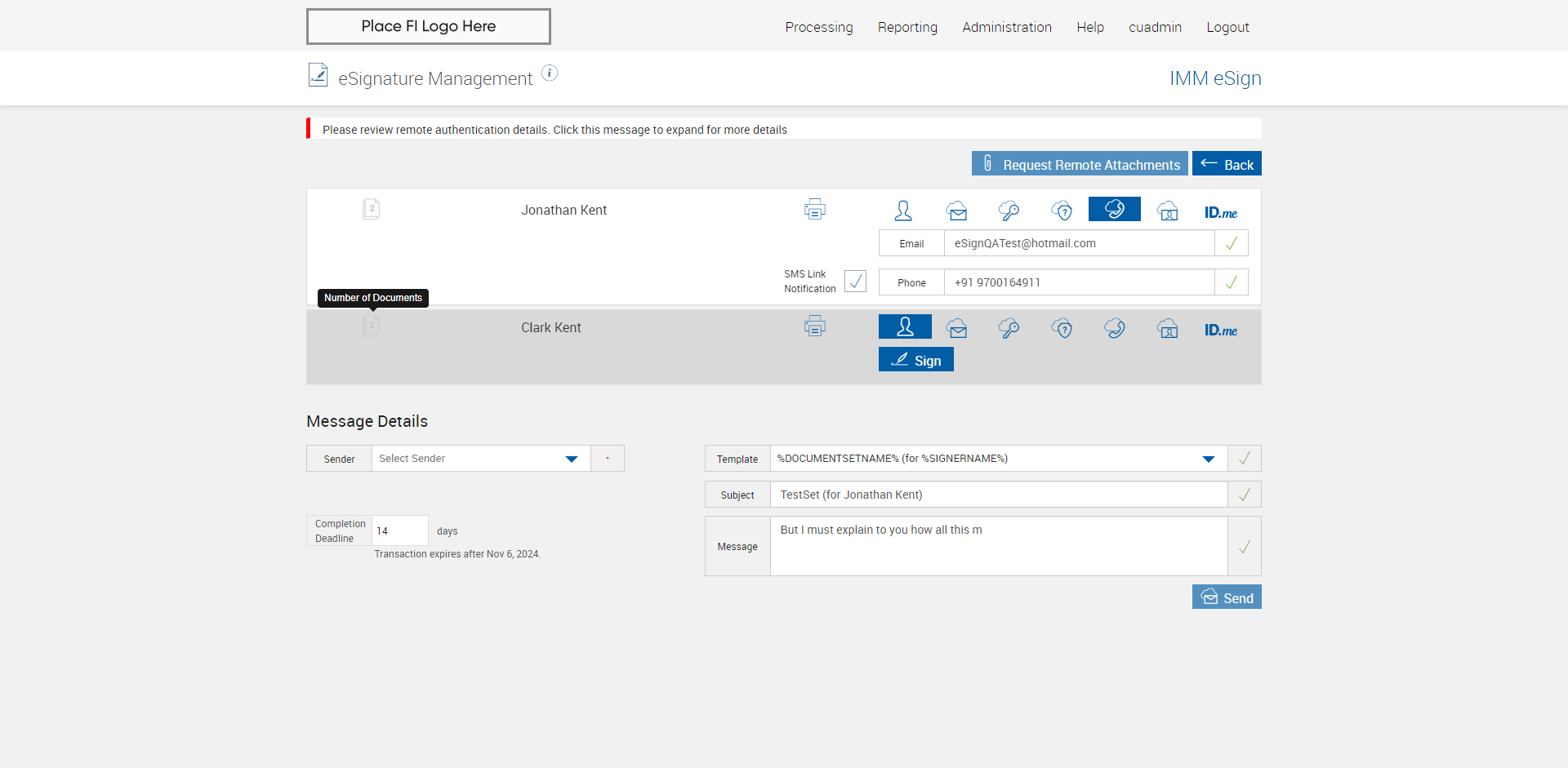 --- 23 Oct 16:16:55 487 - TestCaseID:: addVendorAttachmentAndProcess --- 23 Oct 16:16:56 626 - 1 - Driver::initialize::Get - com.imm.support.WebDriverFactory.get(WebDriverFactory.java:522) Without docset with vendor document and standard template Steps: **** Without docset with vendor document and standard template **** https://esignplusqa.immesign.com/TEAASP/HostDispatch.aspx?hostid=XP&hsfiid=autoesign&xmlData=D:\Automation_DataFiles\PC-NoDataSet3.xml --- 23 Oct 16:16:59 380 - Page URL:: https://login.microsoftonline.com/common/oauth2/authorize?client_id=df5cfe56-31ba-43bf-a2fd-8c4167ee609c&response_type=code%20id_token&scope=openid%20profile&state=openidconnect.authenticationproperties%3dv_el0yzdjjfq266o6ioomgemdhkfhjygv70-9o0x8tnaktlwwfxcdh8t8jnp50k4d-sjoxxbewd-cerq-qamownaqqfsfds5rcvydkwikl82mi02y5l0kv6o4rpdhpw-78goovmabyszl9s_a3iljiz9byduldgs6uagcwylygoz5usg8wikdzqnzldudn_ownn5afhfdrnp6gq7v7w6dslvm3xohikbrr26vl14pkbkilbqt7yhgwdpl8kt1oe3ff65jk8ewel7s8ho28mbtmyyp8gyfawunbvsypw3s9fvllkmopiwa0lgyfzqlp53lbc1ycj_aqj09dqtd-c0b7t1mdvtsh0jm9qfh5ctkpdixszomlu0u5ey3eslb6x5tbo-lkwa7o2tcgayzqnxaxu_qej98gfdmyybn4tyo212f-myrnvvwp271fphliw8vm2bxzsqyhjei4u3pltkqvkuea-qb2demhtn-7vybea&response_mode=form_post&nonce=638652970178383044.yzjhnzm4zjetmgy5yi00nmy5lwe1zjutnwqzytdlnmi0ztdhmzyyztfimdktytdlny00mmvmlwi1owmtogq5ytfmnziyymi2&redirect_uri=https%3a%2f%2fesignplusqa.immesign.com%2fteaasp%2flogin.aspx&post_logout_redirect_uri=https%3a%2f%2fesignplusqa.immesign.com%2fteaasp%2flogin.aspx&x-client-sku=id_net461&x-client-ver=5.3.0.0&sso_reload=true --- 23 Oct 16:16:59 381 - 1 - Page Load Wait: (Sync) - com.imm.support.Utils.waitForPageLoad(Utils.java:103) --- 23 Oct 16:16:59 465 - Element is displayed:: [[RemoteWebDriver: chrome on Windows 10 (221df8bb154c84074bdb26219712a66a)] -> id: idSIButton9] --- 23 Oct 16:16:59 536 - Element is displayed:: [[RemoteWebDriver: chrome on Windows 10 (221df8bb154c84074bdb26219712a66a)] -> id: i0116] --- 23 Oct 16:16:59 600 - Element is displayed:: [[RemoteWebDriver: chrome on Windows 10 (221df8bb154c84074bdb26219712a66a)] -> id: i0116] --- 23 Oct 16:17:04 929 - Element is displayed:: [[RemoteWebDriver: chrome on Windows 10 (221df8bb154c84074bdb26219712a66a)] -> id: idSIButton9] --- 23 Oct 16:17:05 679 - Element is displayed:: [[RemoteWebDriver: chrome on Windows 10 (221df8bb154c84074bdb26219712a66a)] -> id: i0118] --- 23 Oct 16:17:11 486 - Page URL:: https://login.microsoftonline.com/common/login --- 23 Oct 16:17:11 486 - 0 - Page Load Wait: (Sync) - com.imm.support.Utils.waitForPageLoad(Utils.java:103) --- 23 Oct 16:17:11 559 - Element is displayed:: [[RemoteWebDriver: chrome on Windows 10 (221df8bb154c84074bdb26219712a66a)] -> id: lightbox] --- 23 Oct 16:17:11 963 - Element is displayed:: [[RemoteWebDriver: chrome on Windows 10 (221df8bb154c84074bdb26219712a66a)] -> id: idSIButton9] https://esignplusqa.immesign.com/TEAASP/HostDispatch.aspx?hostid=XP&hsfiid=autoesign&xmlData=D:\Automation_DataFiles\PC-NoDataSet3.xml Logged in to User:cuadmin@immtestcu.onmicrosoft.com --- 23 Oct 16:17:20 004 - Page URL:: https://esignplusqa.immesign.com/teaasp/sessiondetails?origsessionid=202410231617131786841_405tzdzvzukx0slvx5iopyz5 --- 23 Oct 16:17:20 005 - 7 - Page Load Wait: (Sync) - com.imm.support.Utils.waitForPageLoad(Utils.java:103) --- 23 Oct 16:18:02 456 - Unable to find an element after 60 sec ==> [[RemoteWebDriver: chrome on Windows 10 (221df8bb154c84074bdb26219712a66a)] -> xpath: //span[@class='btn-text' and text()=' Process']] --- 23 Oct 16:18:02 756 - Page URL:: https://esignplusqa.immesign.com/teaasp/sessiondetails?origsessionid=202410231617131786841_405tzdzvzukx0slvx5iopyz5 --- 23 Oct 16:18:02 756 - 0 - Page Load Wait: (Sync) - com.imm.support.Utils.waitForPageLoad(Utils.java:103) --- 23 Oct 16:18:02 859 - Element is displayed:: [[RemoteWebDriver: chrome on Windows 10 (221df8bb154c84074bdb26219712a66a)] -> css selector: .header] Successfully navigated to 'New Sessions' page [ScreenShot] --- 23 Oct 16:18:03 580 - Page URL:: https://esignplusqa.immesign.com/teaasp/sessiondetails?origsessionid=202410231617131786841_405tzdzvzukx0slvx5iopyz5 --- 23 Oct 16:18:03 580 - 0 - Page Load Wait: (Sync) - com.imm.support.Utils.waitForPageLoad(Utils.java:103) Clicked 'Documents' tab --- 23 Oct 16:18:03 625 - Element is displayed:: [[RemoteWebDriver: chrome on Windows 10 (221df8bb154c84074bdb26219712a66a)] -> xpath: //div[contains(@id,'adddoc_')]] --- 23 Oct 16:18:06 141 - Page URL:: https://esignplusqa.immesign.com/teaasp/sessiondetails?origsessionid=202410231617131786841_405tzdzvzukx0slvx5iopyz5 --- 23 Oct 16:18:06 141 - 0 - Page Load Wait: (Sync) - com.imm.support.Utils.waitForPageLoad(Utils.java:103) --- 23 Oct 16:18:16 207 - Element is displayed:: [[RemoteWebDriver: chrome on Windows 10 (221df8bb154c84074bdb26219712a66a)] -> xpath: //div[contains(@class,'selected-docs')]//label[@data-bind='text: DocumentName()']] Document 'AAuto-Loan-Application-RS-AFD731' added for processing [ScreenShot] --- 23 Oct 16:18:16 447 - Element is displayed:: [[RemoteWebDriver: chrome on Windows 10 (221df8bb154c84074bdb26219712a66a)] -> id: tab1] Clicked the 'Attach' tab --- 23 Oct 16:18:16 682 - Element is displayed:: [[RemoteWebDriver: chrome on Windows 10 (221df8bb154c84074bdb26219712a66a)] -> xpath: //div[@id='docAddOrAttachForm']//input[@placeholder='Select Attachment Type']] Selected 'Attachment Type' : Signature_Card --- 23 Oct 16:18:22 103 - Element is displayed:: [[RemoteWebDriver: chrome on Windows 10 (221df8bb154c84074bdb26219712a66a)] -> xpath: //div[@id='docAddOrAttachForm']//input[@placeholder='Select Party']] Selected 'Index Source' : Jonathan Kent --- 23 Oct 16:18:27 537 - Element is displayed:: [[RemoteWebDriver: chrome on Windows 10 (221df8bb154c84074bdb26219712a66a)] -> xpath: //*[@id='selectViewParties']//input] Selected 'Party to View' : Clark Kent --- 23 Oct 16:18:33 071 - Page URL:: https://esignplusqa.immesign.com/teaasp/sessiondetails?origsessionid=202410231617131786841_405tzdzv