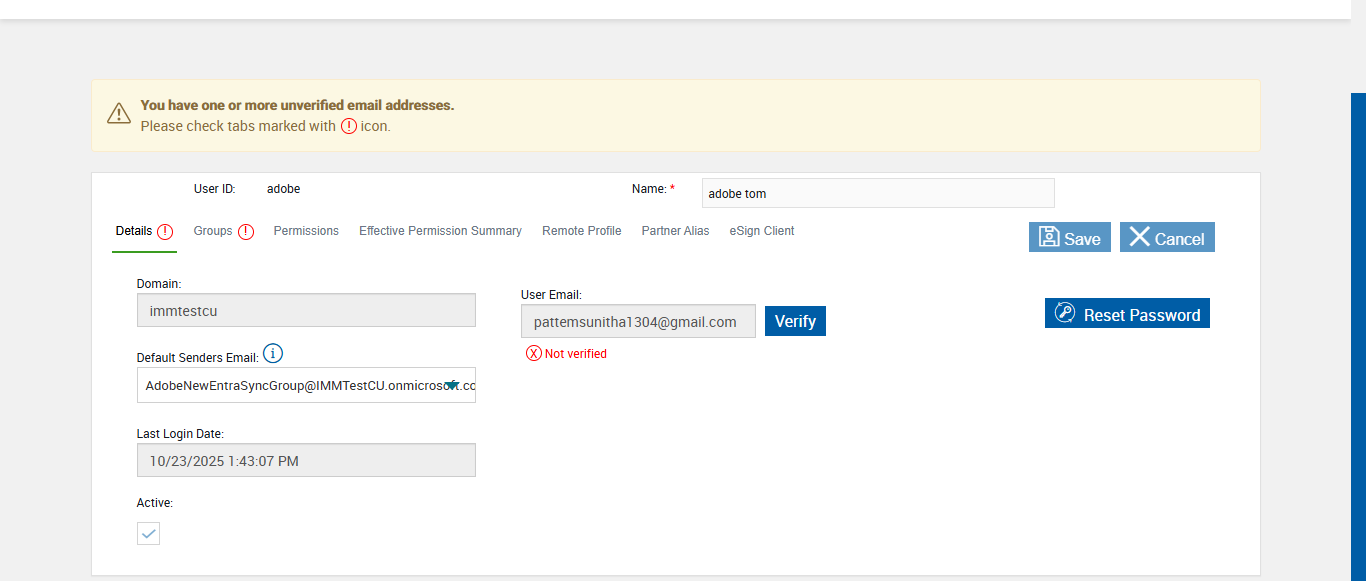 ({Tenant_URL=https://esignnonprod.immesign.com/qa/tenantmanager/#, EmailID=sunitha.pattem@smartims.com,,pattemsunitha1304@gmail.com,, WorkflowSummary=, Login_User_ID=janedoe@immtestcu.onmicrosoft.com,SPNoEmail@IMMTestCU.onmicrosoft.com,adobe@immtestcu.onmicrosoft.com,SPGrpEmailNoUserEmail@Immtestcu.onmicrosoft.com, Address=, FiStatus=, entraGroupEmail=AdobeOEMGroup@IMMTestCU.onmicrosoft.com,AdobeOEMTest@IMMTestCU.onmicrosoft.com,60characterstest_group#&!2323Adobe@IMMTestCU.onmicrosoft.com, FiAdmin_LastName=Doe New,,tom,, Add_Dictionary=, GRP_PermissionRadio=, Effect_Summary=, Name=, GRP_PermissionChkBox=, NewUser_ID=, LocalDomain=, PartiesToView=, NewName=, plusfi=false, User_ID=, Wkf_Permission=, Reset_Password=, NewDescription=, AZDomain=, Workflow=, City=, Delete_Dictionary=, AttachmentTypeOption=, NewEmailID=, State=, Login_Password=iMM@2022, eSignClient=, ClientID=, Domain=immtestcu, UserType=Admin,User,User, anonymusFI=false, NewGroup=, Tenant_User=immadmin2@immesignqa.onmicrosoft.com, FiAdmin_FirstName=Jane,SPNoEmail,adobe,SPGrpEmailNoUserEmail, Group=Administrators,Users;Users;60 characters test _group #&!2323 Adobe,AccountCreation,Adobe New Entra Sync Group,AdobeOEMTest,Users;Users;60 characters test _group #&!2323 Adobe,Users, Dictionary=, FI_Name=, Description=verify Email Verification Status In User Settings Page - Fully Integrated - Sign FI, AdditionalDomainName=, SearchUser=, Filepath=, TestID=verifyEmailVerificationStatusInUserSettingsPage, entraGroup=true, KioskDropDownValues=, FiAdmin_UserID=, Dictionary_Code=, FItype=Unified, integrationType=Fully Integrated, IndexSource=, Access_Password=P@ssword1, UserURL2=, Inbox_Permission=, Confirm_Reset_Password=, AdditionalLocalDomainName=, Notes=, Inbox=, GlobalAdmin=, Path=, Copy_User_ID=, Tenant_Password=iMM@2023, Enter_eSignClient=, ZipCode=, FI_ID=adobeuser, Confirm_Password=P@ssword1, CasesUser=, Tab=, UserURL=, Copy_Tab=, ADUserEmail=})