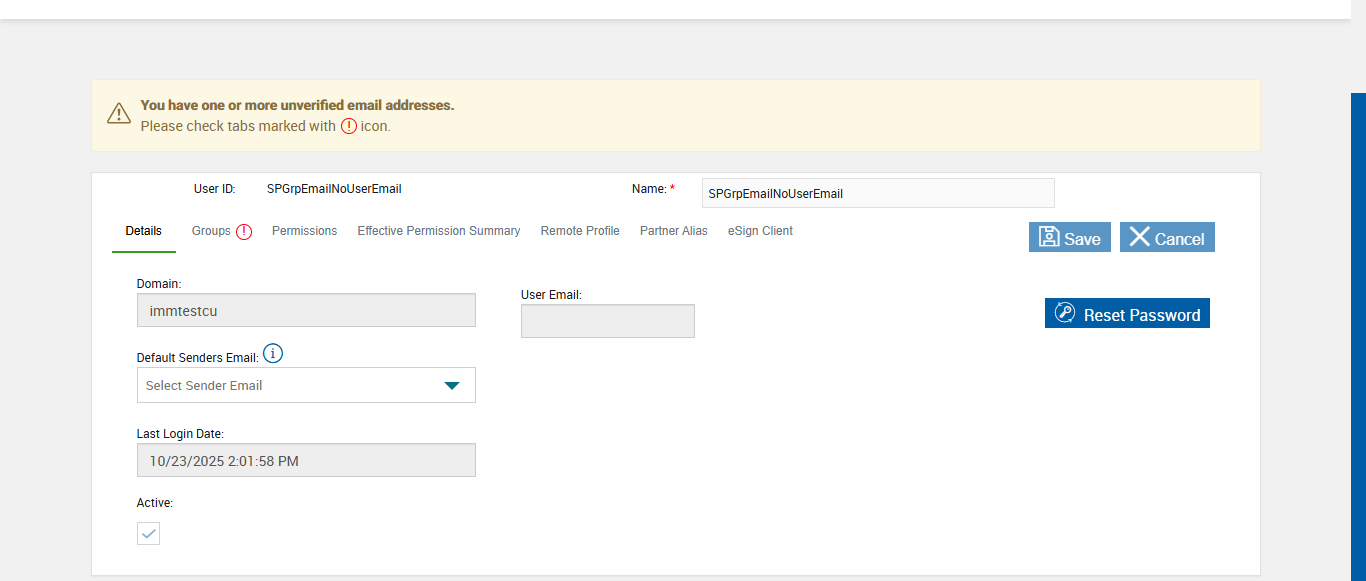 Actual(Failed): Failed to verify Exclamation mark is not displayed in Groups tab when user email is not blank and group email blank for Fully Integrated FI[ScreenShot]