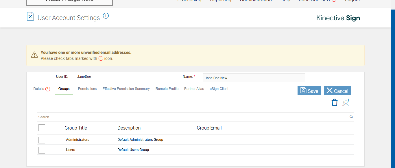 Actual(Failed): Failed to verify Exclamation mark is displayed in Groups tab when user email is blank and not verified group email for Fully Integrated FI[ScreenShot]