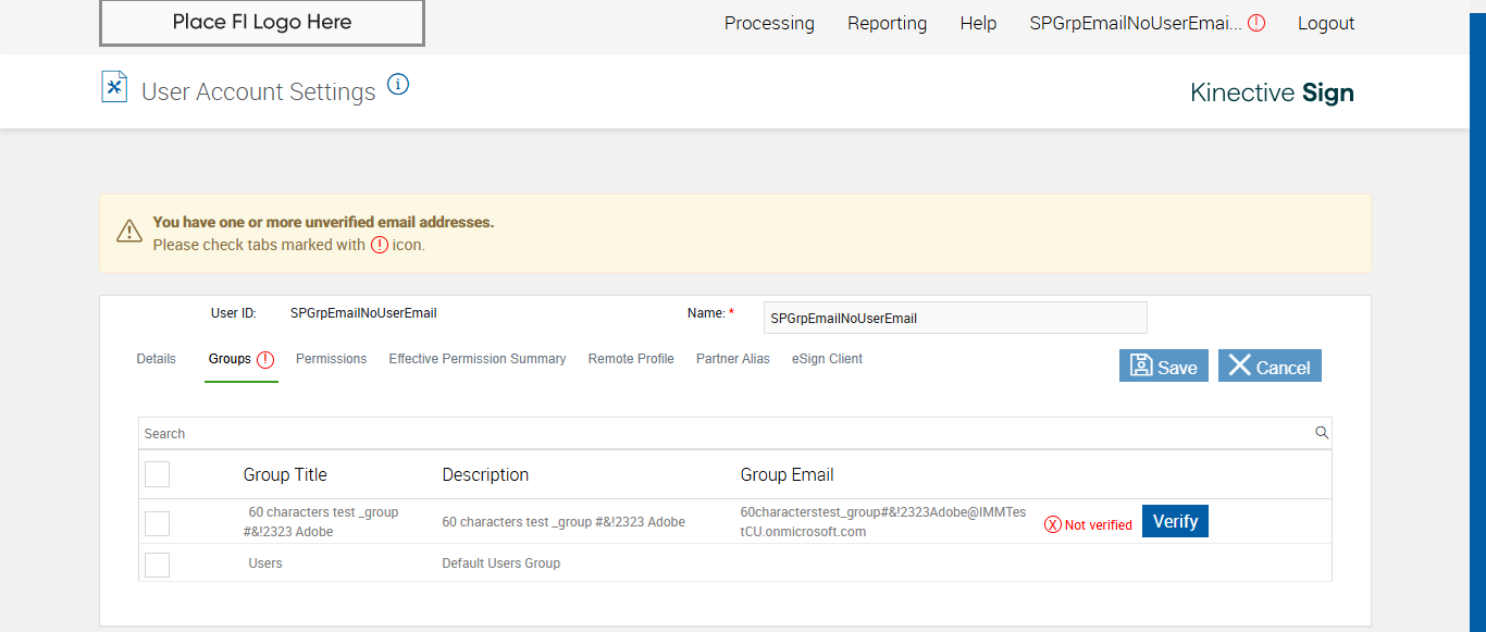 Expected: 'X Not Verified' status is displayed when group email is not blank and group email not verified for Fully Integrated FI for Group 60 characters test _group #&!2323 Adobe