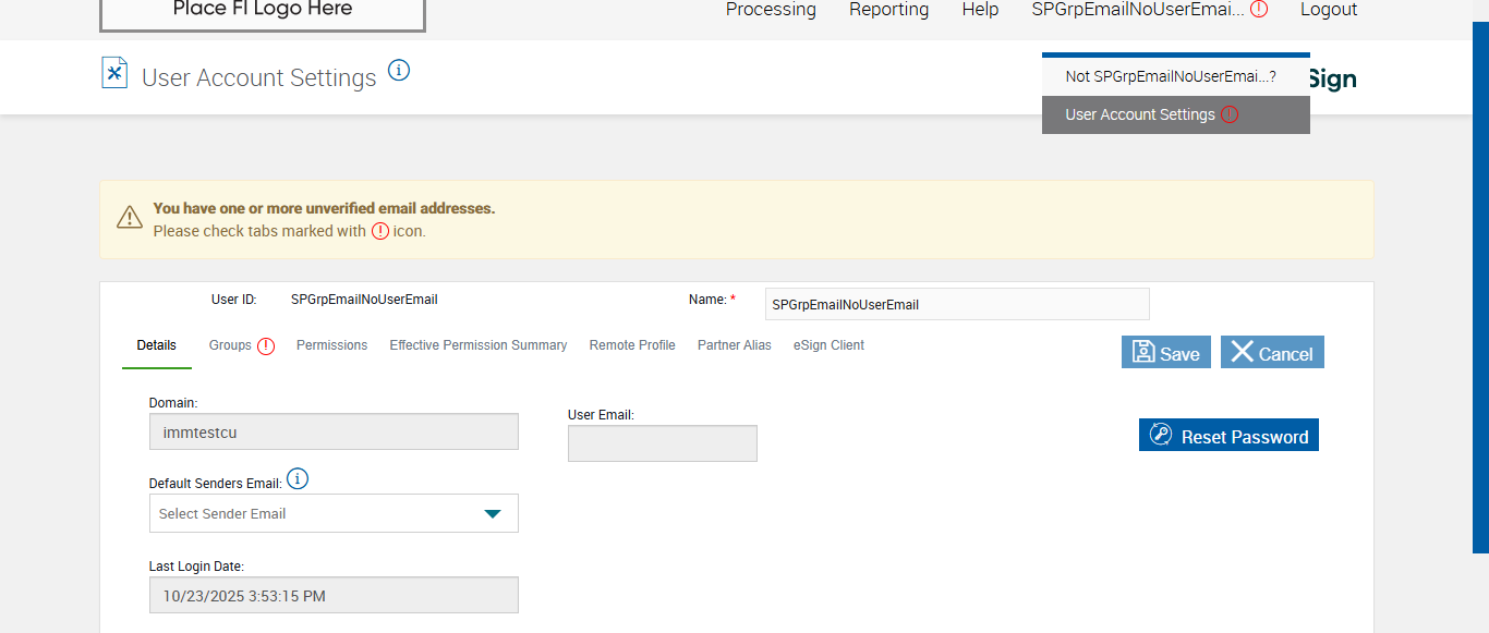 Actual(Passed): Successfully verified Exclamation mark is not displayed in Details tab when user email is blank and not verified group email for Fully Integrated FI[ScreenShot]