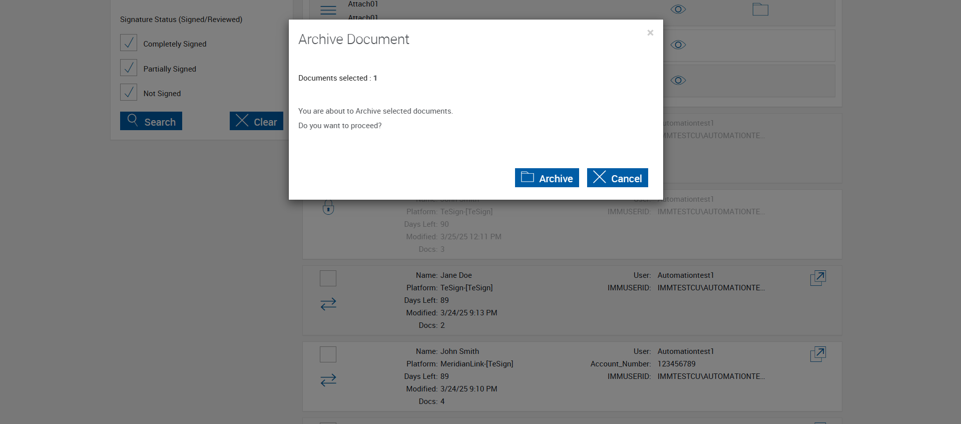 ({Tenant_URL=, EditFullName=, Email=, Platform=, IsPlusFI=FALSE, ShortName=, PartyName=, PartiesToView=John Smith,Jane Smith,One Test, AttachmentName=Attach01, ReceivedFromNames=, TextField=, ArchiveOptions=Always Archive,Archive on Action,Never Archive,Archive on Action, DocumentName=005BA1,Attach01,513BA,XNAAP, Dropdownvalues=, toggleStatus=, Workflow=, AttachmentTypeOption=, NumOfAttachments=, Folderpath=, NameDescription=, Export_Values=, UserType=, Tenant_User=, Group=, Description=Verify individual archive on session details page and search active page, Message=, FileName=, EditShortName=, Phone_Number=, Step Name=, Filepath=src/main/resources/testdata/files/documentRTS/RTSSingleSignTemplate.zip, DocumentPermission=, TestID=VerifyIndividualArchiveWithDifferentArchiveOptions, FItype=, Required=, IndexSource=, Document Names=005BA1,Attach01,513BA,XNAAP,XXCA10,Attach04, Inbox=, Password=iMM@2022, Path=src/main/resources/testdata/files/documentRTS/005BA1.pdf,src/main/resources/testdata/files/documentRTS/513BA.pdf,src/main/resources/testdata/files/documentRTS/XNAAP.pdf,src/main/resources/testdata/files/documentRTS/XXCA10.pdf, Tenant_Password=, UserName=, Comments=, Email_Id=, Index_Field_Name=, Sender_Email_Id=, FI_ID=autotestfi, Vendor=, From=, TemplatePermission=, Subject=, Date=, Response=, Type=, AttachmentPath=src/main/resources/testdata/files/Attachments/Delic.pdf,src/main/resources/testdata/files/Attachments/paystub.pdf,src/main/resources/testdata/files/Attachments/UtilityBillPRIMARY1.pdf,src/main/resources/testdata/files/Attachments/Vehicletitle.pdf, Username=cuadmin@immtestcu.onmicrosoft.com,automationtest1@immtestcu.onmicrosoft.com, FullName=005BA1,513BA,XNAAP,XXCA10, EditNameDescription=, ErrorMessage=, Export_Fields=})