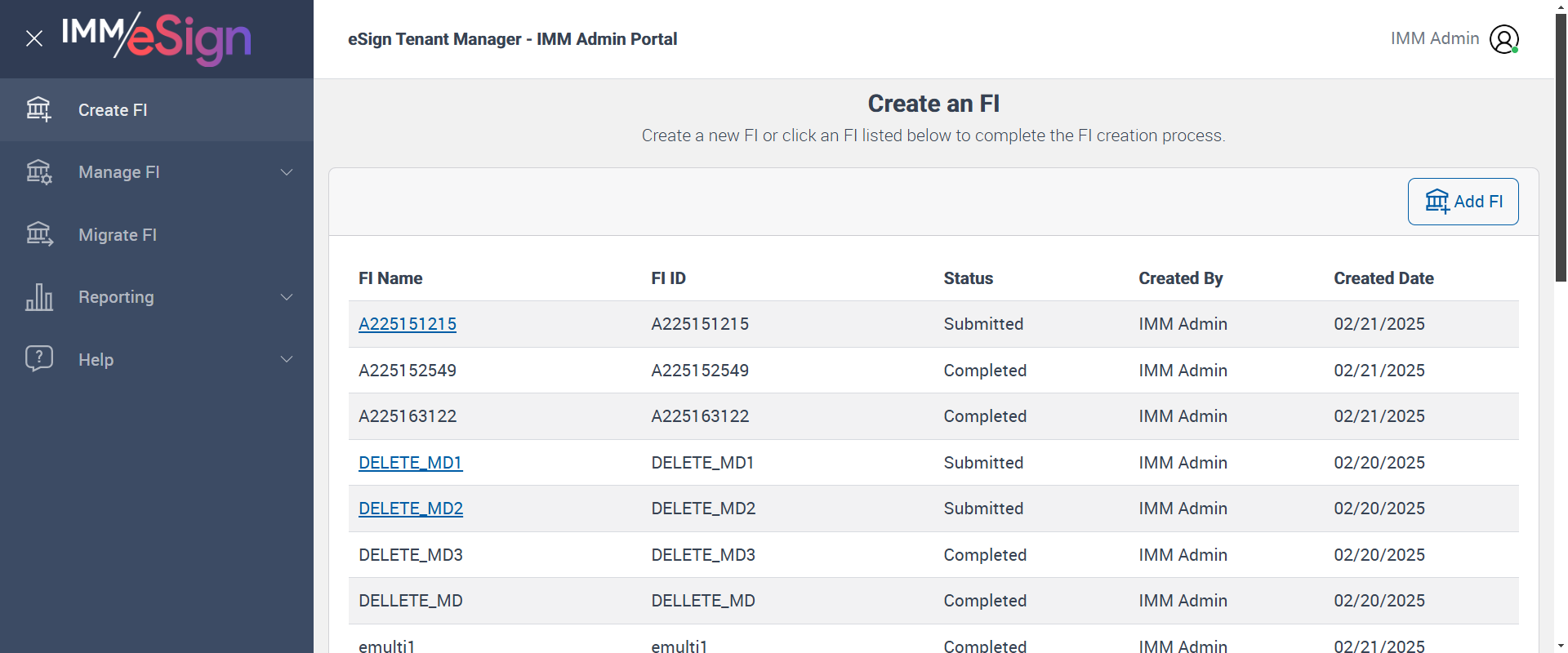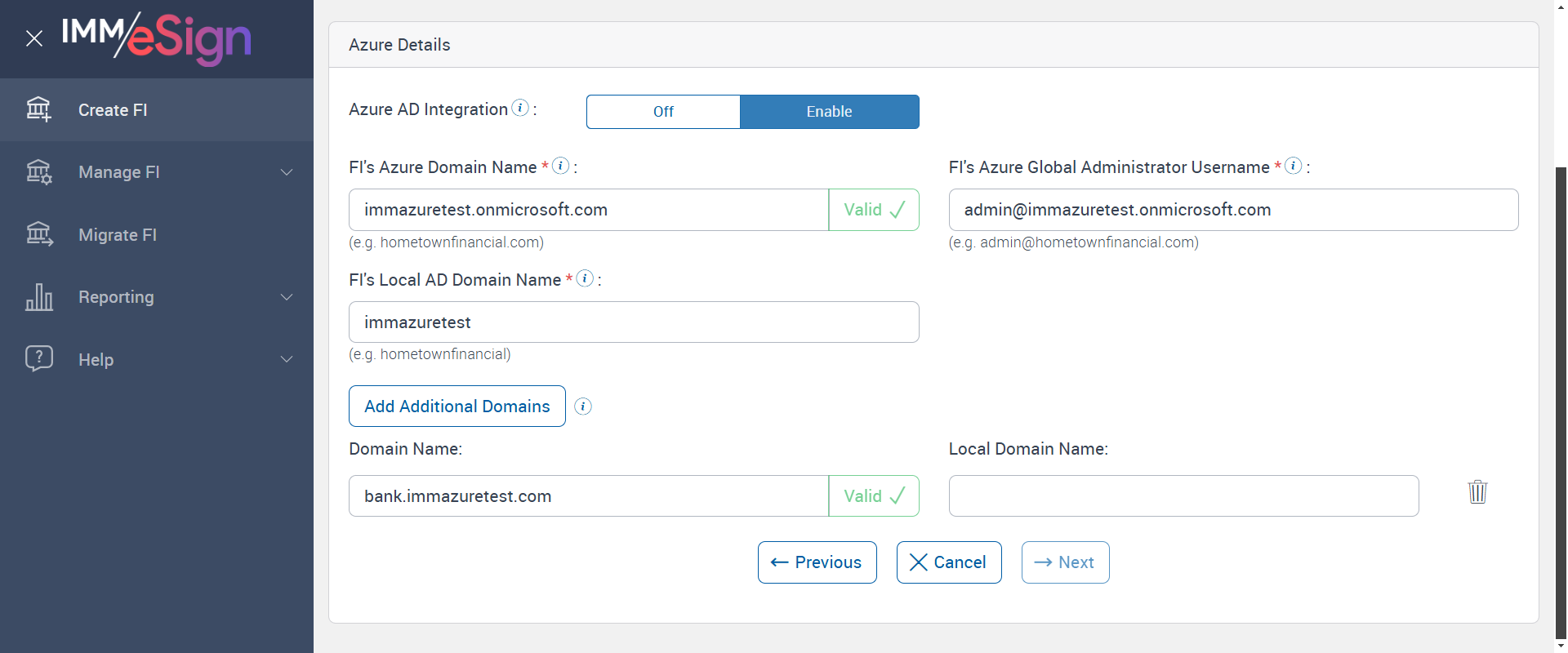 | com.imm.testscripts.FIManagement.FIManagement | verifyMultiDomainTMCreateFIAzureDetailsandEsignUsersLogin: Create new FI, While create FI verify Azure details tab UI for multi domain and add multiple Additional domain. After that verify user can login with different additional domains and check user will add in correct group also check correct domain name display. | 1740555154530 | 242417 |