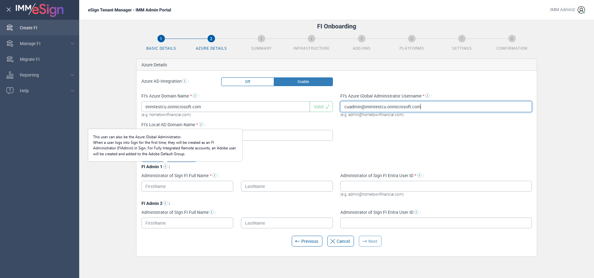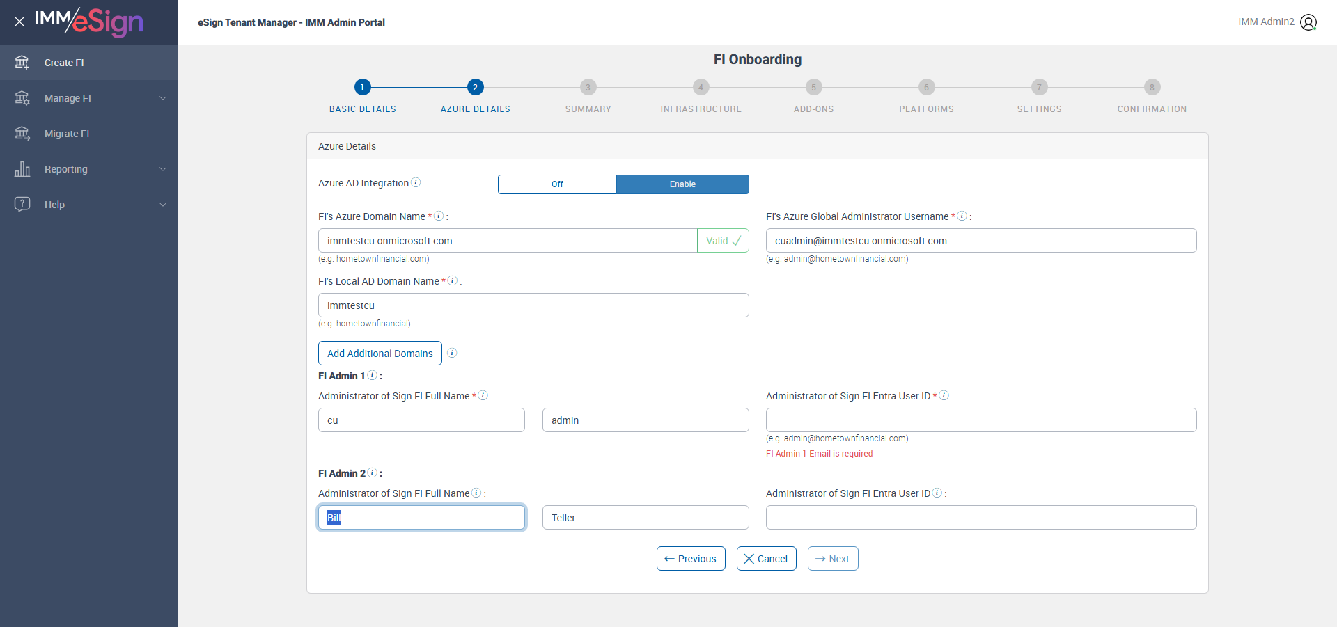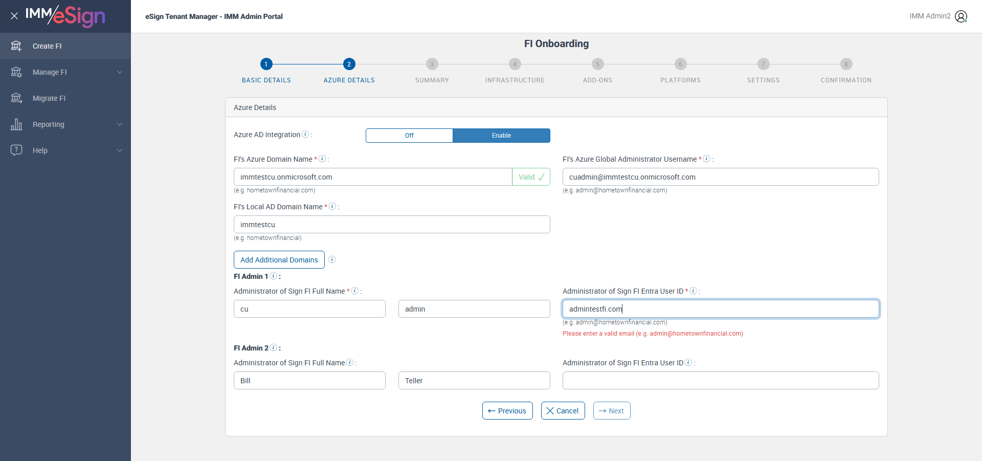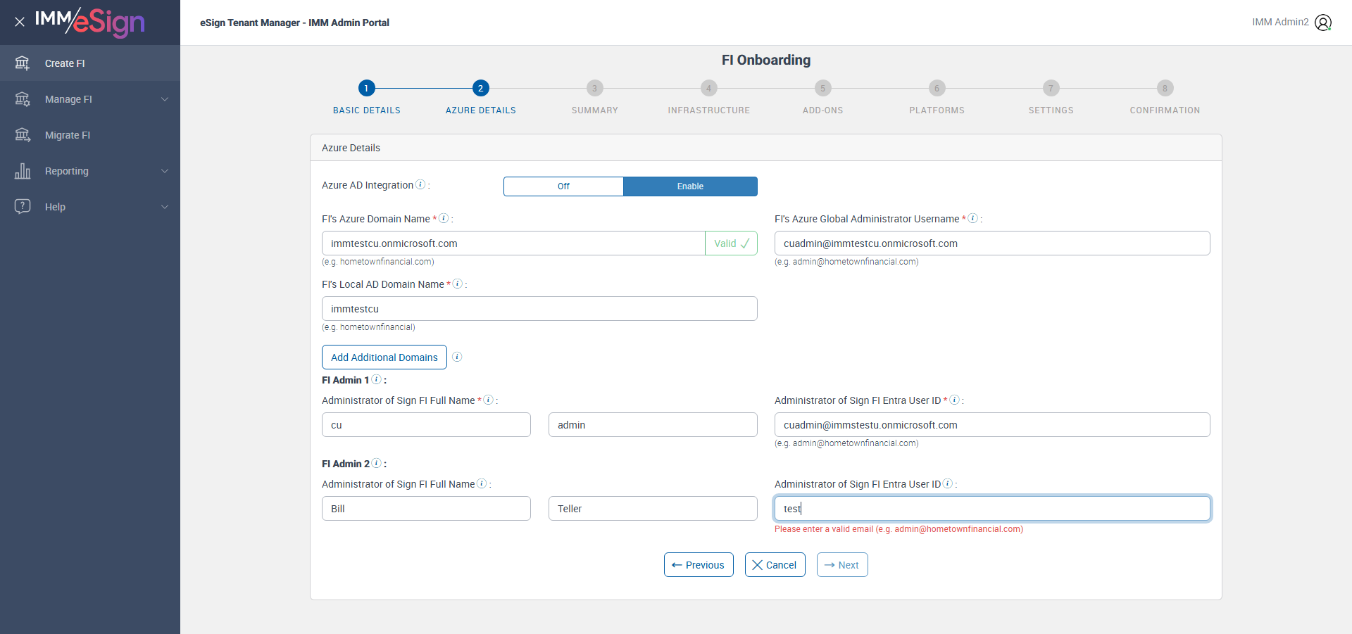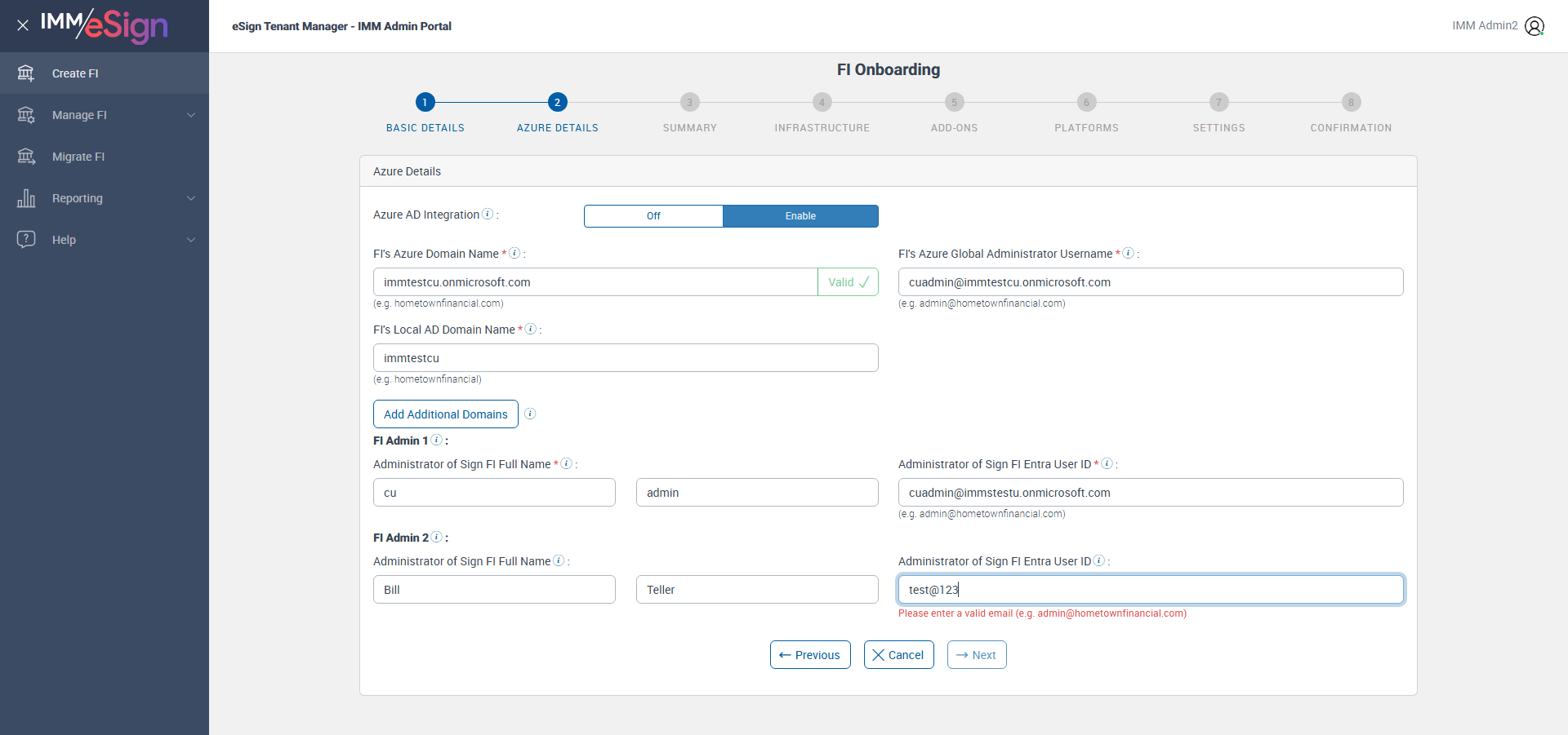 ({ZIP=, Login_User_ID=immadmin2@immesignqa.onmicrosoft.com, RemoteSettings=, FiStatus=Completed, AdobeKey=, FiAdmin_LastName=admin,Teller, Name=AD, LocalDomain=immtestcu, eSignPlus=Off, RtmAuthTypes=InPerson,Email,Password,KBA,Phone,GovernmentID,, IntegrationType=, RemoteSign=off, DrpSpot=Off, AZDomain=immtestcu.onmicrosoft.com, VerifastEDays=, City=, WrongAZDomain=, LCEvalDays=, State=, LoanCoupon=Off, Login_Password=iMM@2024, Country=, ClientID=3AAABLblqZhCQLd3zpFZKjJbAHz9Iltx9H66PUQv34Itep5CnjFb_Ehcl4GOj6Tx0Y5dNSNcgnfoFtmjwvBuopeEtD4QtE_yU, FIID=AD, Key=, FiAdmin_FirstName=cu,Bill, Dictionary=TeSign;XPLN, Sign_RmtAgree_NotChecked=, StarterEvalDays=, Description=Verify all Azure Details page validations for Adobe OEM, StarterChecks=Off, eSignURL=https://esignplusqa.immesign.com/TEAASP/Login.aspx, E-Vault=Off, Filepath=, TestID=AllValidationforFiAdmin1AndFiAdmin2, FiAdmin_UserID=test;test@123;admintestfi.com;cuadmin@immstestu.onmicrosoft.com, Verifast=Off, LacerPro=off, Notes=, Session URL=https://esignnonprod.immesign.com/qa/tenantmanager/, GlobalAdmin=cuadmin@immtestcu.onmicrosoft.com, TypeOfUser=IMM Admin2, eValultDays=, ErrorMsg=, Address2=, Address3=, Address1=, Sign_Password=, WrongFIID=, DrpEvalDays=, Sign_RmtAgree_checked=})