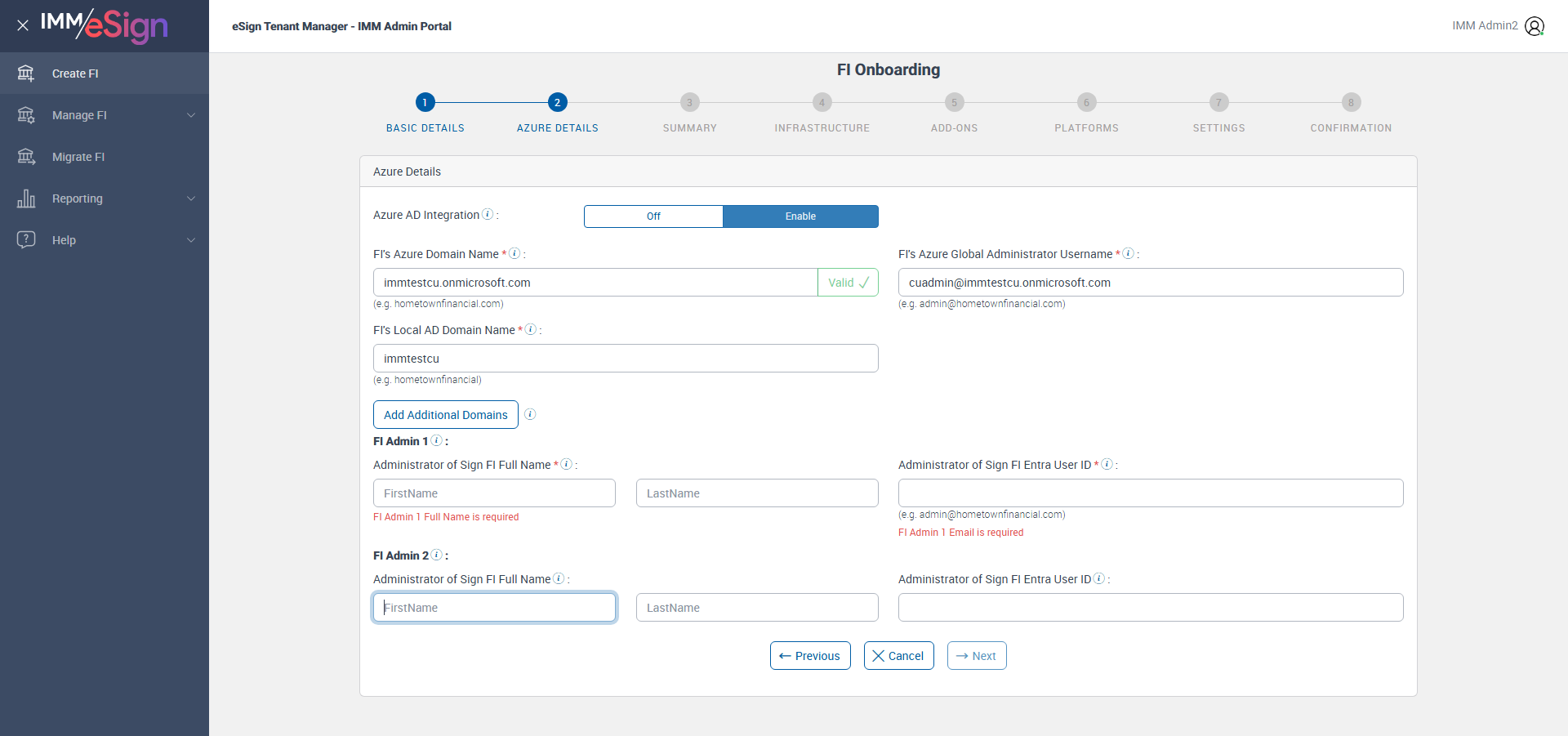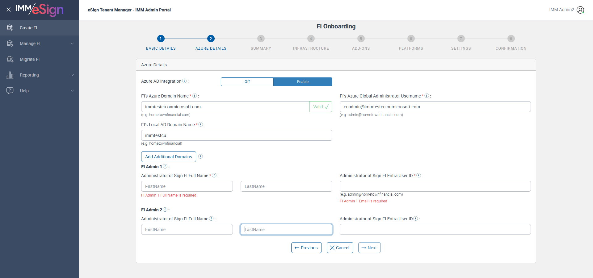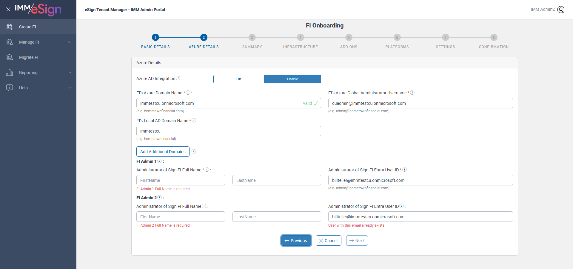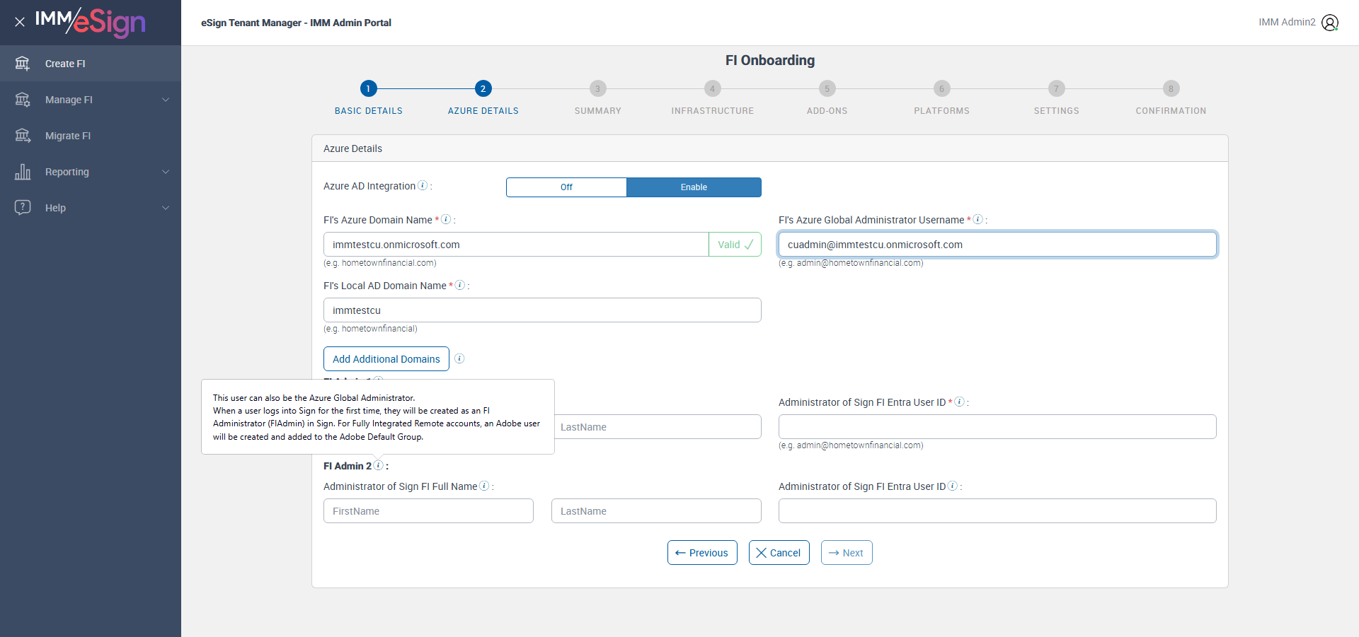 ({ZIP=, Login_User_ID=immadmin2@immesignqa.onmicrosoft.com, RemoteSettings=, FiStatus=Completed, AdobeKey=, FiAdmin_LastName=admin,Teller, Name=AD, LocalDomain=immtestcu, eSignPlus=Off, RtmAuthTypes=InPerson,Email,Password,KBA,Phone,GovernmentID,, IntegrationType=, RemoteSign=off, DrpSpot=Off, AZDomain=immtestcu.onmicrosoft.com, VerifastEDays=, City=, WrongAZDomain=, LCEvalDays=, State=, LoanCoupon=Off, Login_Password=iMM@2024, Country=, ClientID=3AAABLblqZhCQLd3zpFZKjJbAHz9Iltx9H66PUQv34Itep5CnjFb_Ehcl4GOj6Tx0Y5dNSNcgnfoFtmjwvBuopeEtD4QtE_yU, FIID=AD, Key=, FiAdmin_FirstName=cu,Bill, Dictionary=TeSign;XPLN, Sign_RmtAgree_NotChecked=, StarterEvalDays=, Description=Verify all Azure Details page validations for Adobe OEM, StarterChecks=Off, eSignURL=https://esignplusqa.immesign.com/TEAASP/Login.aspx, E-Vault=Off, Filepath=, TestID=AllValidationforFiAdmin1AndFiAdmin2, FiAdmin_UserID=test;test@123;admintestfi.com;cuadmin@immstestu.onmicrosoft.com, Verifast=Off, LacerPro=off, Notes=, Session URL=https://esignnonprod.immesign.com/qa/tenantmanager/, GlobalAdmin=cuadmin@immtestcu.onmicrosoft.com, TypeOfUser=IMM Admin2, eValultDays=, ErrorMsg=, Address2=, Address3=, Address1=, Sign_Password=, WrongFIID=, DrpEvalDays=, Sign_RmtAgree_checked=})