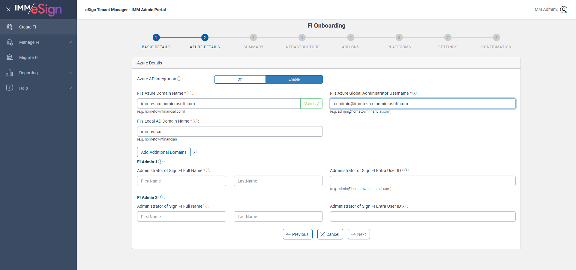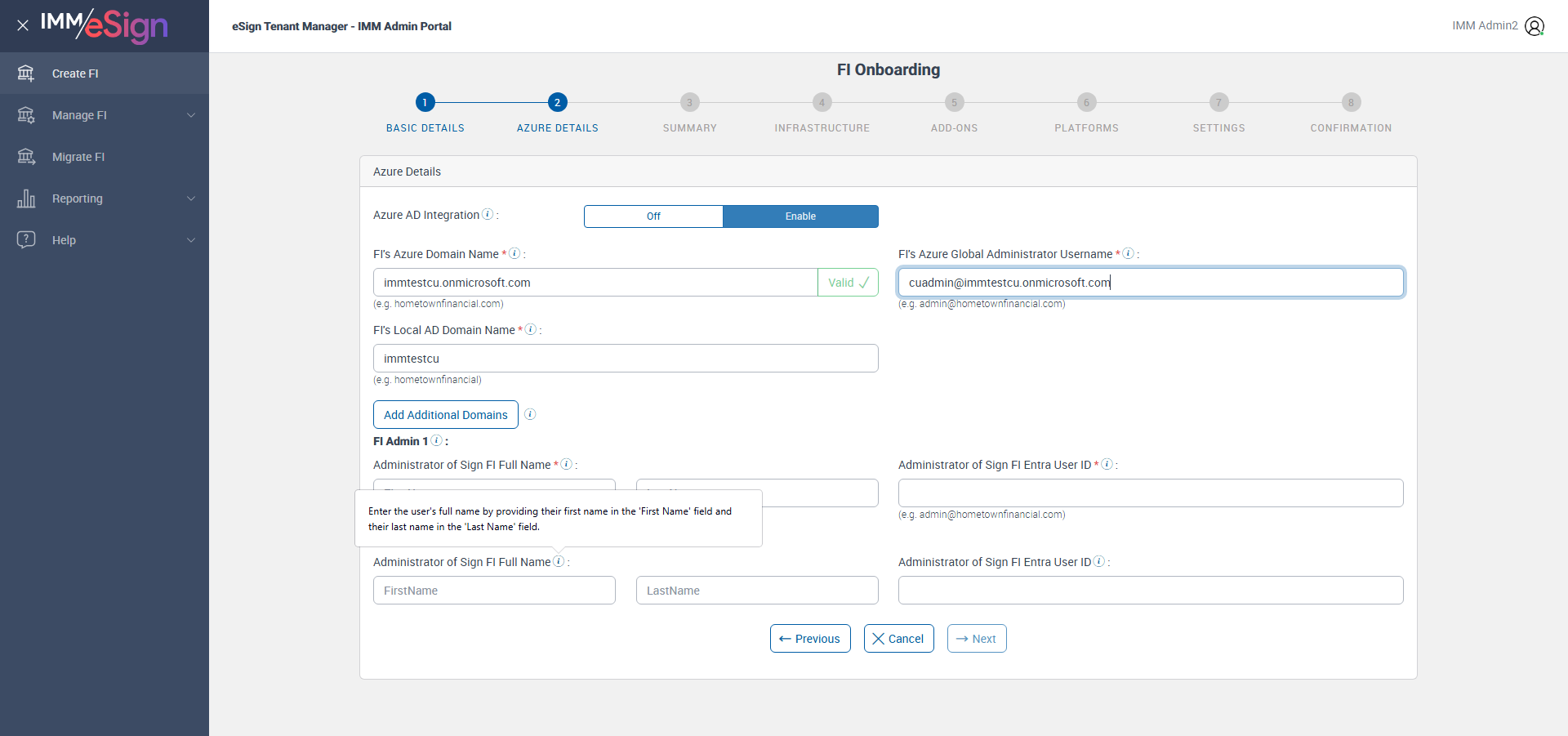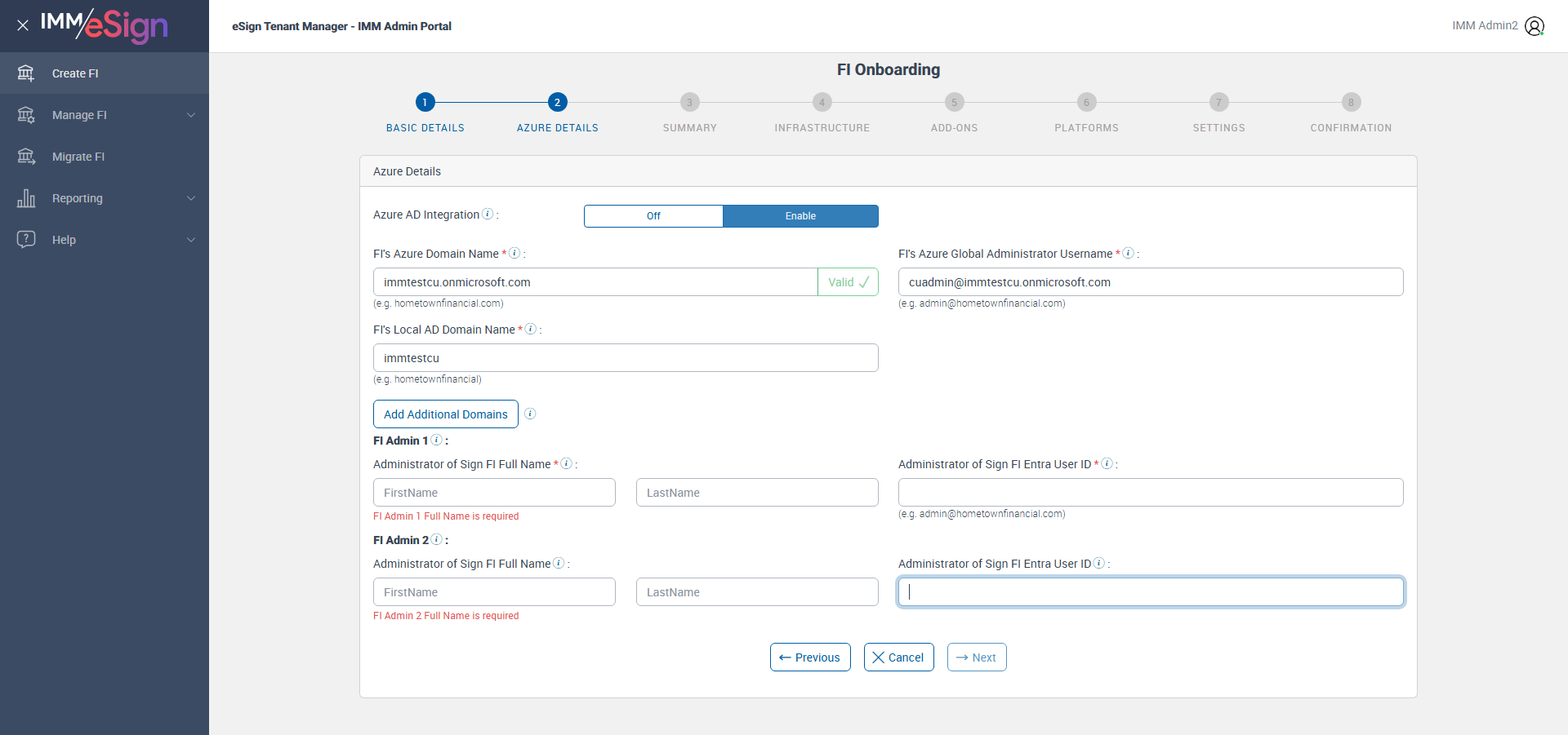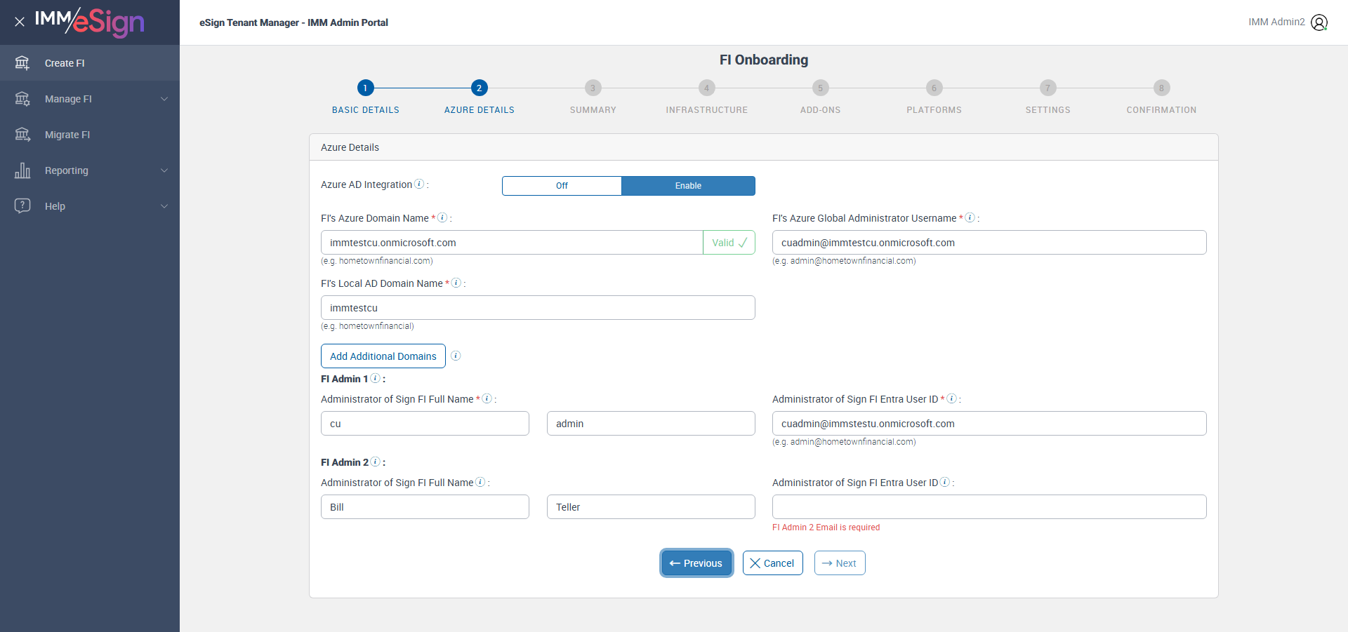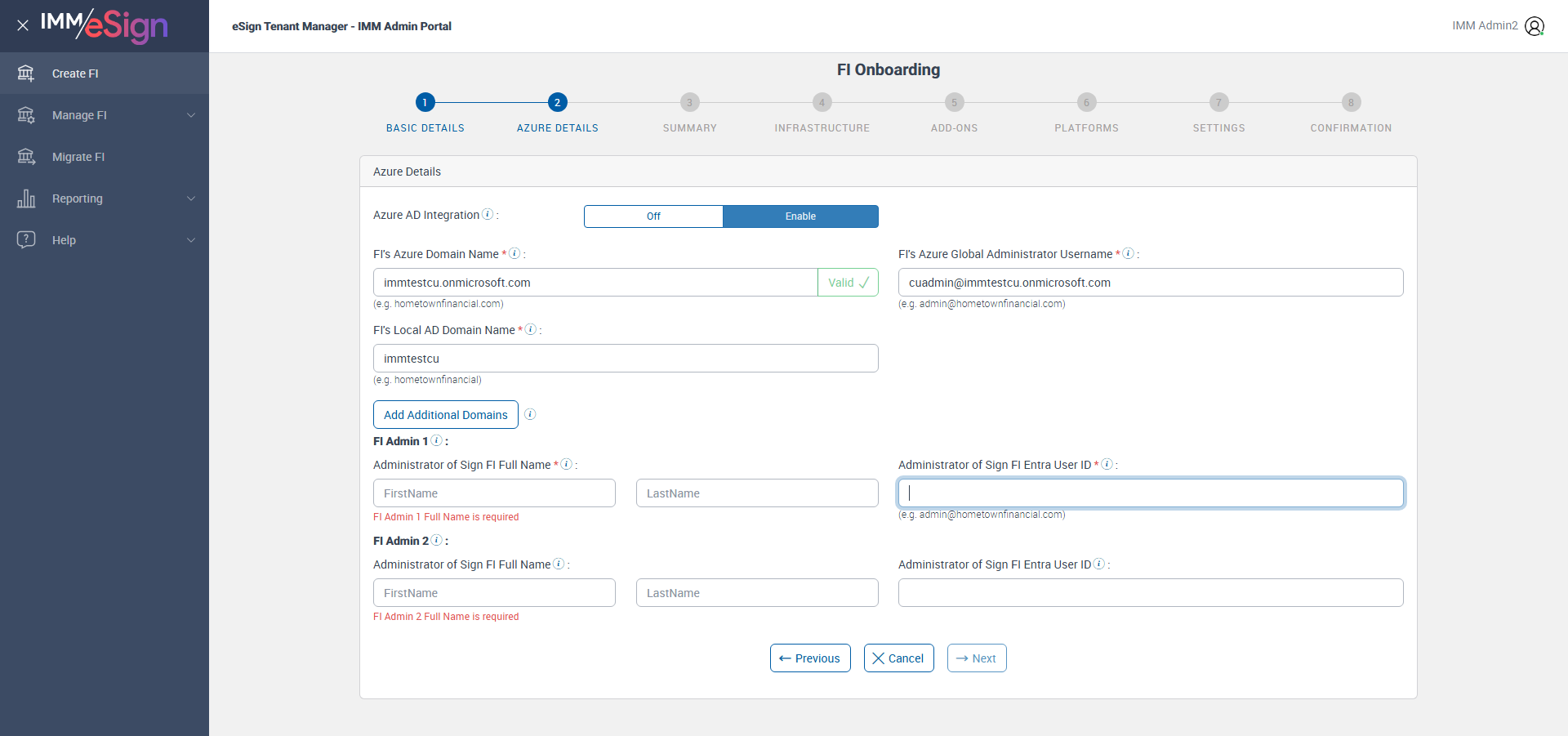 ({ZIP=, Login_User_ID=immadmin2@immesignqa.onmicrosoft.com, RemoteSettings=, FiStatus=Completed, AdobeKey=, FiAdmin_LastName=admin,Teller, Name=AD, LocalDomain=immtestcu, eSignPlus=Off, RtmAuthTypes=InPerson,Email,Password,KBA,Phone,GovernmentID,, IntegrationType=, RemoteSign=off, DrpSpot=Off, AZDomain=immtestcu.onmicrosoft.com, VerifastEDays=, City=, WrongAZDomain=, LCEvalDays=, State=, LoanCoupon=Off, Login_Password=iMM@2024, Country=, ClientID=3AAABLblqZhCQLd3zpFZKjJbAHz9Iltx9H66PUQv34Itep5CnjFb_Ehcl4GOj6Tx0Y5dNSNcgnfoFtmjwvBuopeEtD4QtE_yU, FIID=AD, Key=, FiAdmin_FirstName=cu,Bill, Dictionary=TeSign;XPLN, Sign_RmtAgree_NotChecked=, StarterEvalDays=, Description=Verify all Azure Details page validations for Adobe OEM, StarterChecks=Off, eSignURL=https://esignplusqa.immesign.com/TEAASP/Login.aspx, E-Vault=Off, Filepath=, TestID=AllValidationforFiAdmin1AndFiAdmin2, FiAdmin_UserID=test;test@123;admintestfi.com;cuadmin@immstestu.onmicrosoft.com, Verifast=Off, LacerPro=off, Notes=, Session URL=https://esignnonprod.immesign.com/qa/tenantmanager/, GlobalAdmin=cuadmin@immtestcu.onmicrosoft.com, TypeOfUser=IMM Admin2, eValultDays=, ErrorMsg=, Address2=, Address3=, Address1=, Sign_Password=, WrongFIID=, DrpEvalDays=, Sign_RmtAgree_checked=})