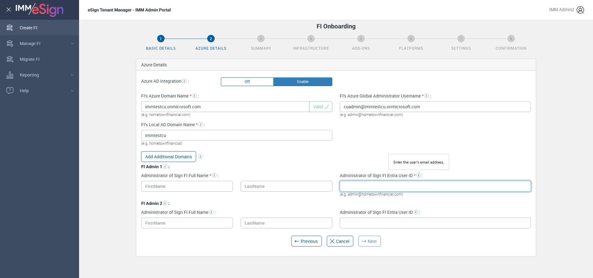 Succesfully entered email Fi Admin 1 User ID 'cuadmin@immstestu.onmicrosoft.com' [ScreenShot]