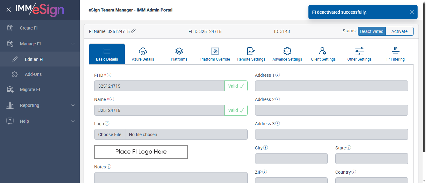 | 01:39:54 pm | Successfully validated deactivate message There are open sessions in this FI. Deactivating an FI will result in losing those sessions. Do you want to proceed? [ScreenShot] | |