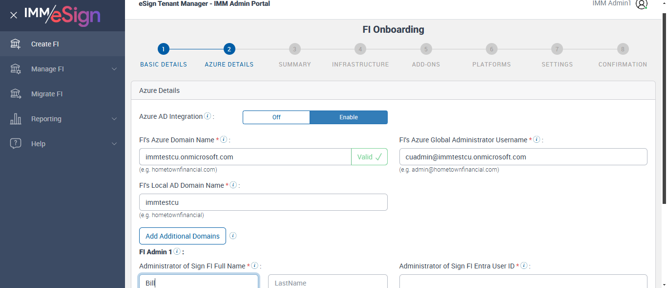 Value added in Fi Admin 1 User ID - billteller@immtestcu.onmicrosoft.com