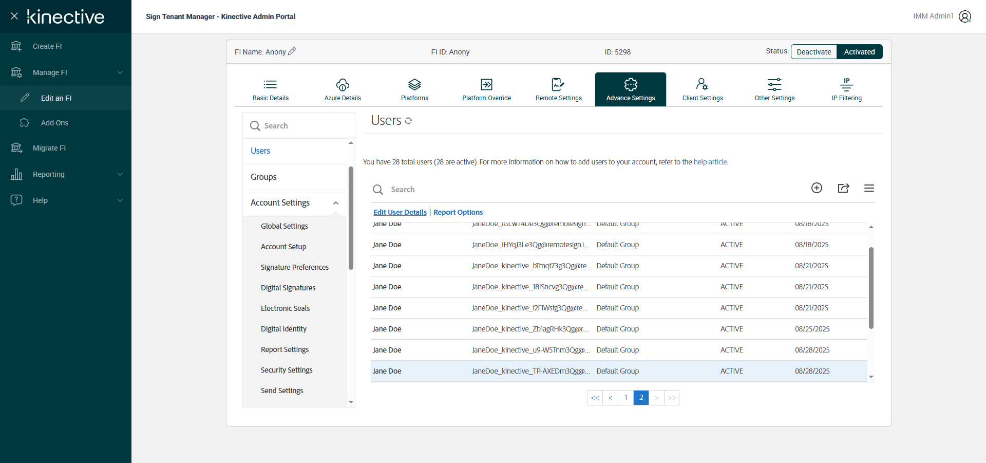 Adobe User created and email is displayed in the advanced setings Page JaneDoe_kinective_TP-AXEDm3Qg@remotesign.immesign.com [ScreenShot]