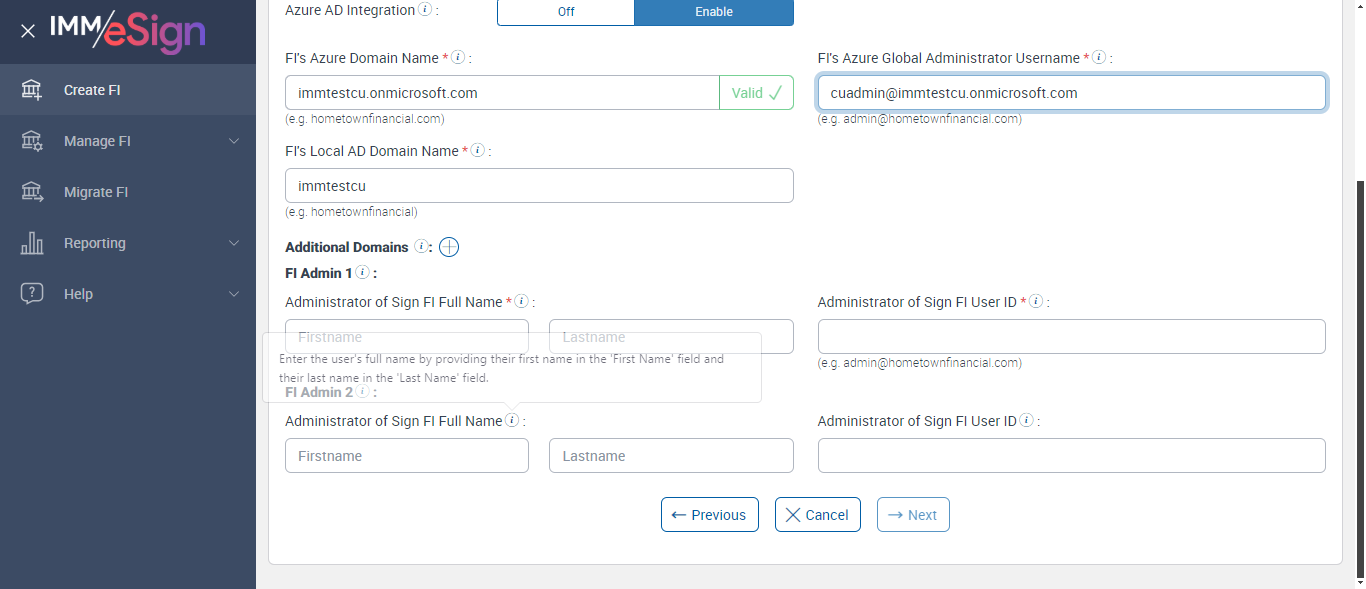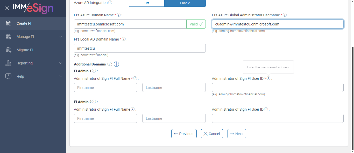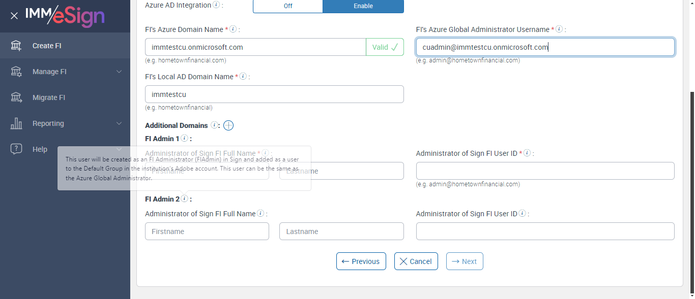 Failed to verify Fi Admin1 tool tip This user will be created as an FI Administrator (FIAdmin) in Sign and added as a user to the Default Group in the institution’s Adobe account. This user can be the same as the Azure Global Administrator.[ScreenShot]