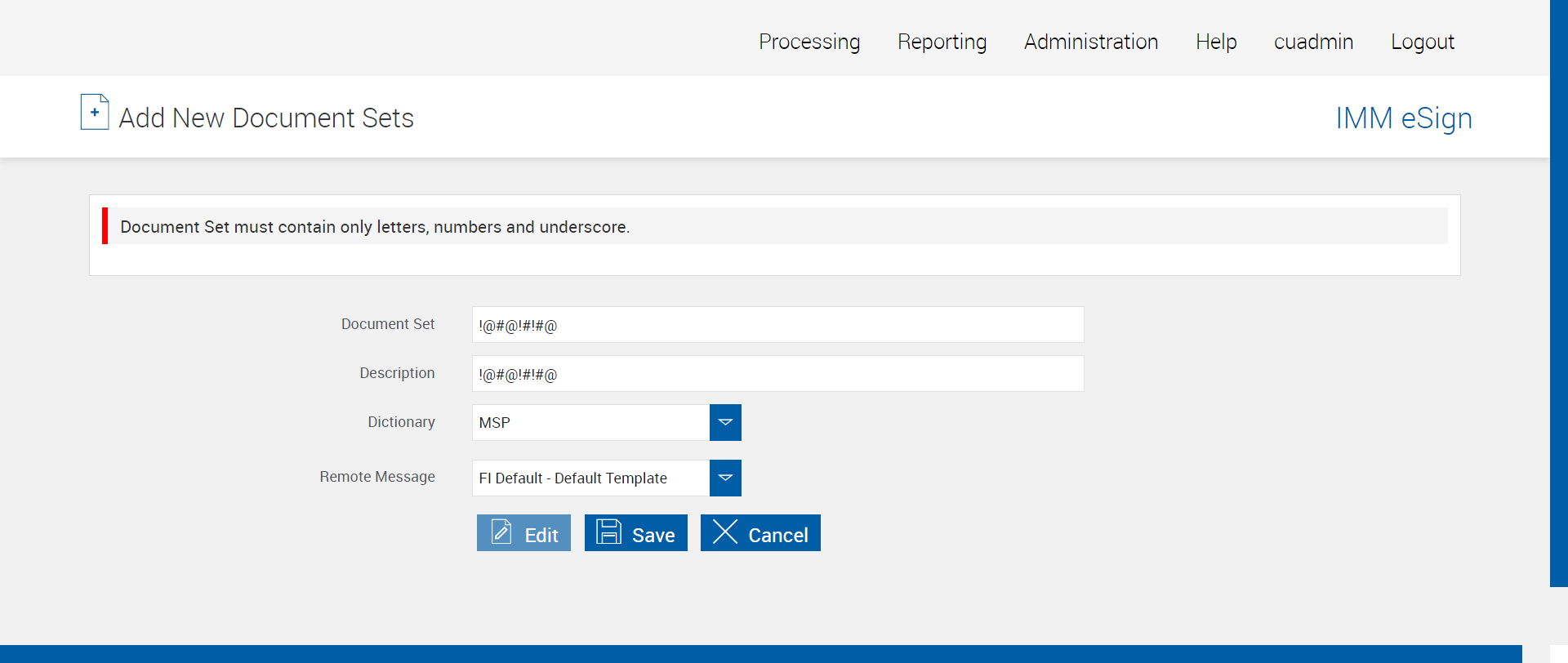 Actual(Passed): Validation message(Document Set must contain only letters numbers, and underscore) is thrown when DocSet has special characters[ScreenShot]
